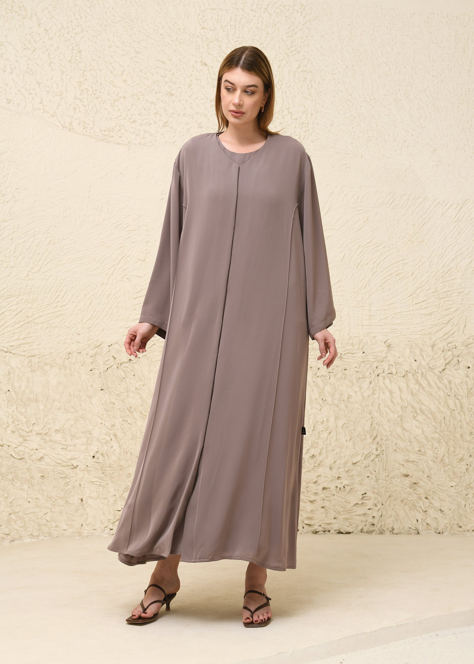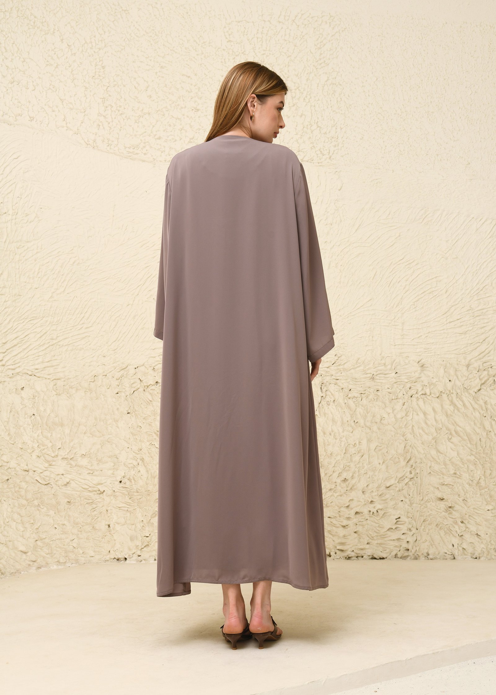 This abaya set is a celebration of subtle elegance and effortless grace, tailored from premium Nida fabric for a fluid, breathable drape. The abaya features a clean, straight-cut silhouette in a muted taupe hue, exuding understated sophistication. The design is minimal, with no visible embellishments—placing full emphasis on the soft texture and elegant fall of the fabric.The set includes a matching inner dress for layered modesty, and a coordinating taupe scarf that completes the ensemble with tonal harmony. Versatile and timeless, this look is perfect for everyday wear, spiritual gatherings, or quiet moments of self-reflection.