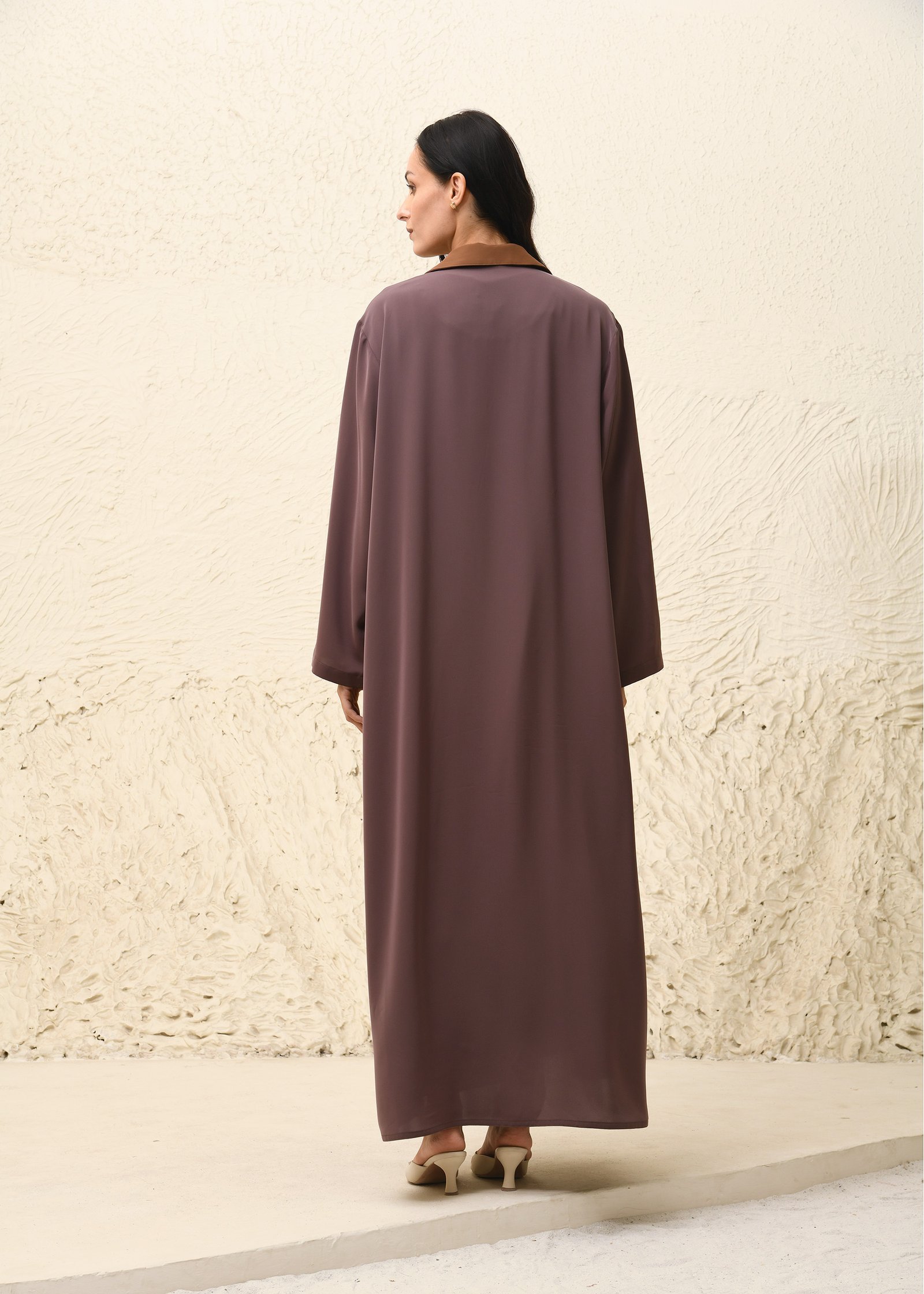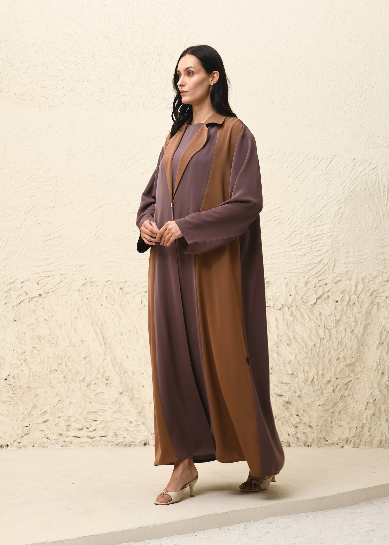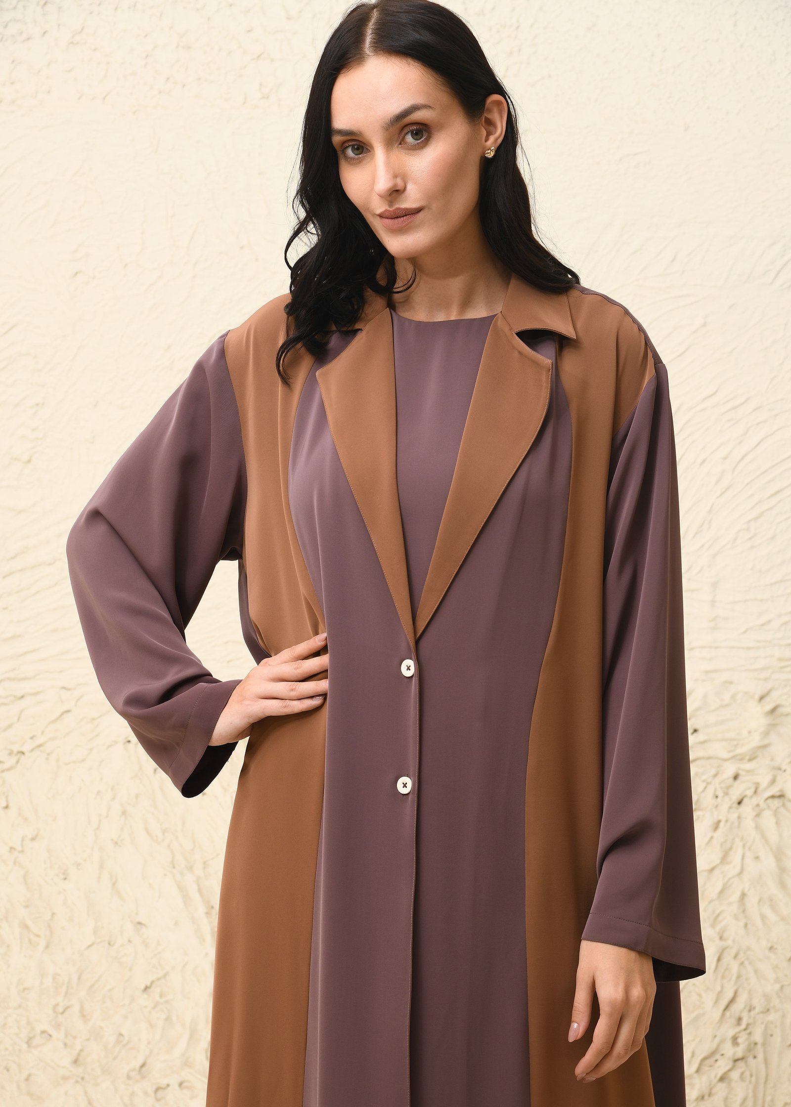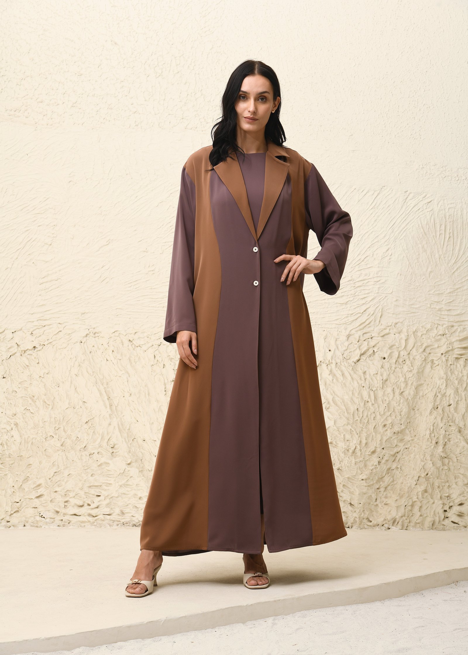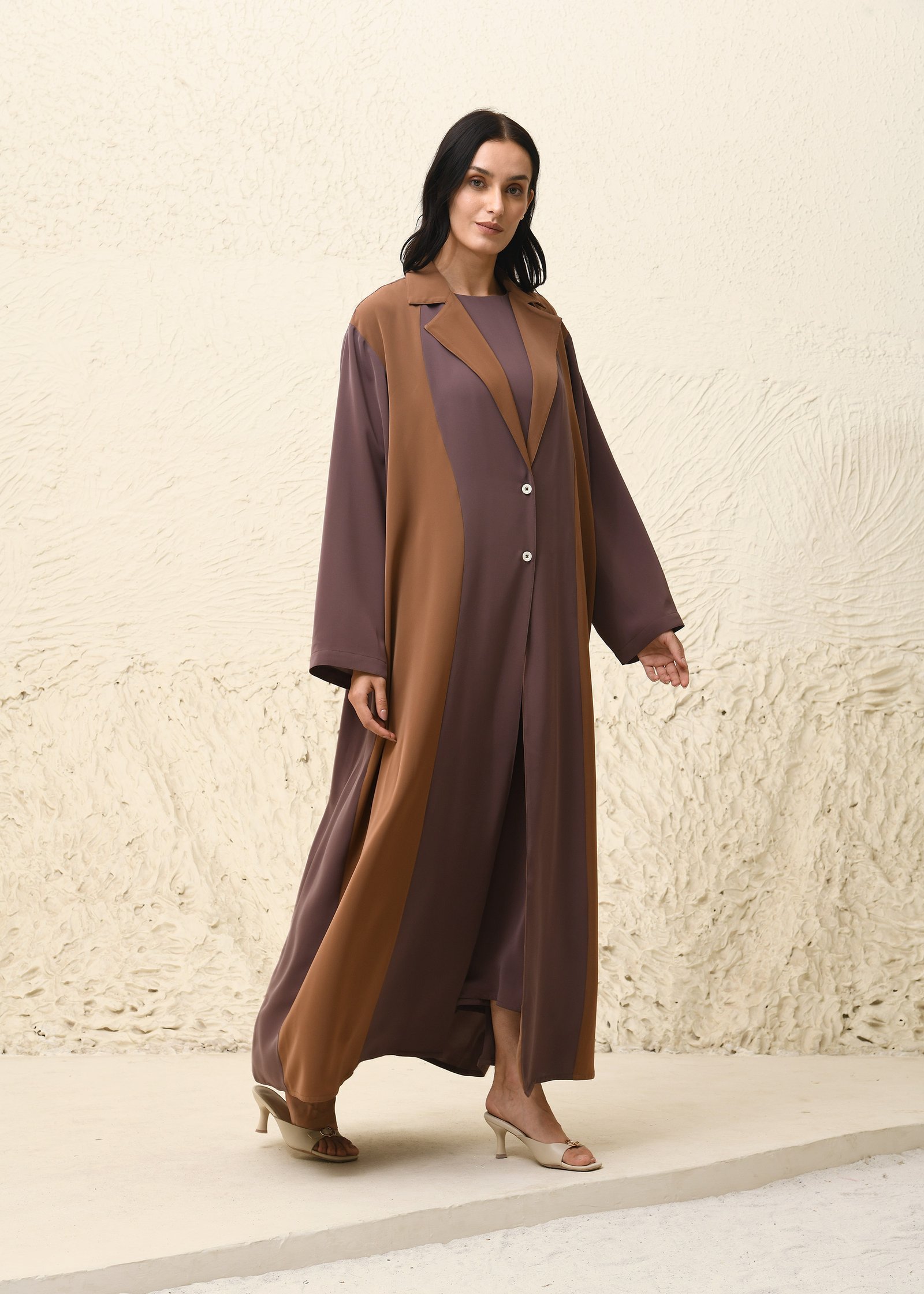 Ihtiraf Abaya This contemporary Nida fabric abaya set makes a confident style statement with its striking color-block design. The front-open abaya showcases a dual-tone palette, blending warm mocha brown with soft mauve for a rich, earthy appeal. The straight, flowing silhouette is accented with a notched collar and functional front buttons, lending a refined coat-like structure to the traditional form. The set includes a matching inner dress that seamlessly complements the abaya, ensuring modesty and comfort. A rich chocolate brown scarf finishes the look with elegance, bringing harmony to the layered tones. Perfect for both everyday sophistication and formal occasions, this ensemble fuses modern tailoring with timeless modest fashion.