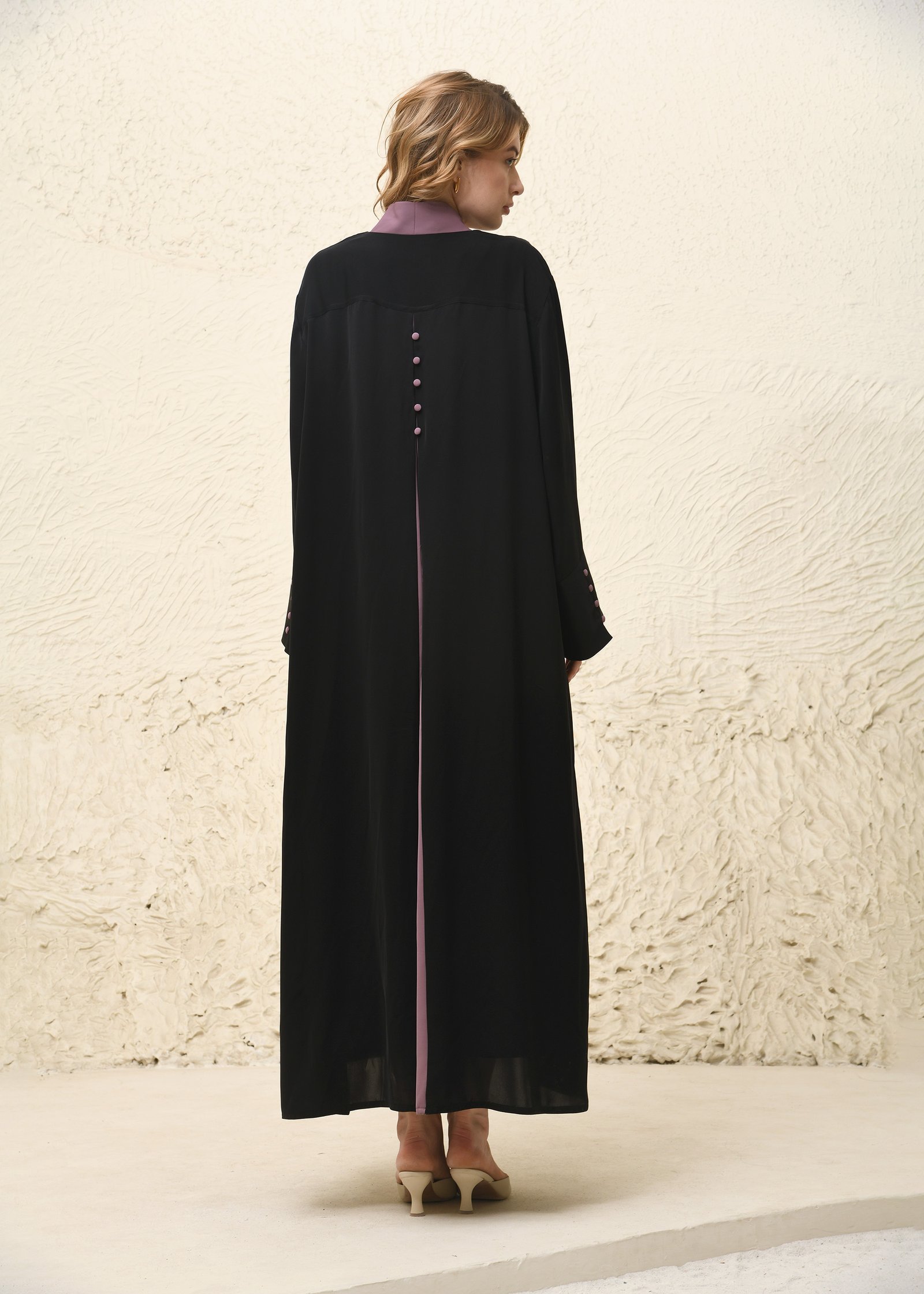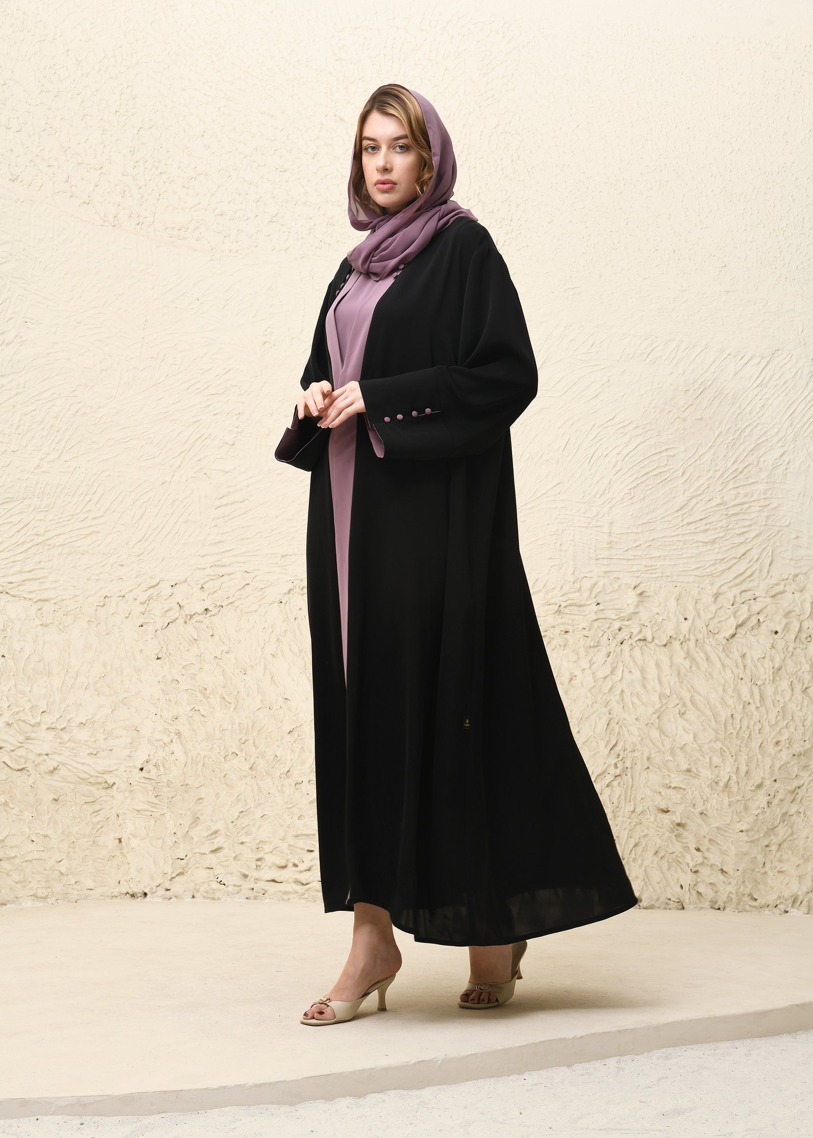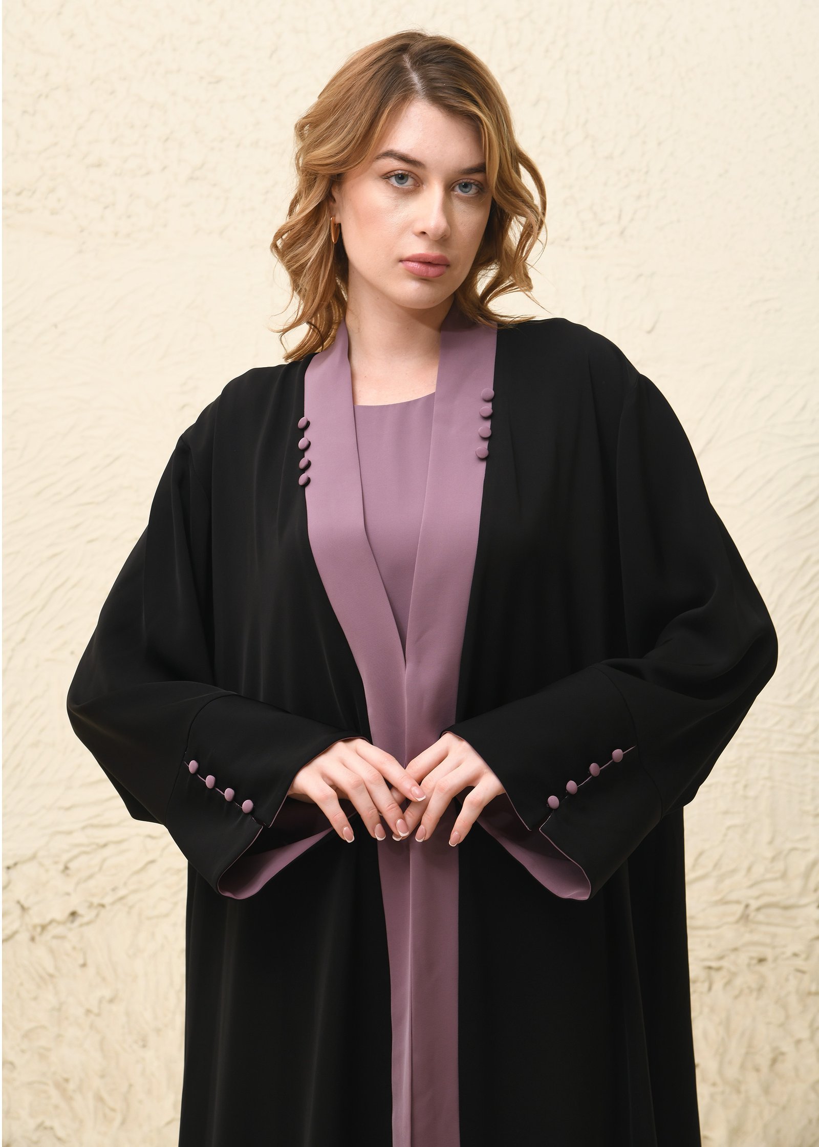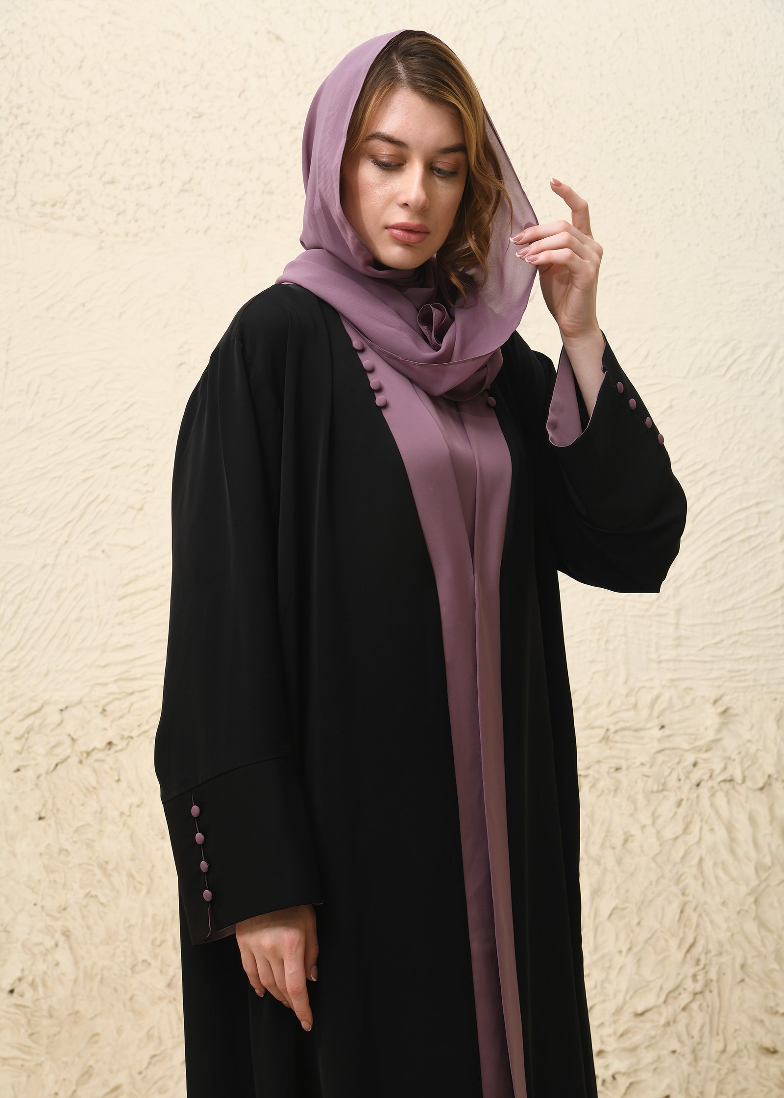 This graceful three-piece set in Nida fabric combines modest elegance with contemporary flair. The black outer abaya features a flowing silhouette with a mauve front panel that adds a striking contrast. The wide sleeves are finished with subtle mauve button detailing, giving the garment a refined and tailored feel. Beneath, a coordinated inner dress in soft mauve provides seamless layering and elevates the look with its clean lines and structured simplicity. Completing the ensemble is a matching mauve scarf that frames the face delicately, harmonizing with the inner dress and accents on the abaya.This versatile set is ideal for formal occasions, evening gatherings, or daily wear when you want to feel polished yet modest.