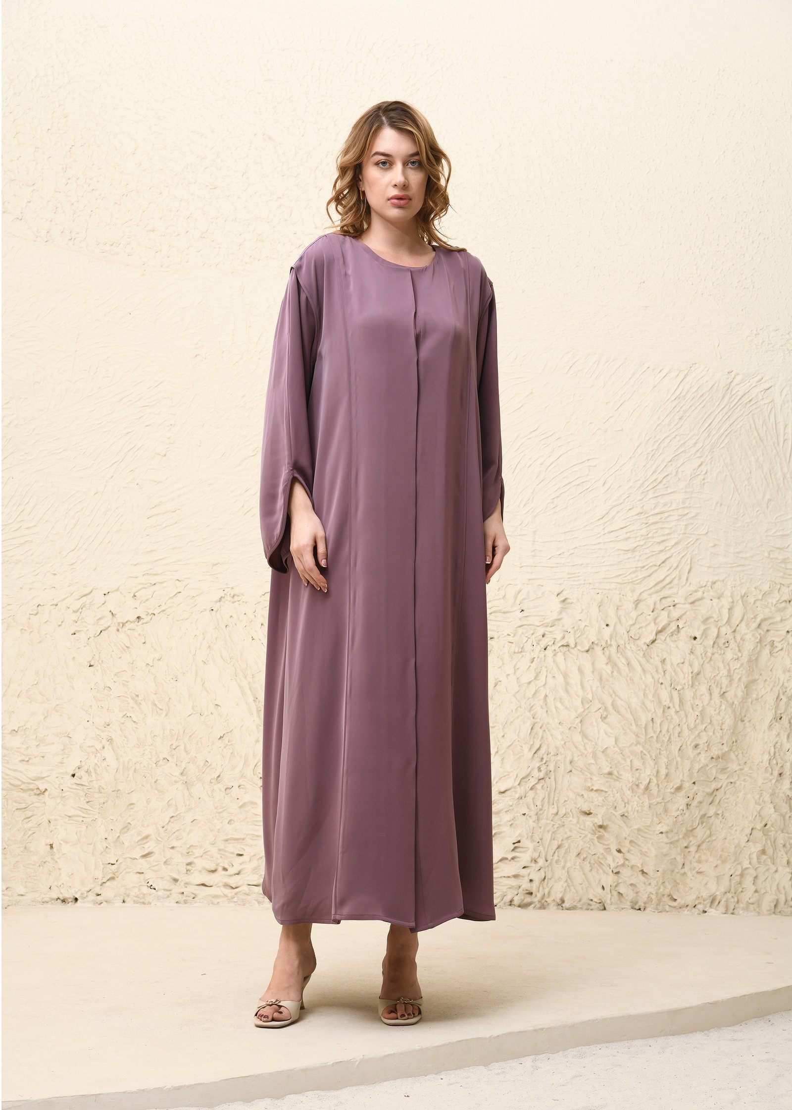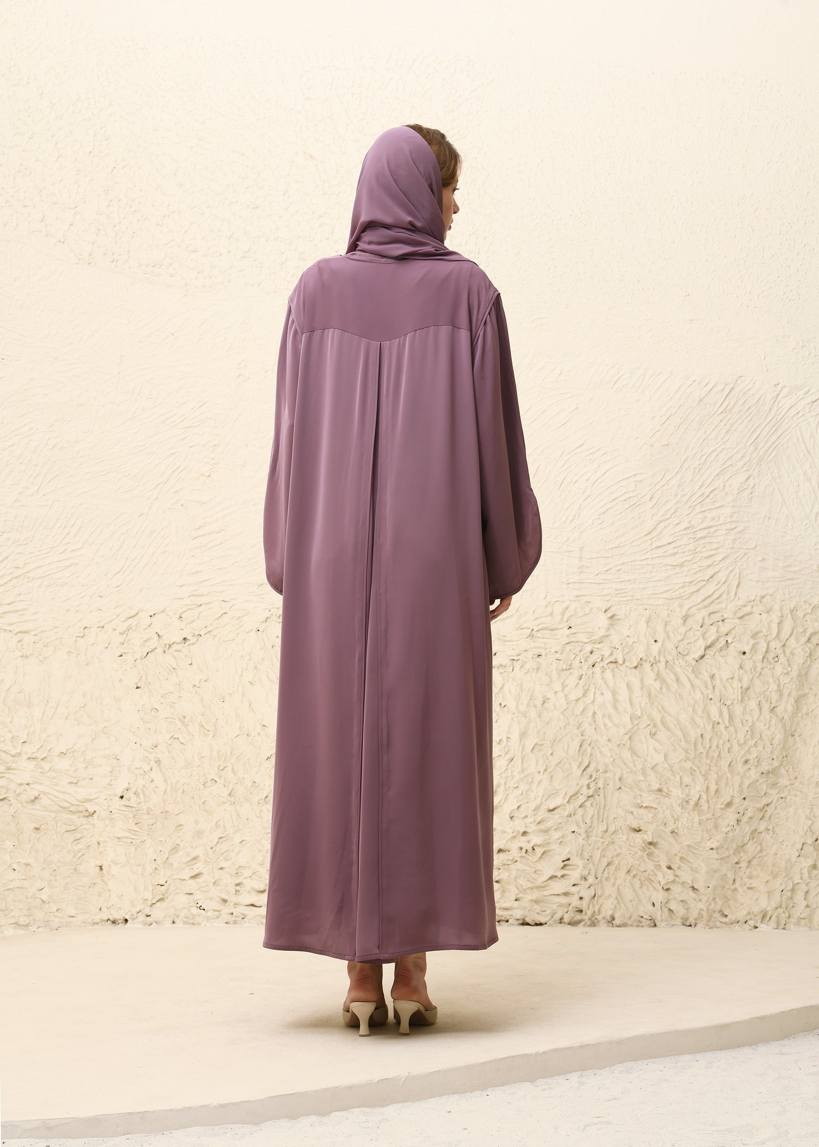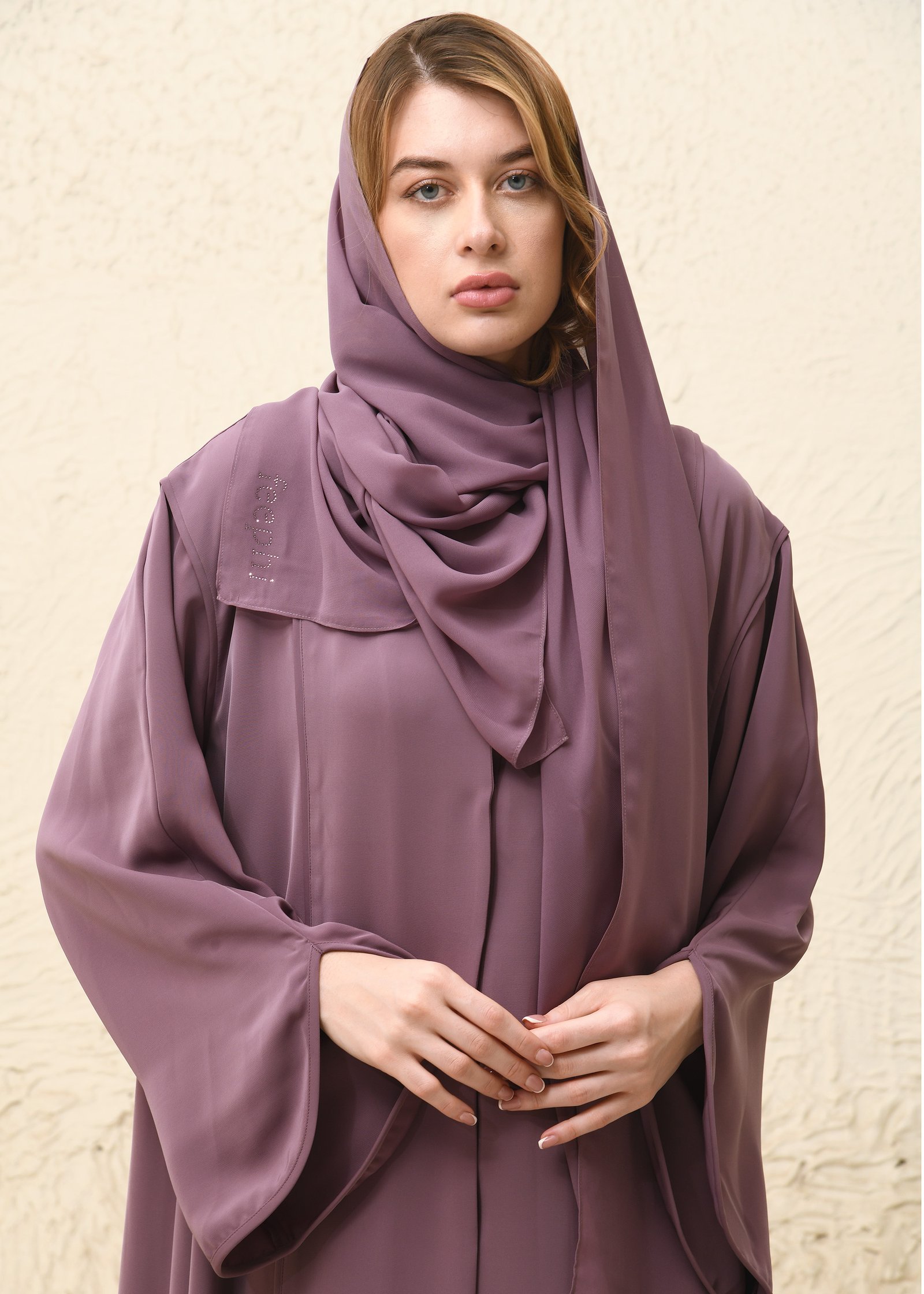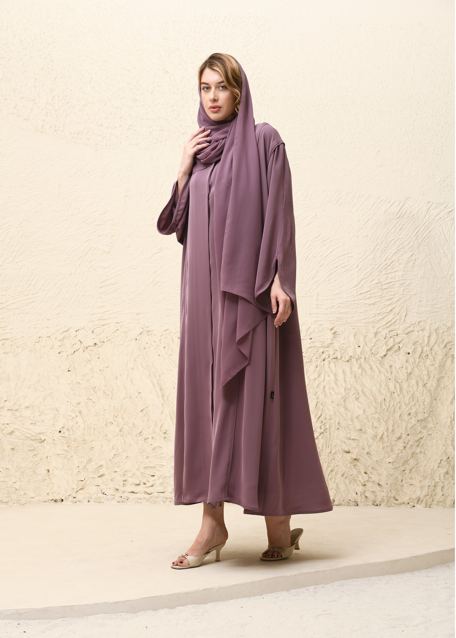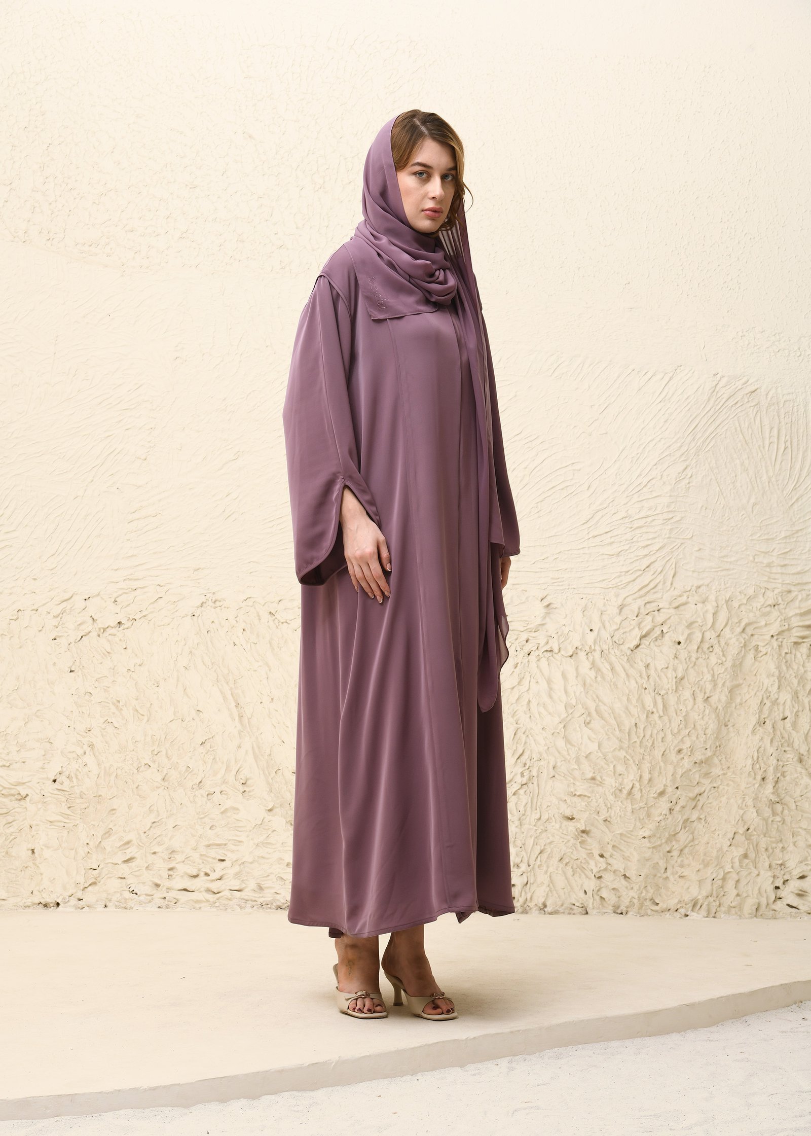 This muted mauve Nida fabric abaya set radiates gentle elegance and refined simplicity. The abaya features a clean, flowing silhouette with subtle seam detailing along the front, adding a soft structure to its relaxed form. Designed for ease and fluidity, the wide sleeves and relaxed fit ensure graceful movement and comfort throughout the day. It is perfectly paired with a matching chiffon scarf in the same warm mauve tone, creating a monochrome ensemble that feels both modern and timeless. Ideal for everyday wear or serene occasions, this set embodies effortless modesty with a graceful, feminine touch.