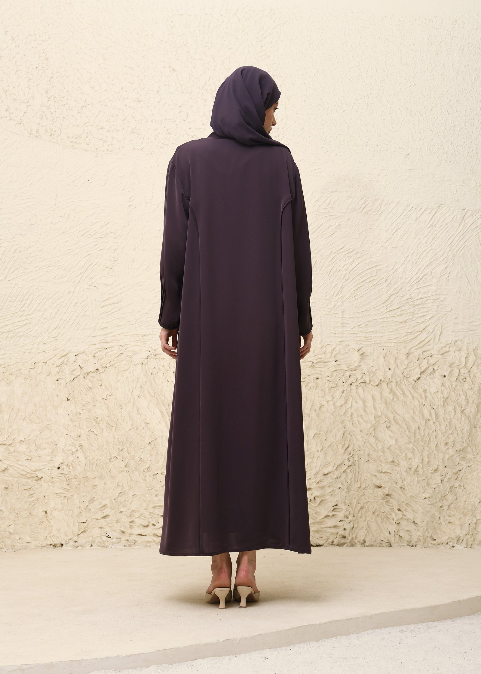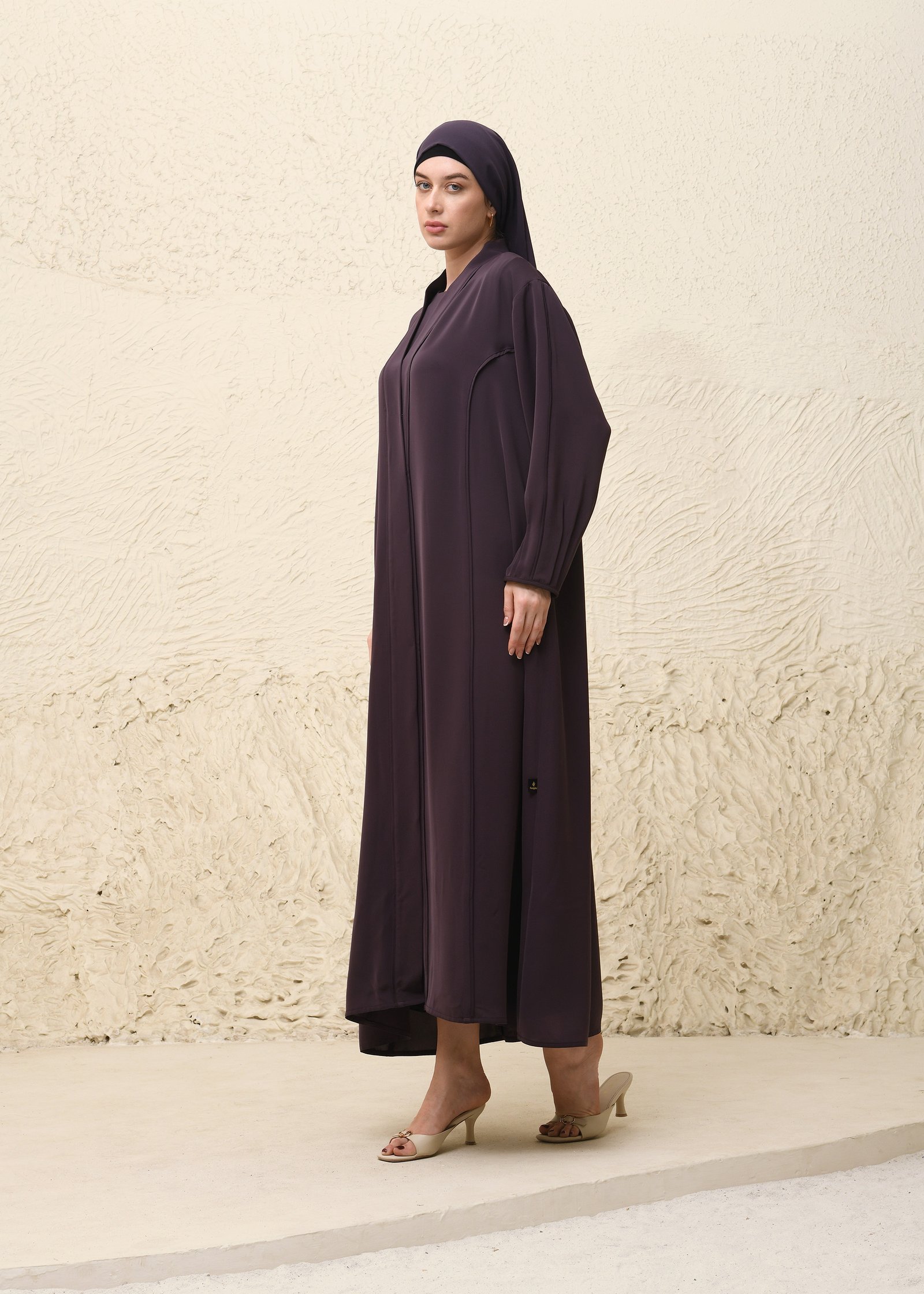 This image features a graceful three-piece Nida fabric abaya set in a rich deep plum shade. The ensemble includes a minimalist, full-length outer abaya with a flowy A-line cut and wide sleeves, a matching inner dress for added modesty, and a coordinated scarf draped simply around the head. Crafted from premium Nida, the set is soft, breathable, and elegant—perfect for modest wear with a refined, modern touch.