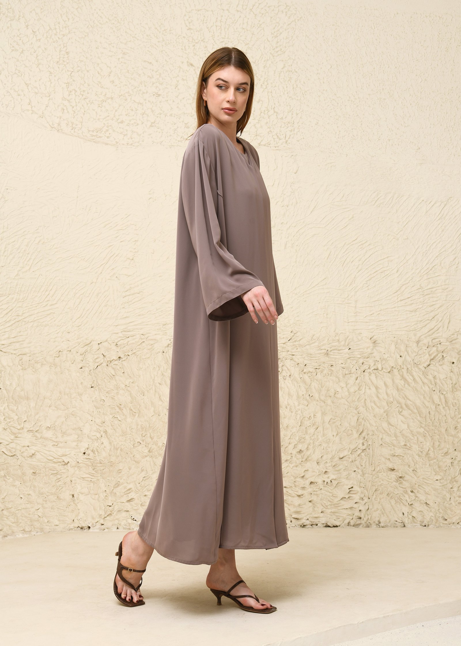 This abaya set is a celebration of subtle elegance and effortless grace, tailored from premium Nida fabric for a fluid, breathable drape. The abaya features a clean, straight-cut silhouette in a muted taupe hue, exuding understated sophistication. The design is minimal, with no visible embellishments—placing full emphasis on the soft texture and elegant fall of the fabric. The set includes a matching inner dress for layered modesty, and a coordinating taupe scarf that completes the ensemble with tonal harmony. Versatile and timeless, this look is perfect for everyday wear, spiritual gatherings, or quiet moments of self-reflection.