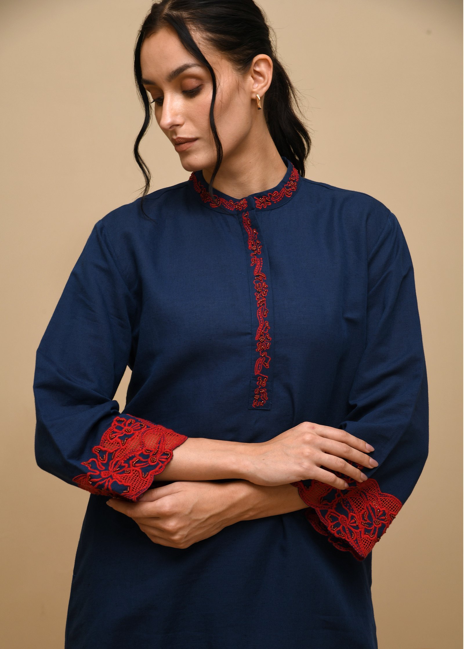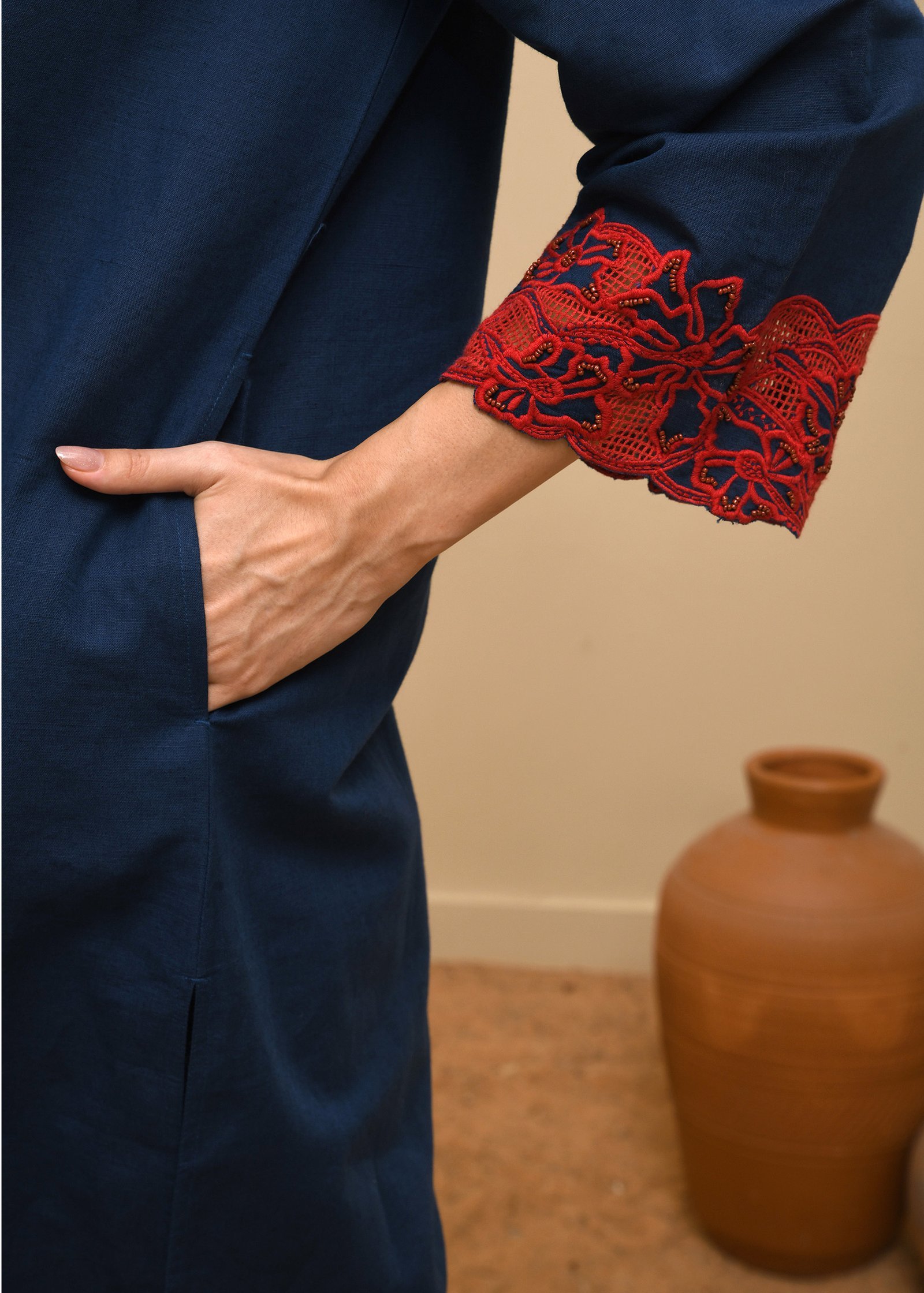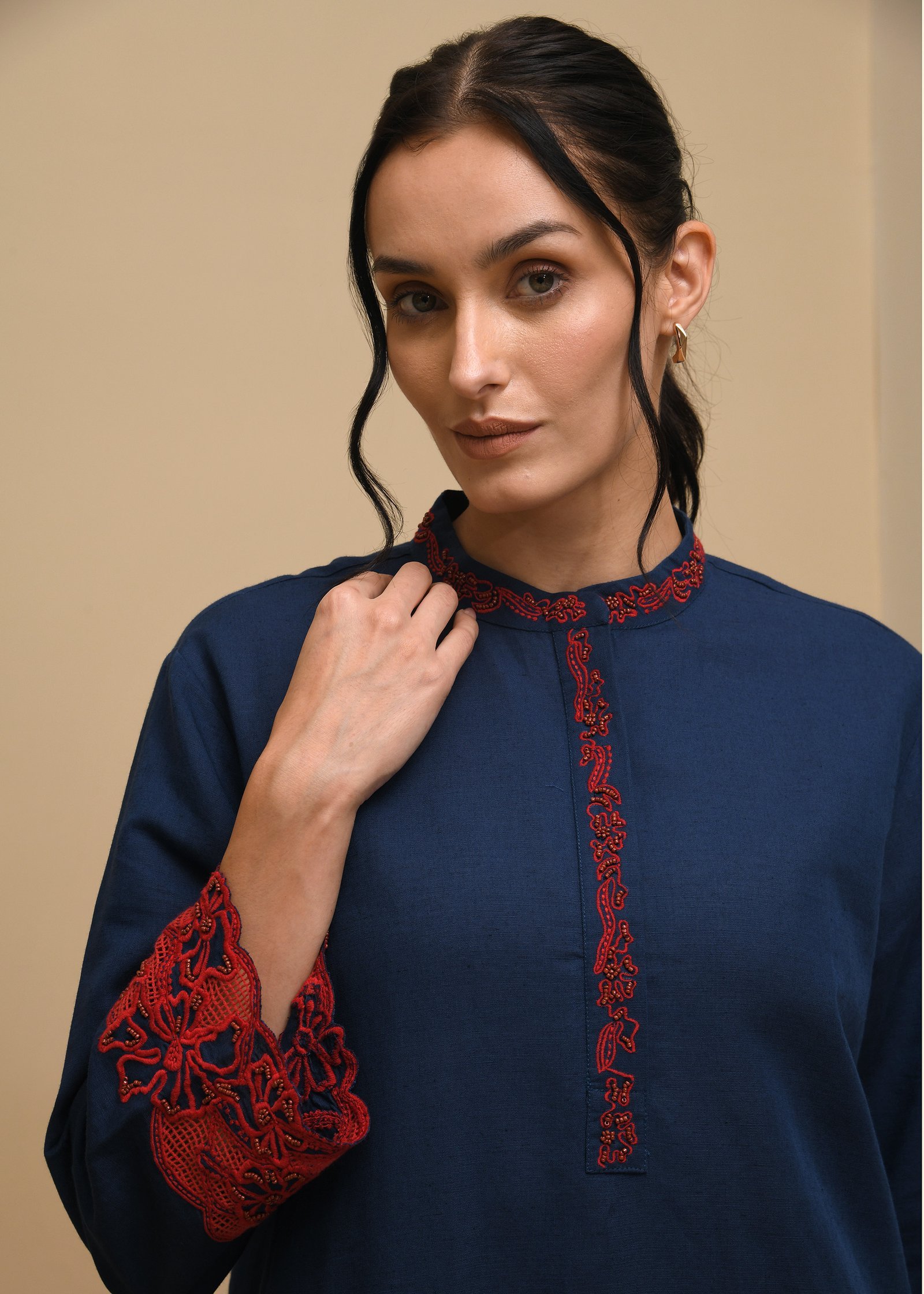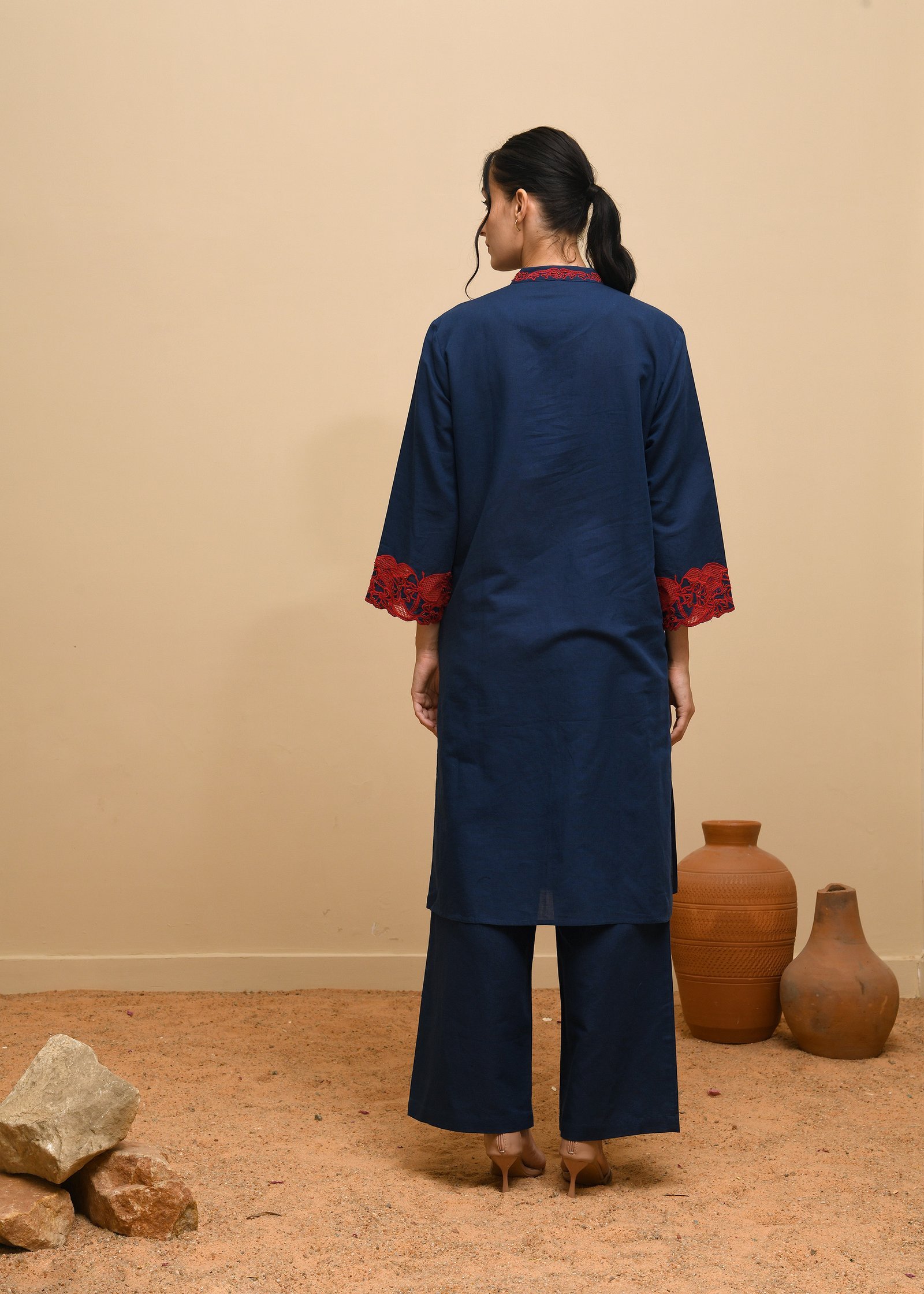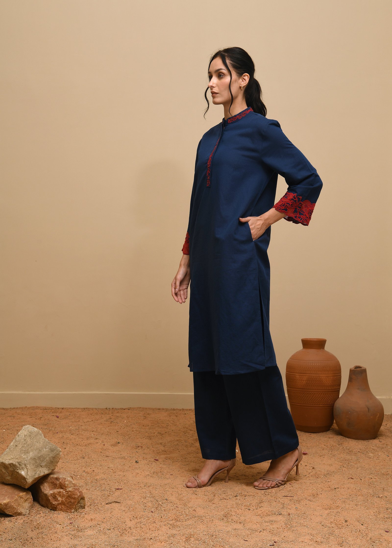 This linen cord set presents an effortlessly elegant and minimalist aesthetic, perfect for everyday sophistication. Crafted from breathable navy blue linen, the outfit features a straight-cut kurta with subtle side slits and full-length sleeves. The neckline and sleeve hems are elevated with intricate red embroidery in floral and vine motifs, adding a striking yet tasteful contrast. The kurta is paired with matching wide-legged pants that offer both comfort and a clean silhouette. The overall look balances tradition and modernity, making it suitable for both casual and semi-formal occasions. Ideal for warm weather, this set is a refined choice for those who appreciate understated detail and timeless design.