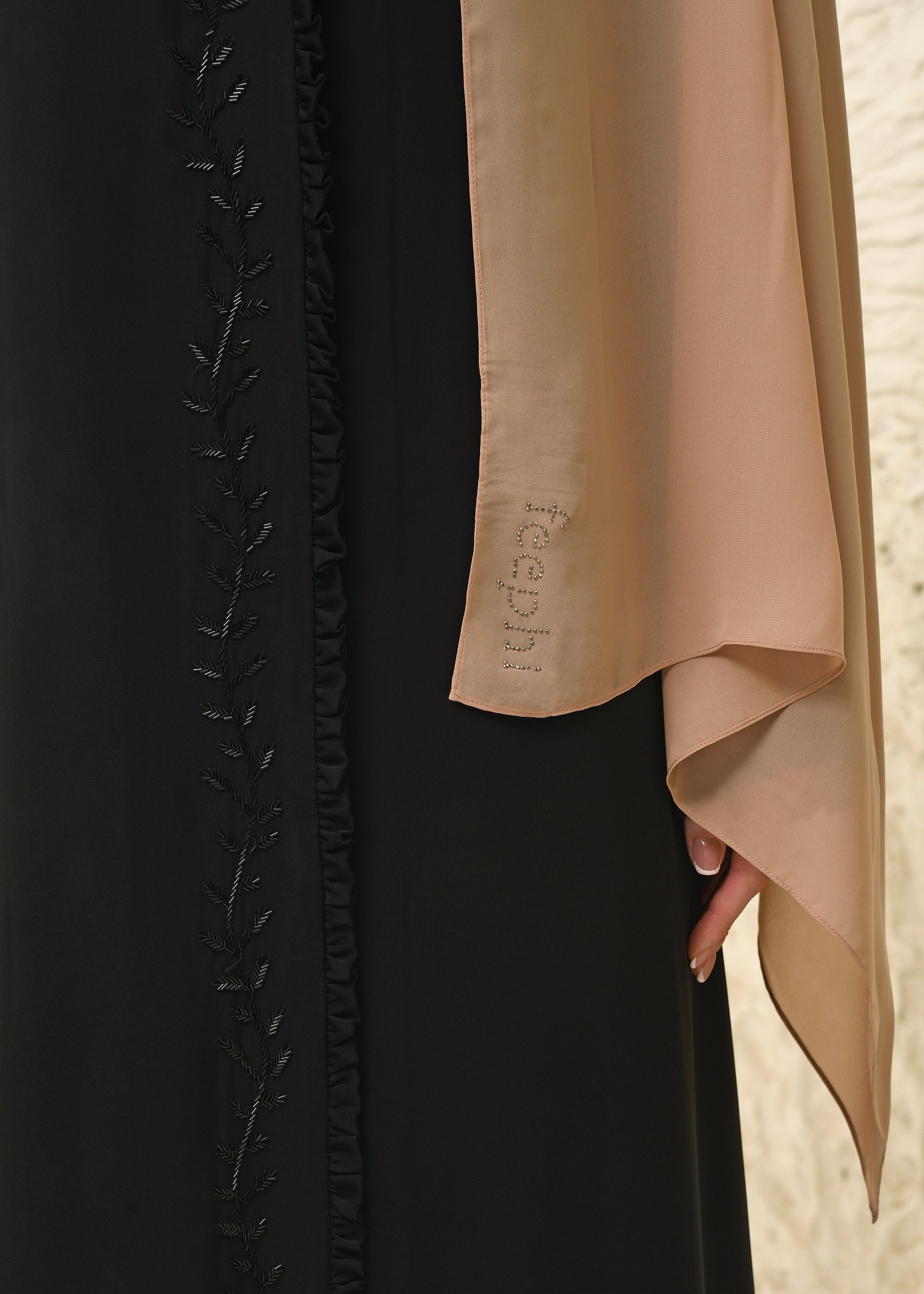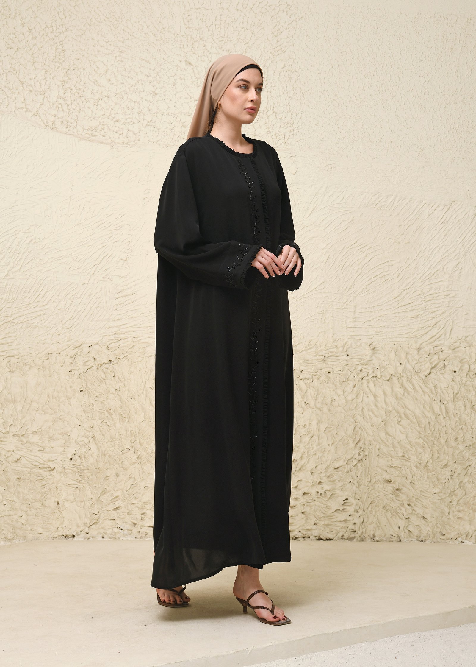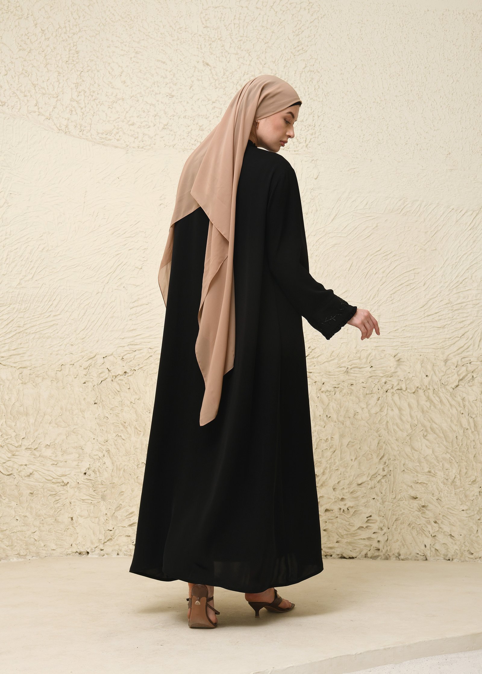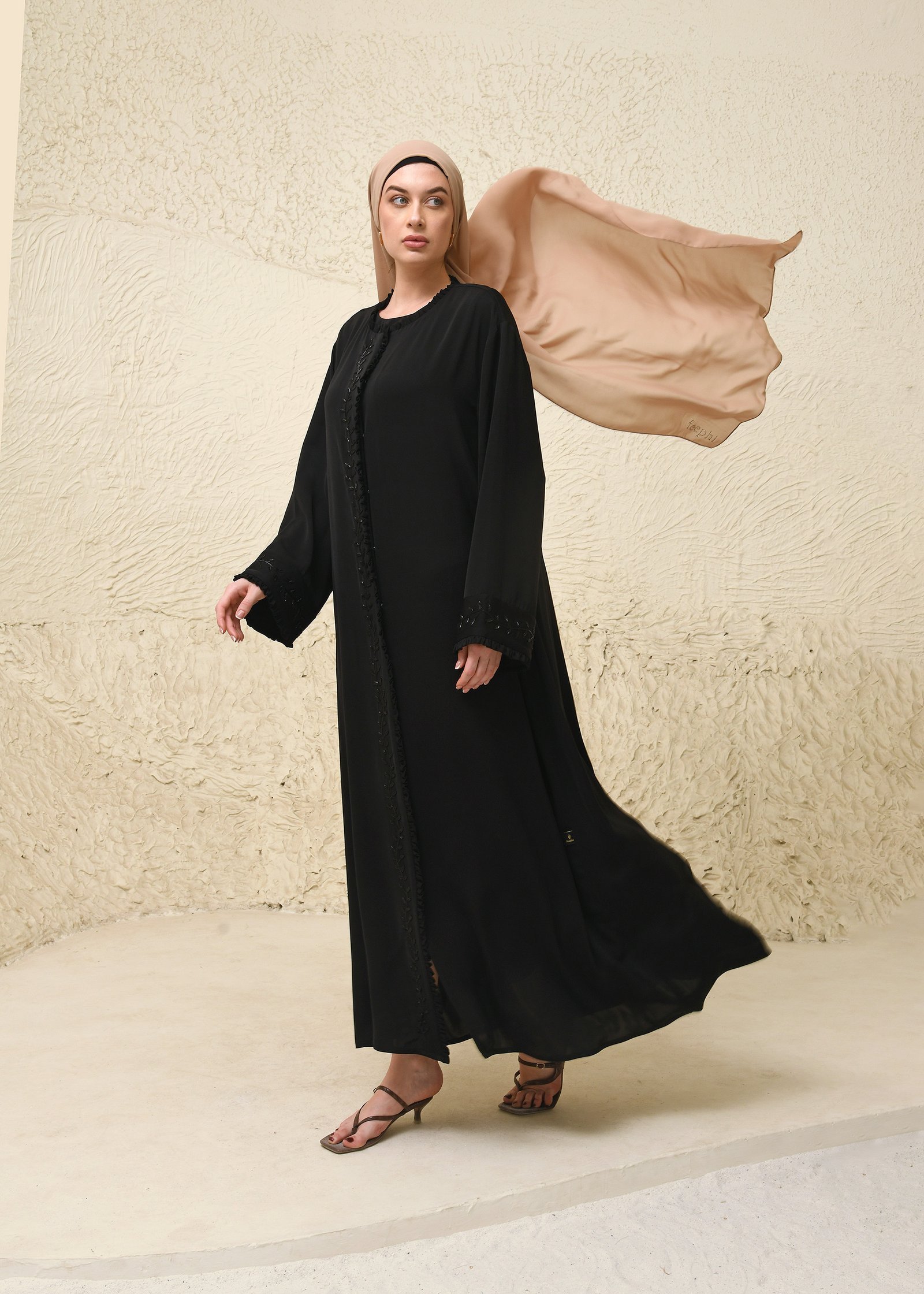 This refined three-piece abaya set, tailored from luxurious Nida fabric, embodies modern grace and timeless modesty. The abaya comes in a deep slate grey tone, offering a clean and contemporary silhouette. Designed with a front placket closure and wide, softly pleated sleeves, it flows beautifully while ensuring ease and elegance. The matching inner dress maintains the set’s minimal yet elevated look, while the coordinating grey scarf completes the ensemble with polished harmony. Understated but effortlessly chic, this abaya set is perfect for daily sophistication, formal events, or serene spiritual moments.