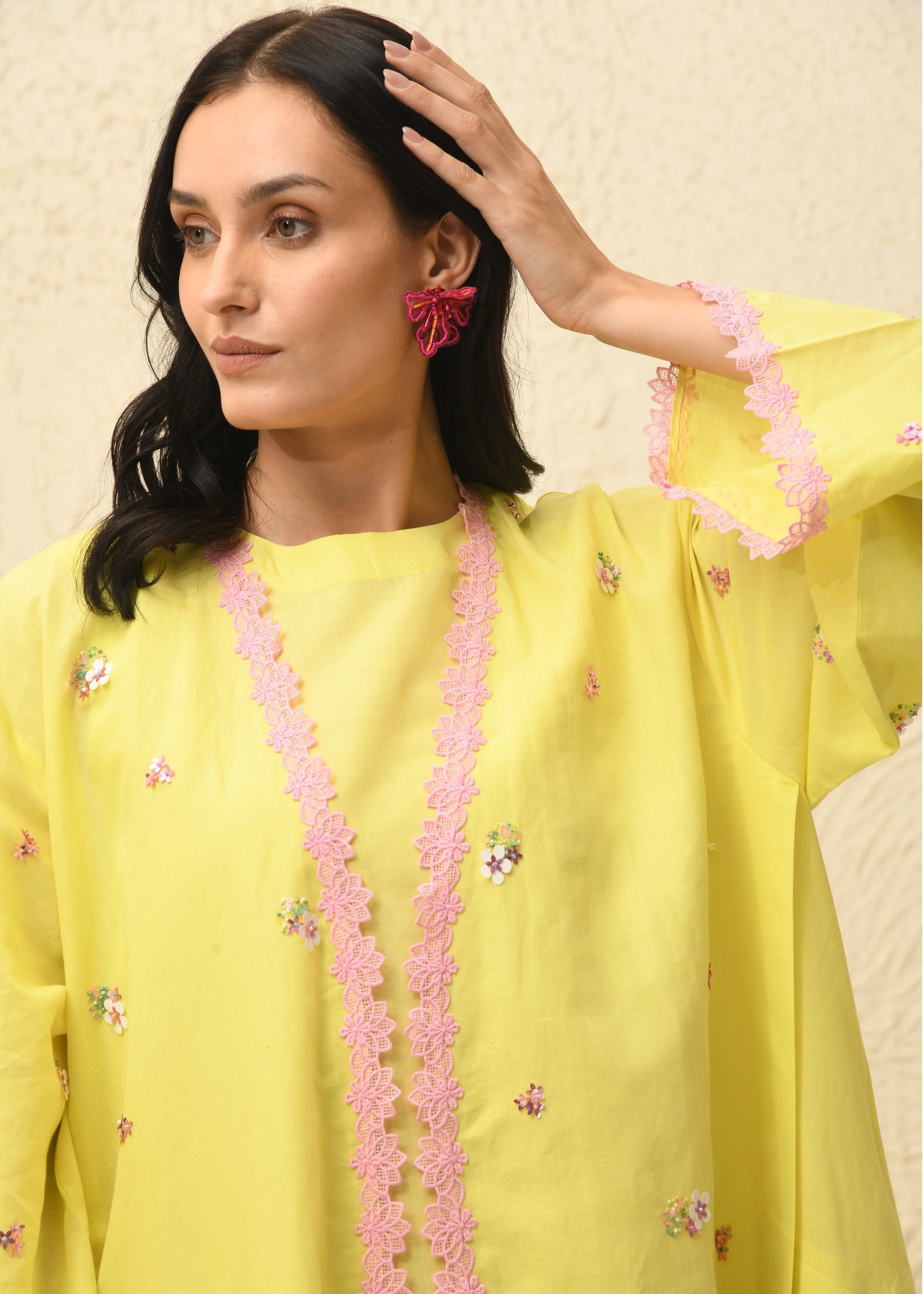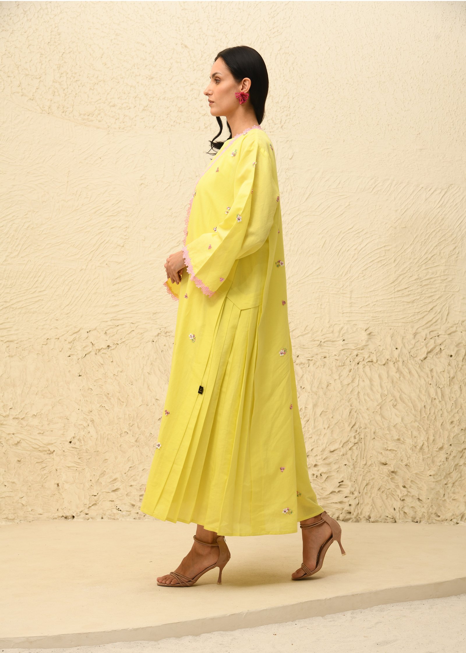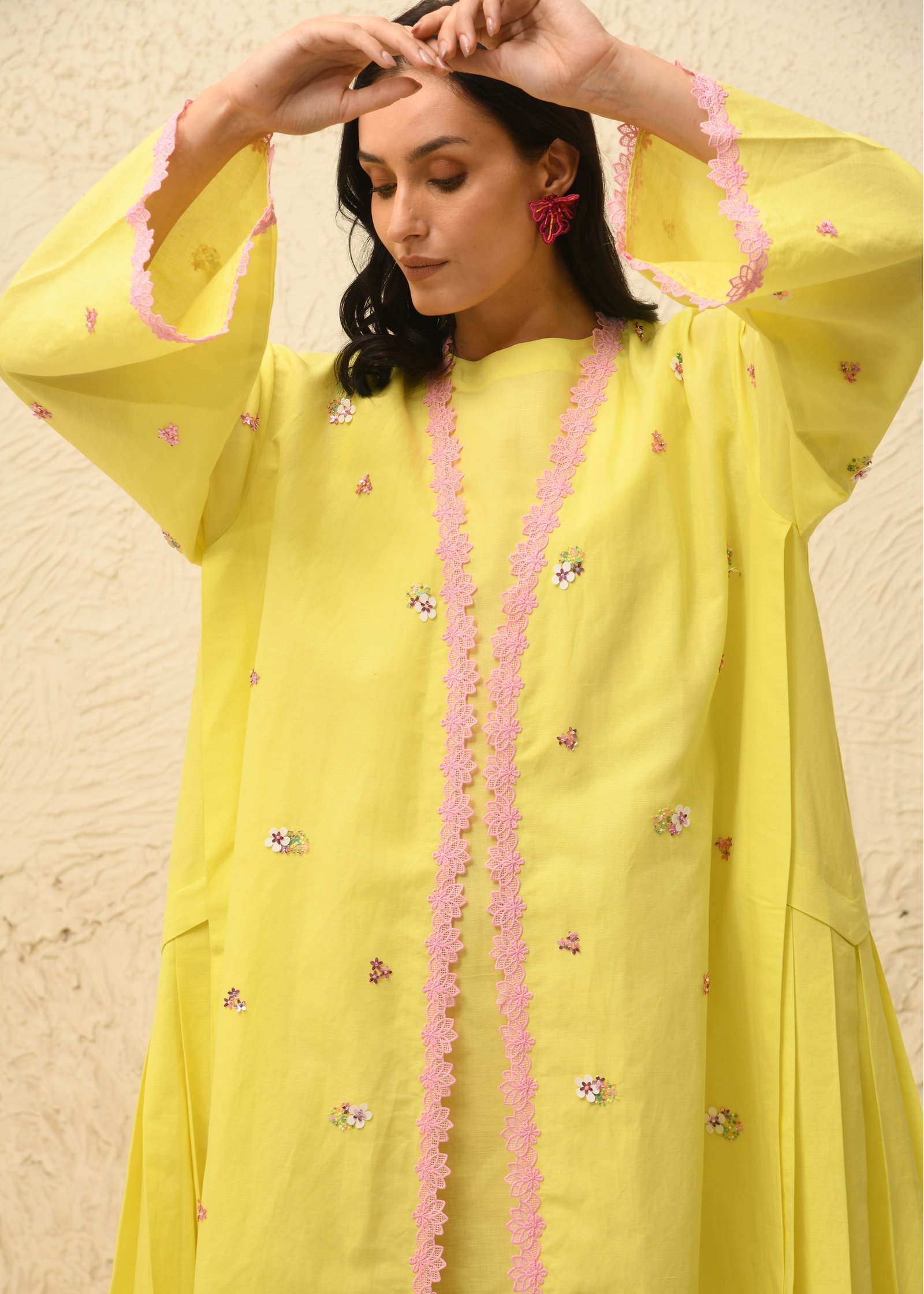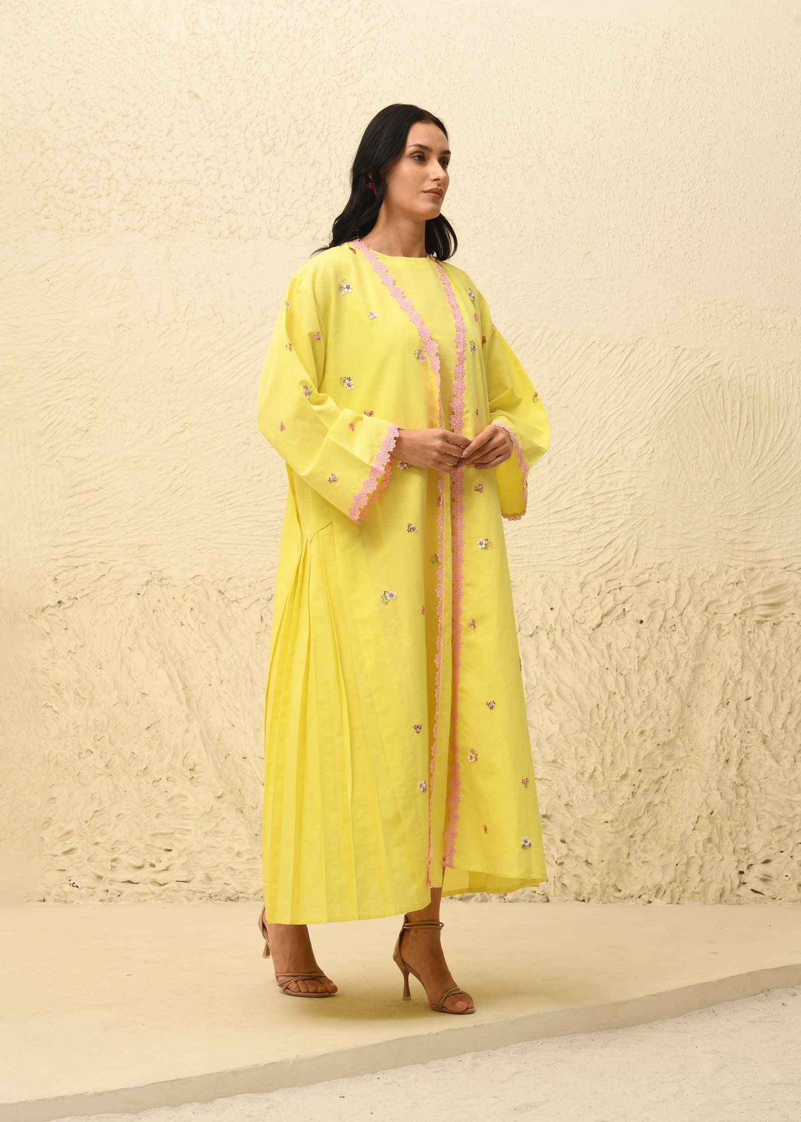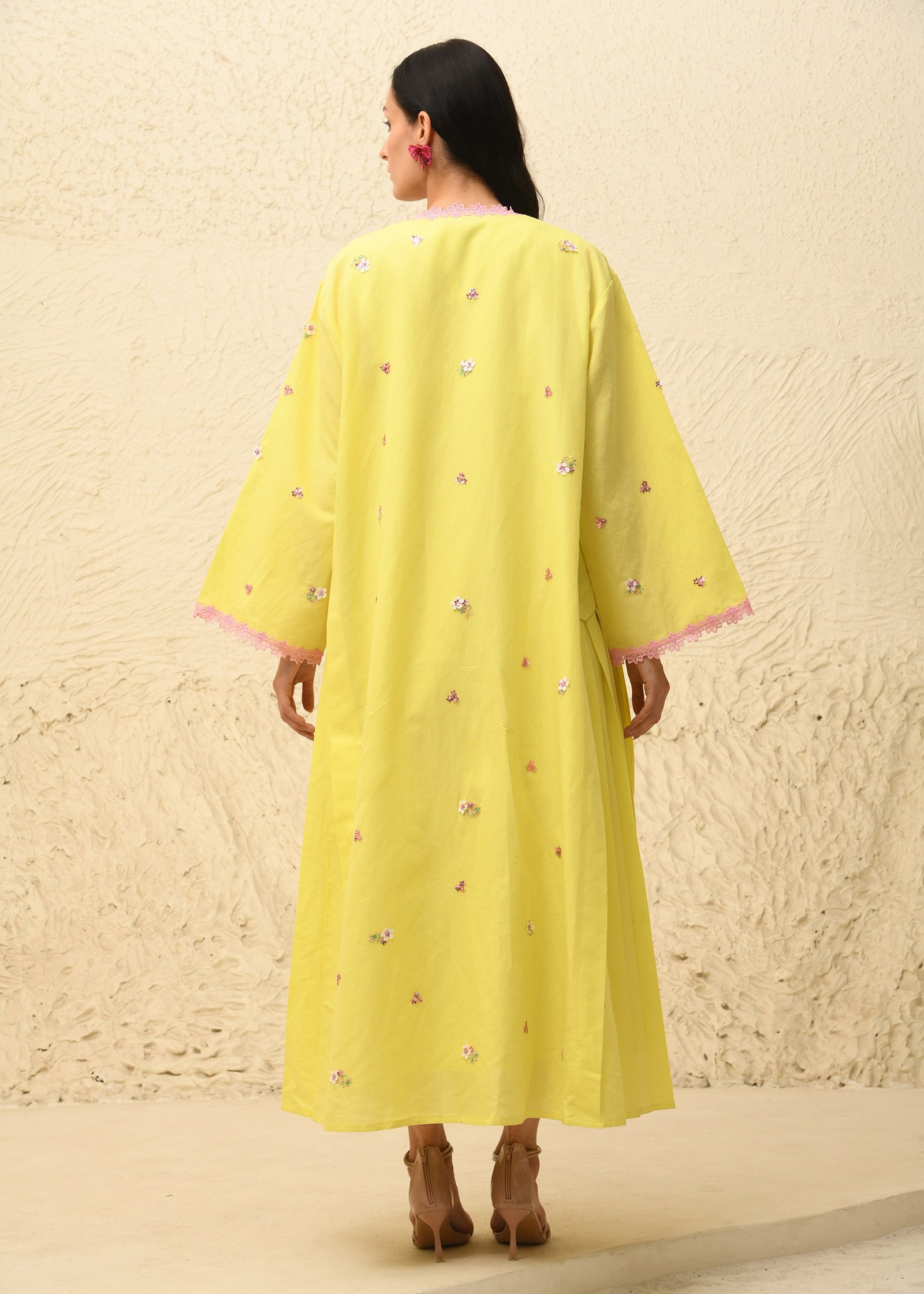 As if kissed by sunshine, this lemon-yellow abaya radiates warmth and grace. Crafted from lightweight fabric, it drapes with effortless elegance—perfect for bright days and tranquil evenings. Delicate floral embellishments shimmer like dewdrops on spring petals, while soft pink lace borders trace the front and cuffs like a gentle breeze. With its wide, flowing sleeves and fluid silhouette, this set captures the essence of joyful vibrance and timeless femininity. Paired with a matching inner dress and scarf, it becomes a celebration of light, movement, and understated style.