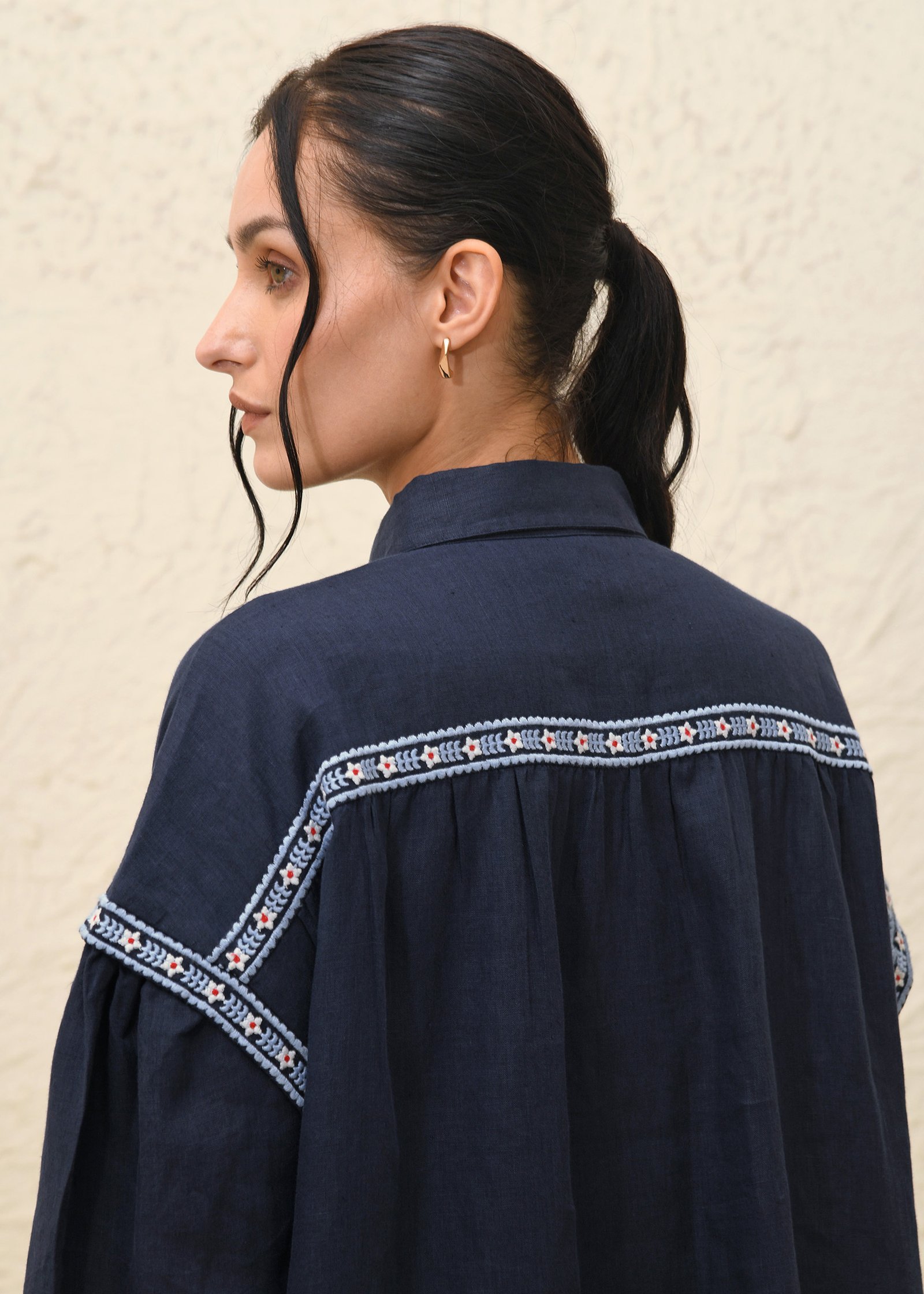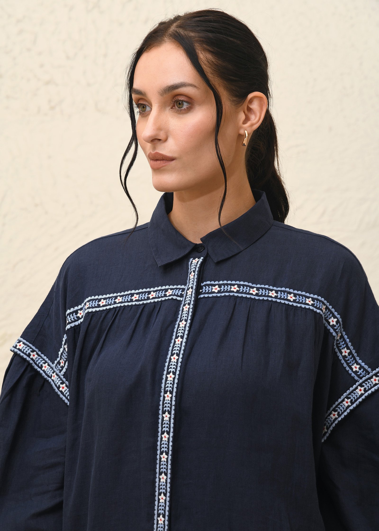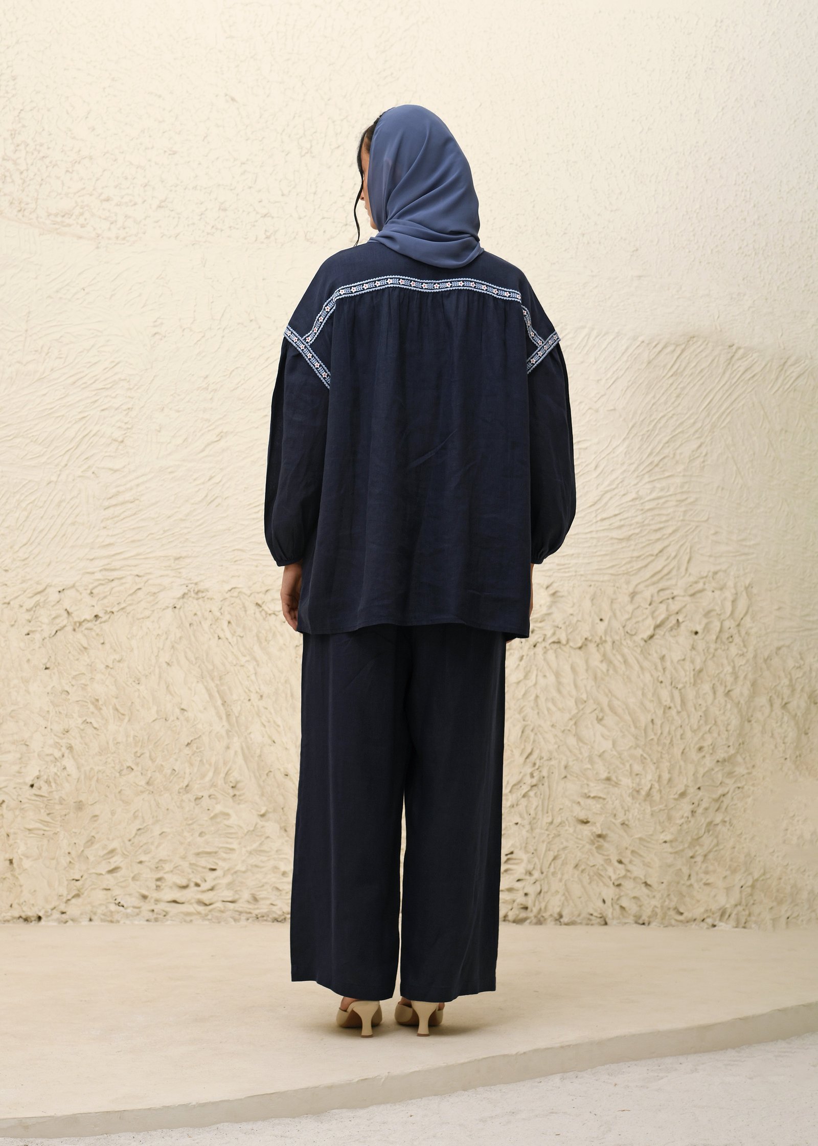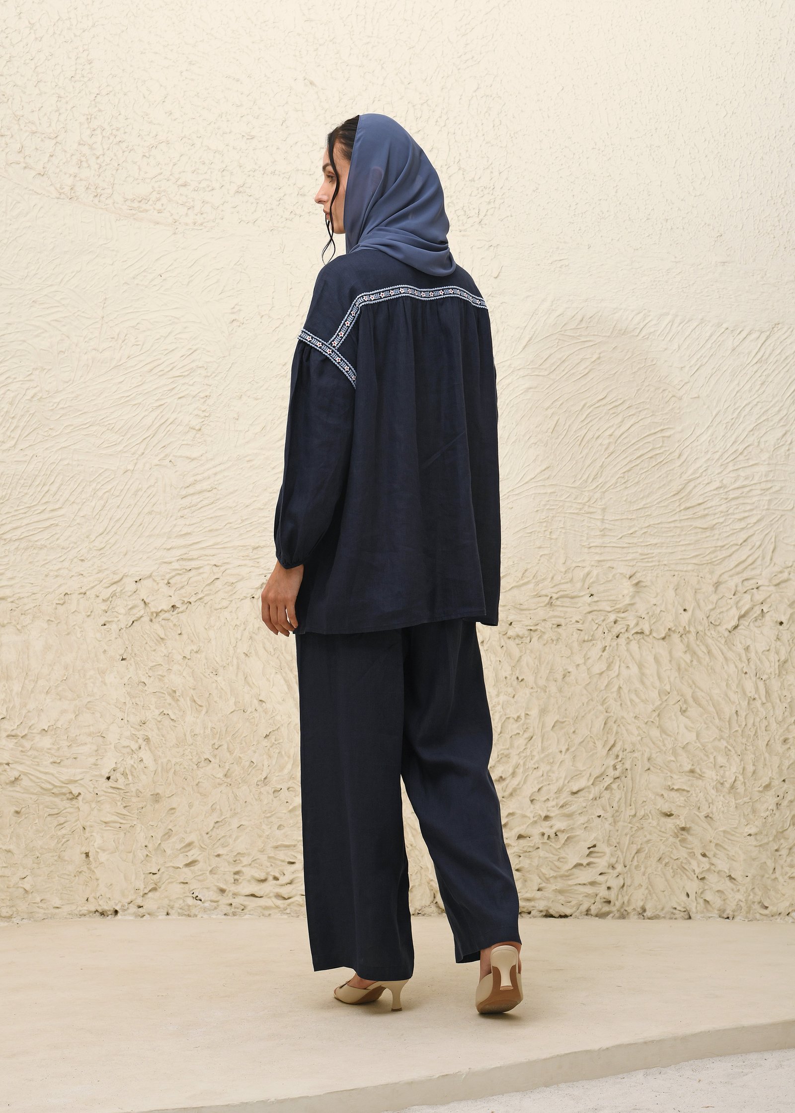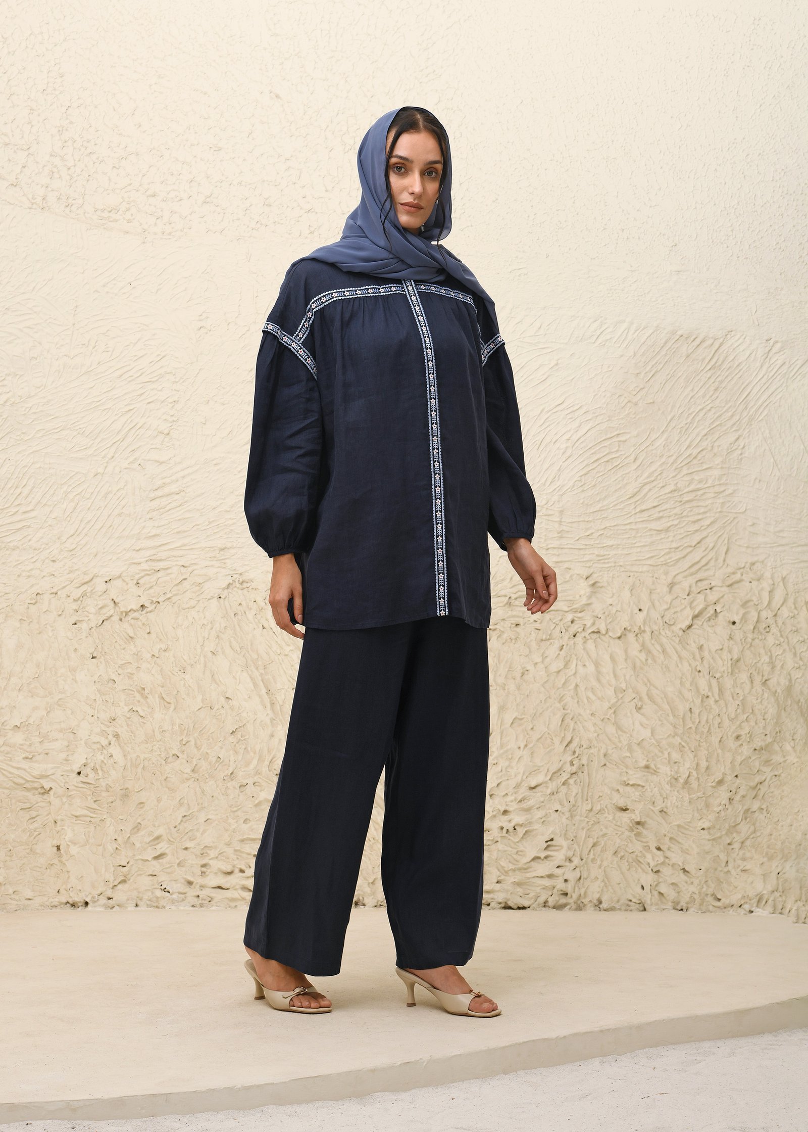This co-ord set is a refined take on everyday elegance, crafted from deep navy linen that offers both breathability and structure. The top features a relaxed, slightly flared silhouette with gathered detailing below the yoke, giving it a soft, fluid drape. Its standout element is the intricate white thread embroidery that runs across the chest and down the front placket, forming a clean yet ornate linear design. Voluminous sleeves with gathered cuffs enhance the overall ease and charm of the look, while the wide-legged matching trousers maintain a graceful, comfortable fit. Paired with a tonal navy scarf, the set exudes understated sophistication with artisanal nuance. Perfect for daytime outings or modest workwear, this ensemble balances heritage-inspired embroidery with contemporary tailoring, making it both versatile and timeless.