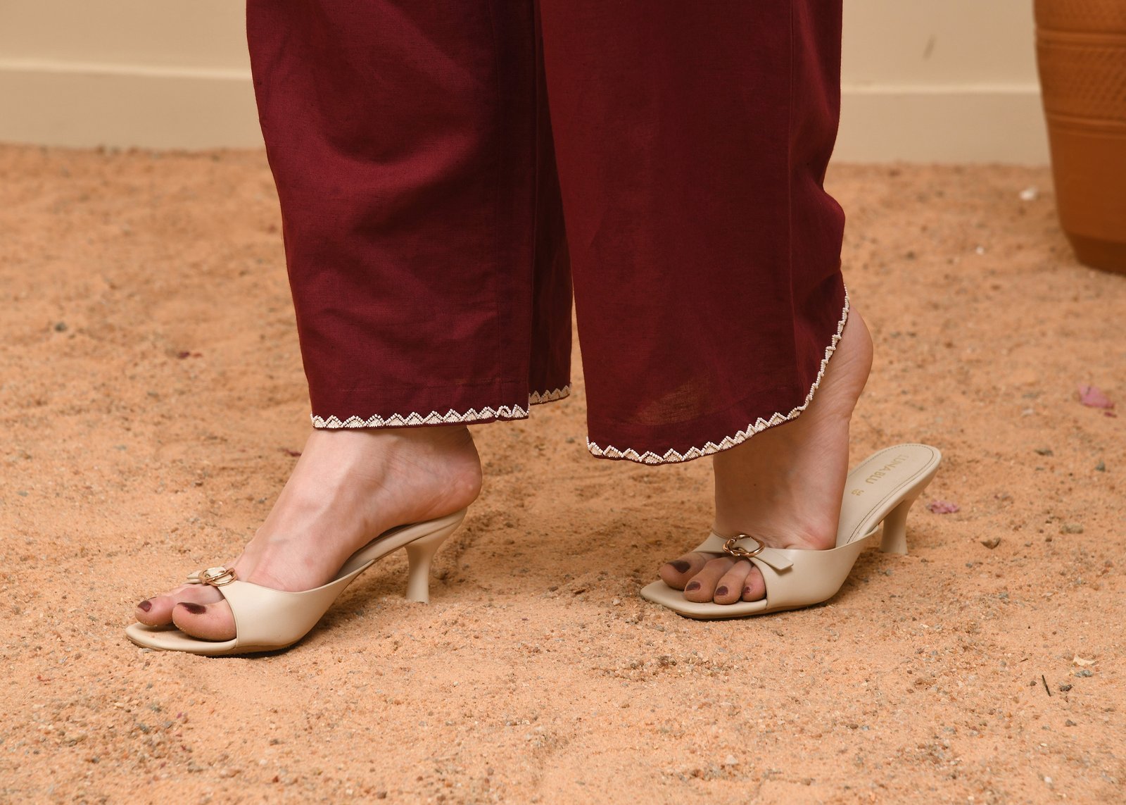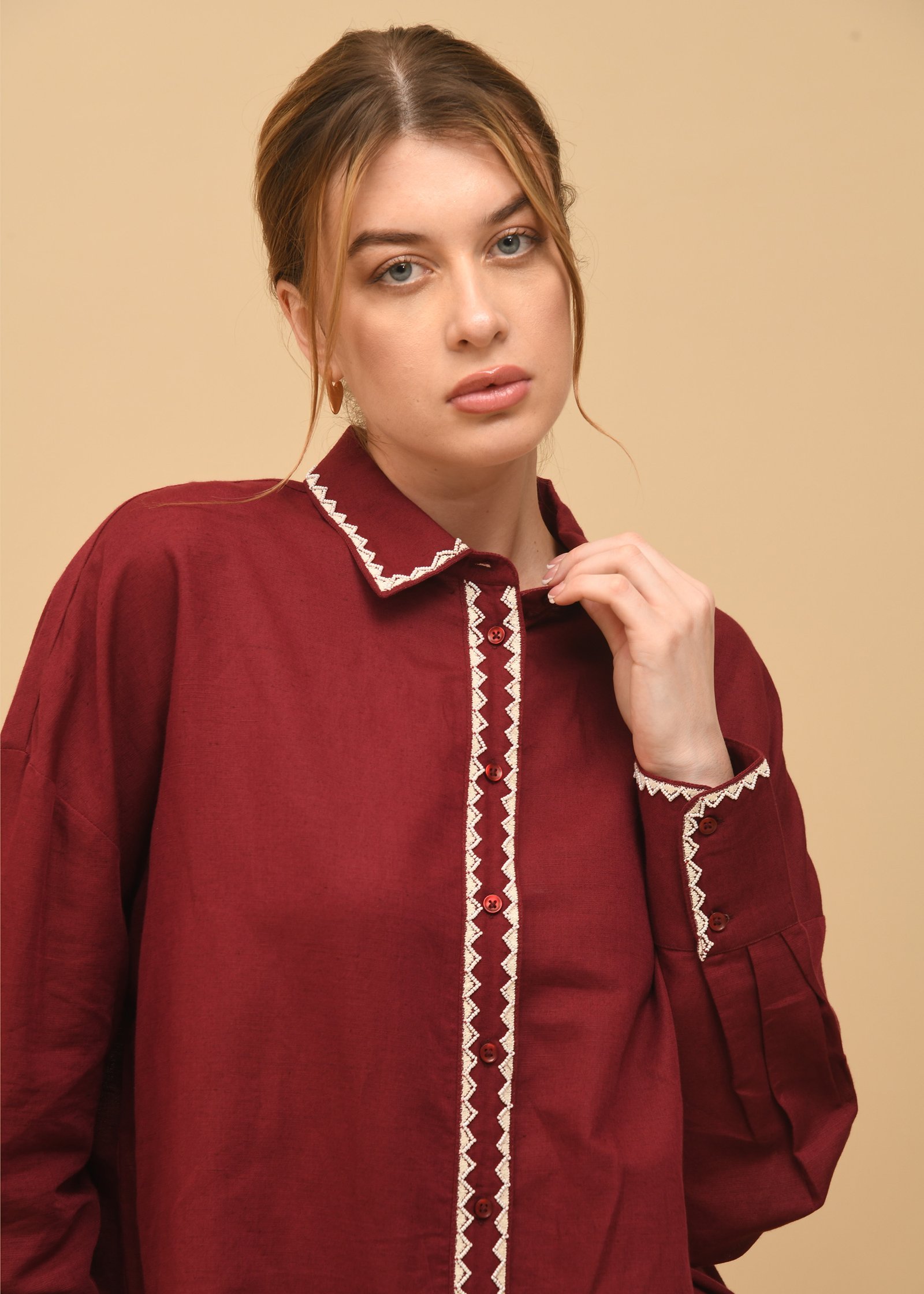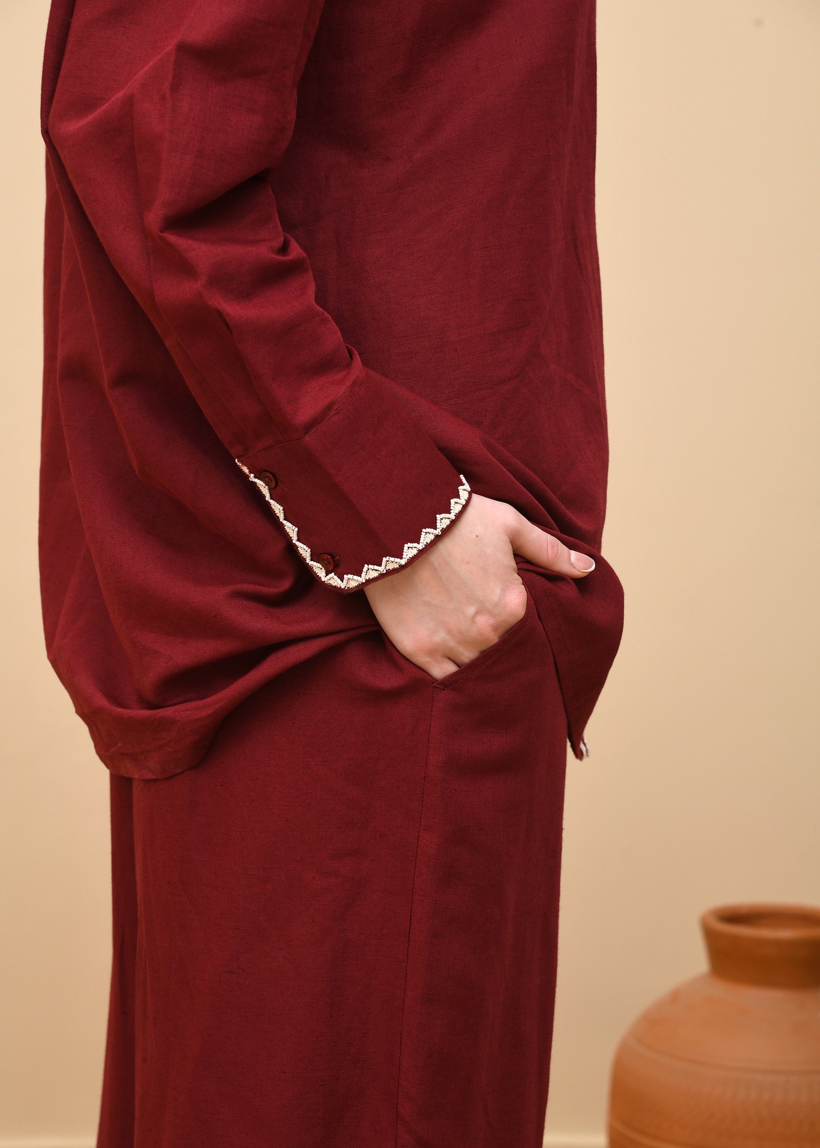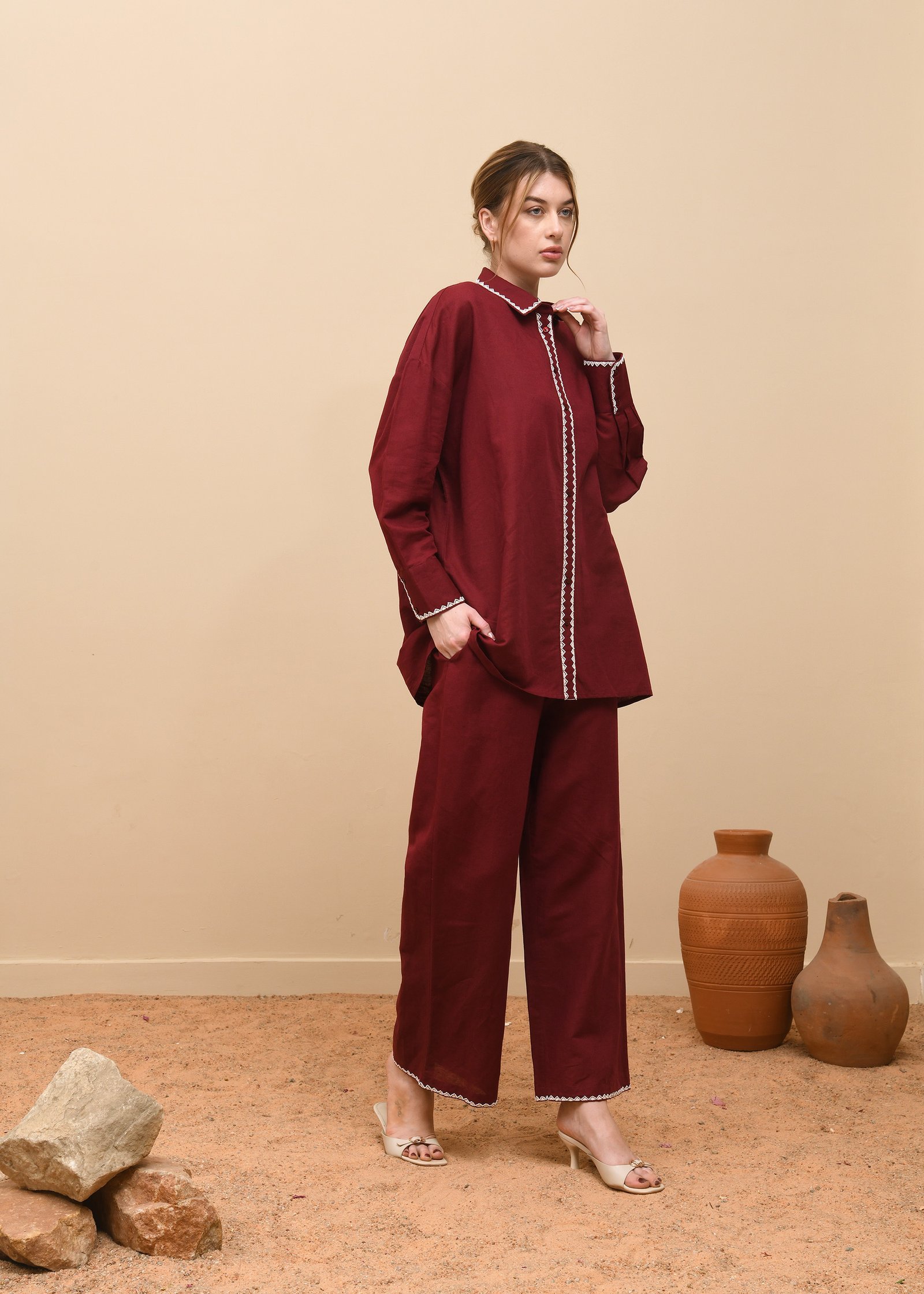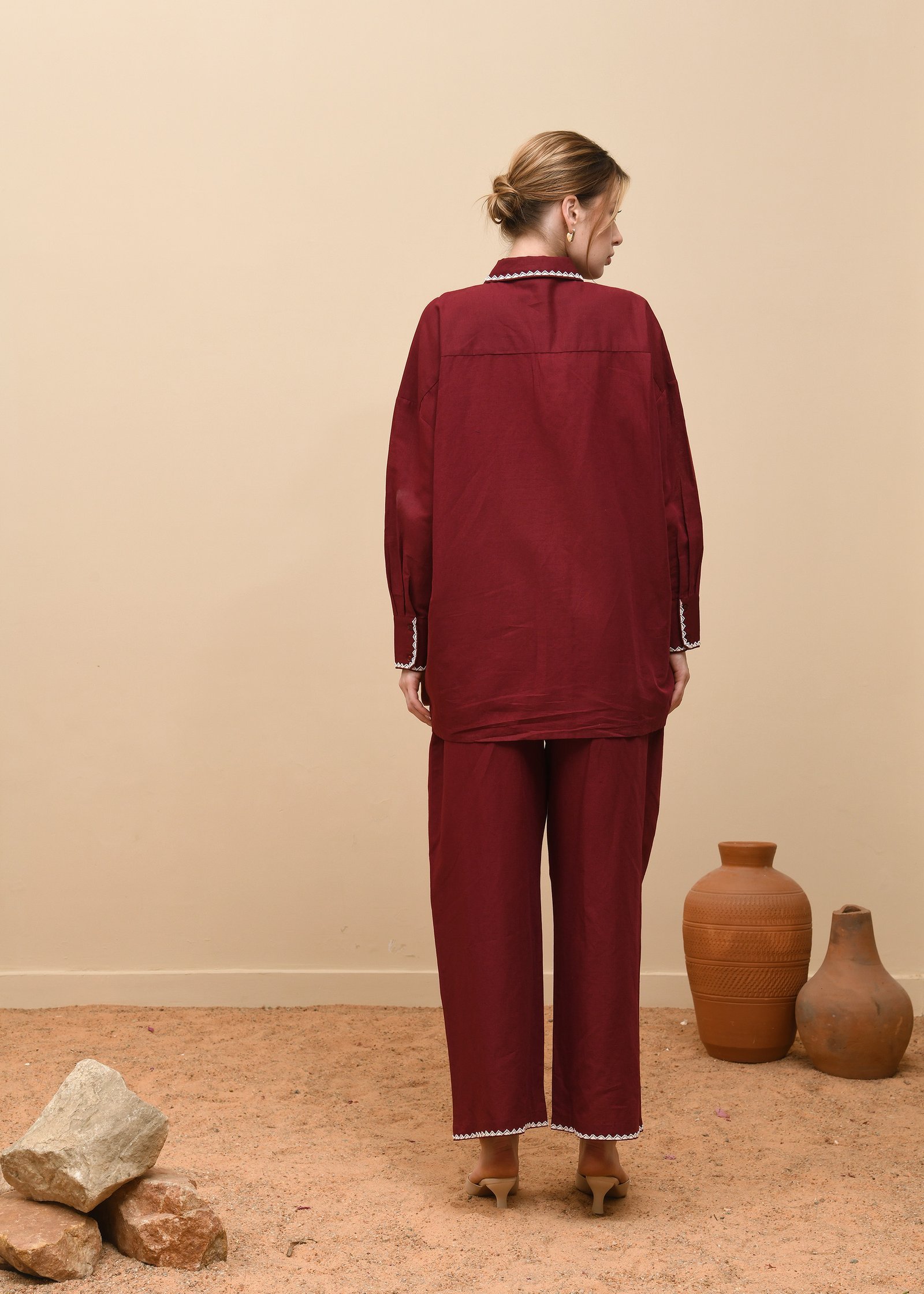This co-ord set exudes relaxed sophistication, crafted from deep maroon linen that transitions seamlessly from casual wear to refined daywear. The top showcases a shirt-style silhouette with a pointed collar and front button placket, adorned with delicate scalloped white embroidery that adds a subtle touch of artistry. The same embroidery trims the cuffs and hems of the wide-legged trousers, creating a cohesive and thoughtfully detailed ensemble. Designed for effortless comfort, the relaxed fit and breathable linen fabric make it ideal for all climates. This set strikes a harmonious balance between contemporary tailoring and artisanal charm, offering a polished yet easygoing look perfect for everyday elegance or understated gatherings.