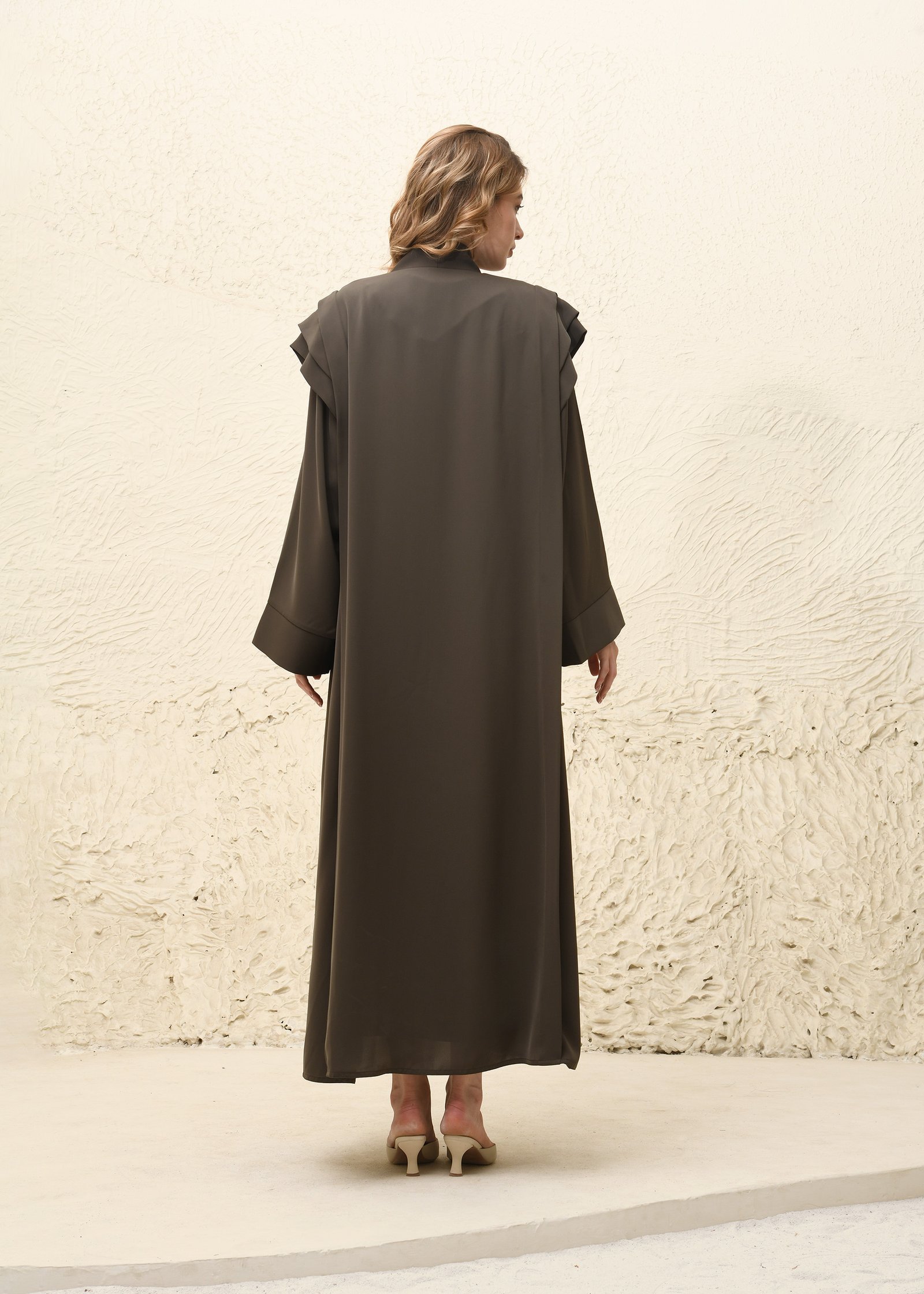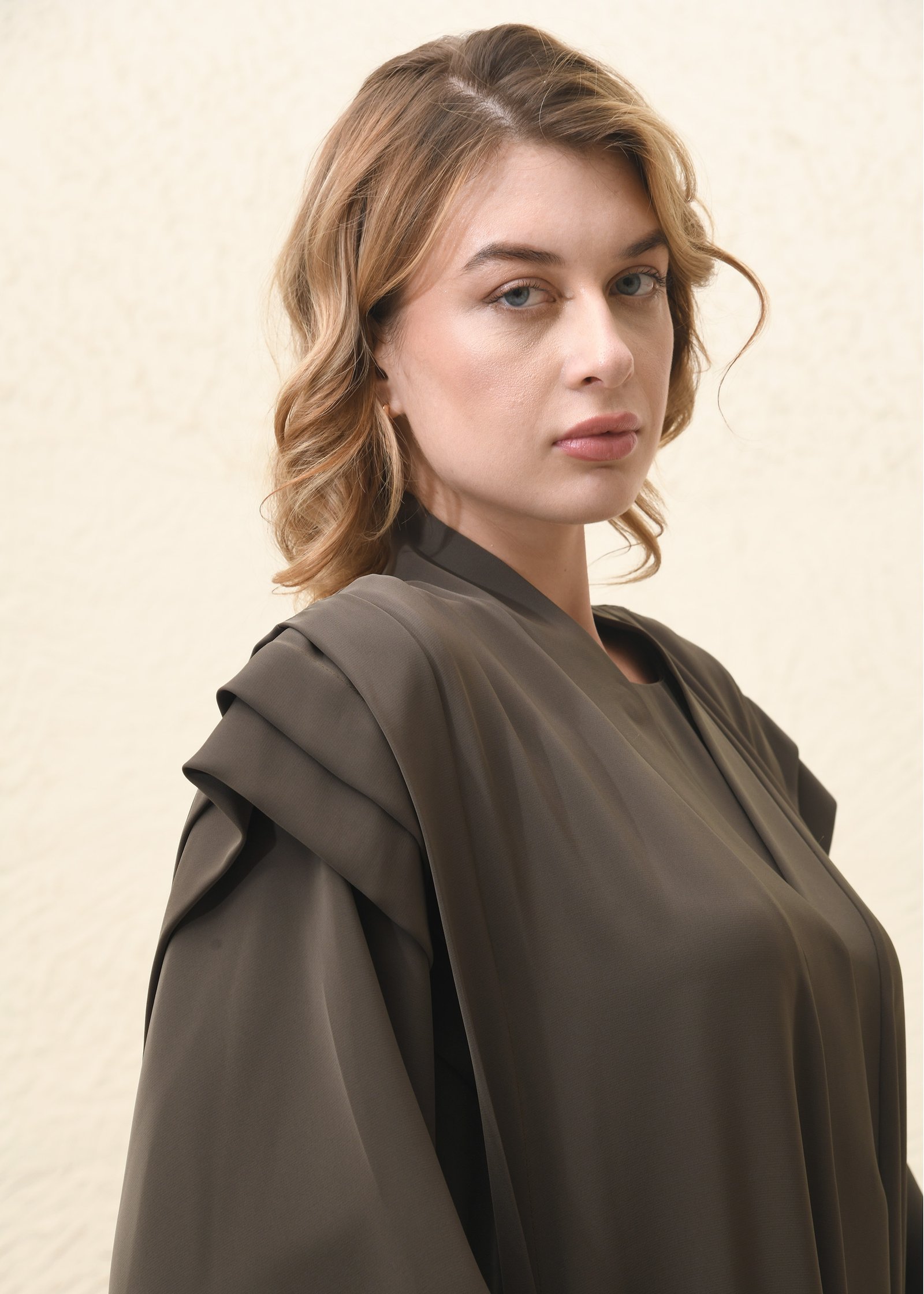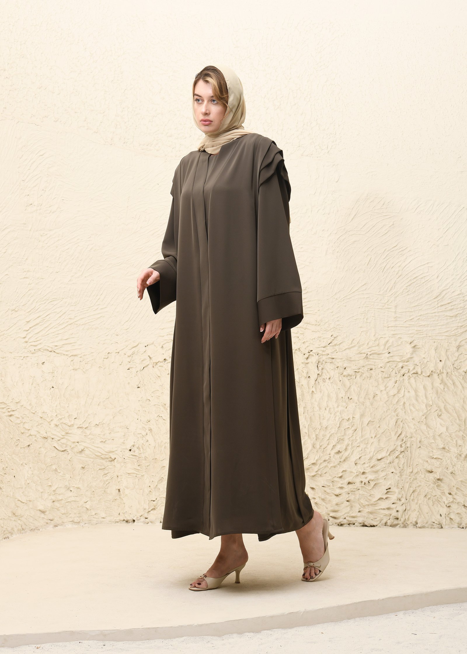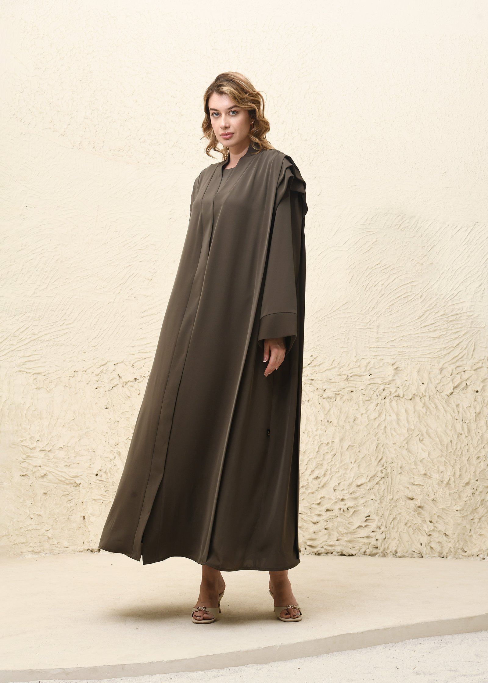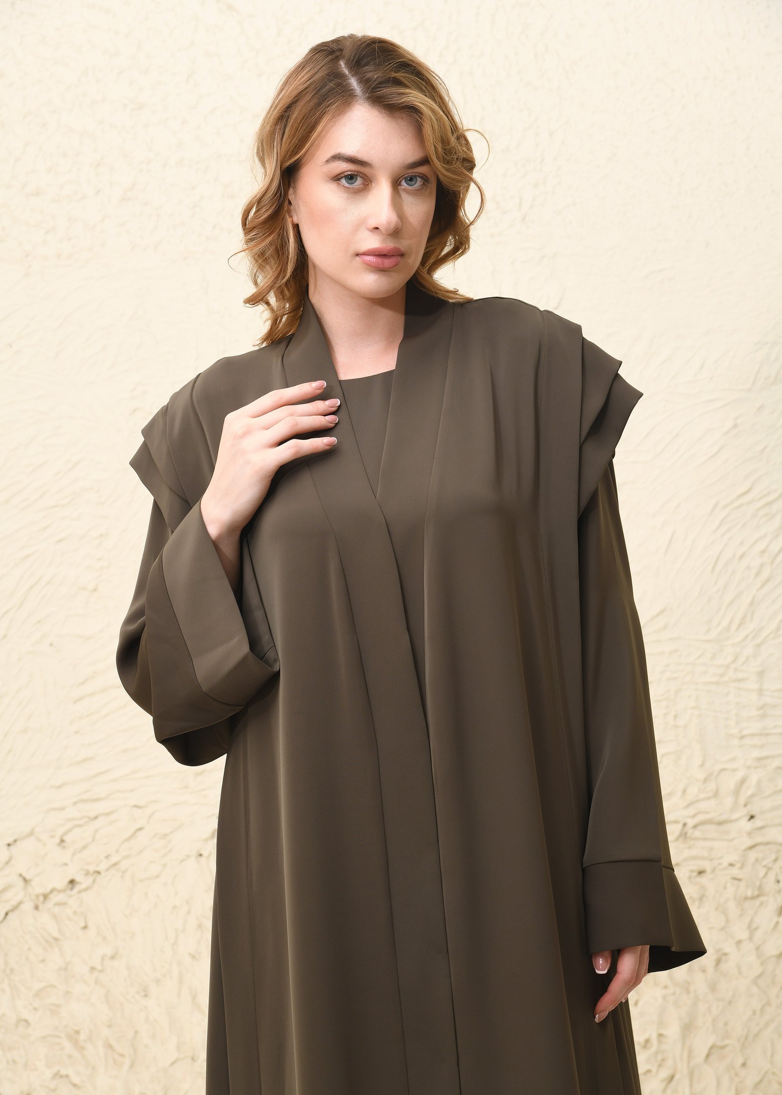 This three-piece abaya set in luxurious Nida fabric blends minimalism with subtle architectural elegance. The abaya features a deep olive-brown tone and a wide, flowy silhouette that ensures graceful movement. Unique layered shoulder paneling adds depth and structure to the design, while wide sleeves offer ease and sophistication. The matching inner dress ensures full coverage and fluid coordination. Paired with a soft beige scarf, the look is balanced and earthy—perfect for modest dressing with a refined edge. Ideal for transitional seasons and versatile wear, this set offers quiet strength and timeless charm.