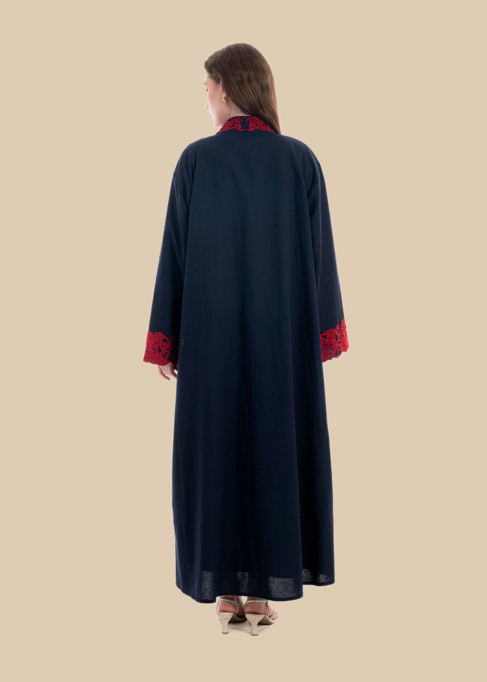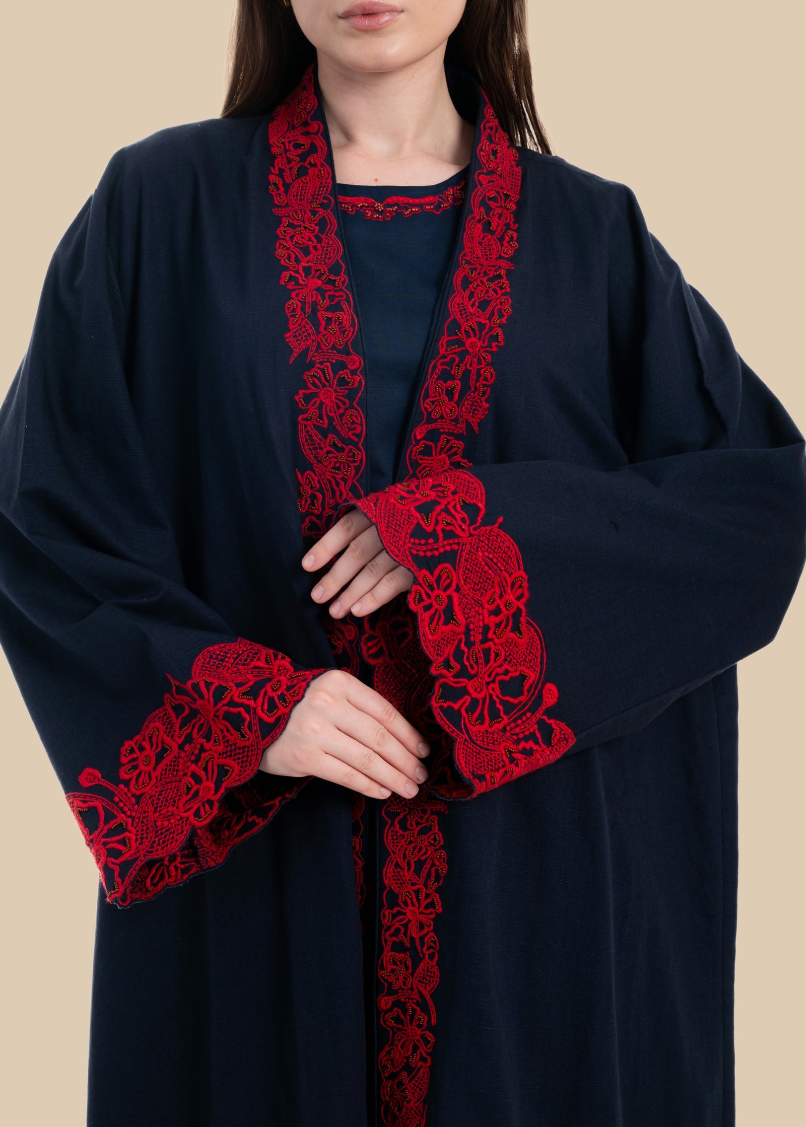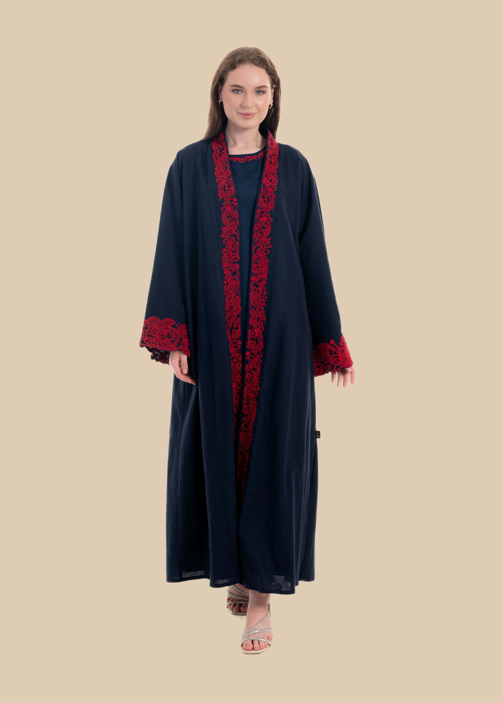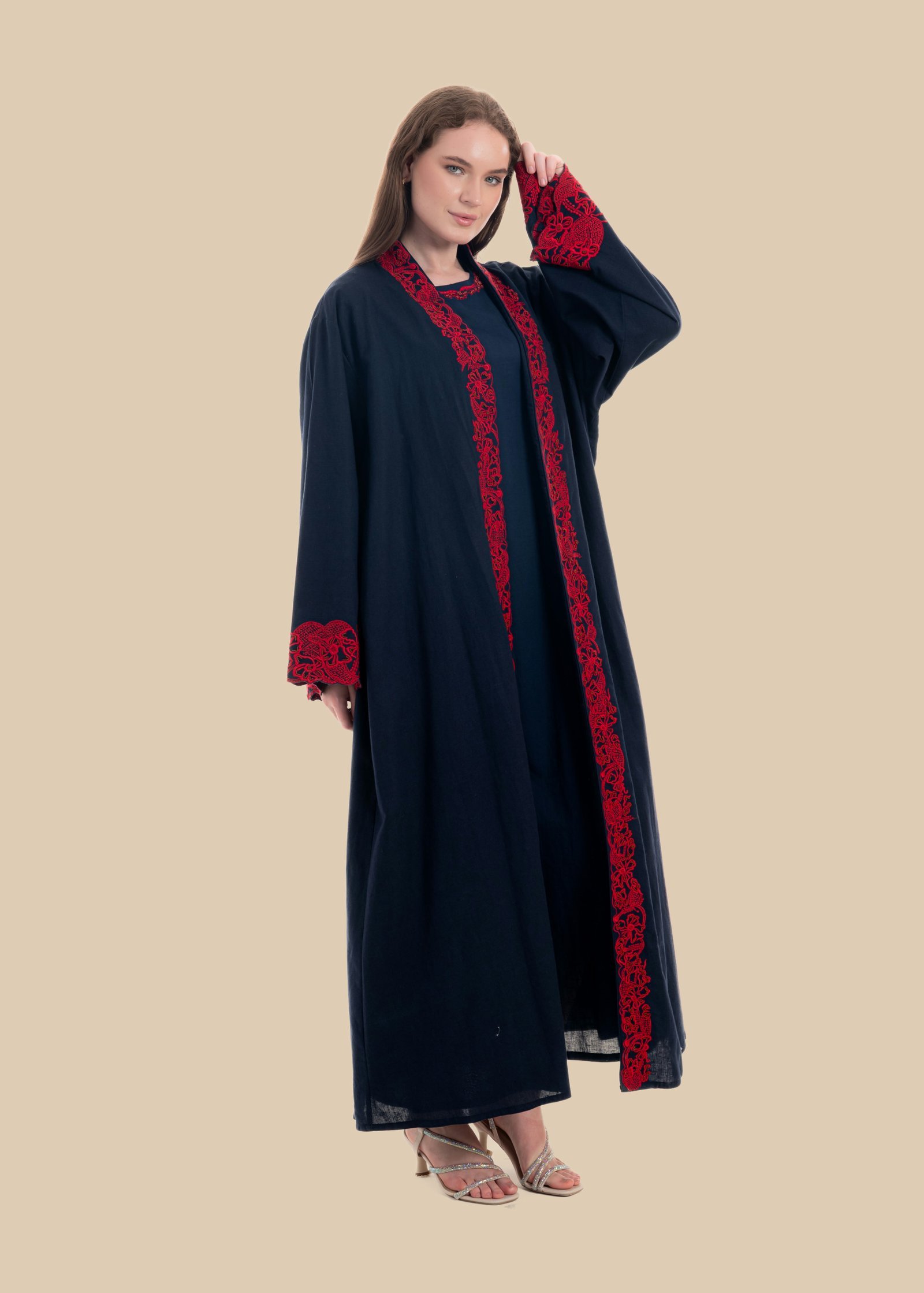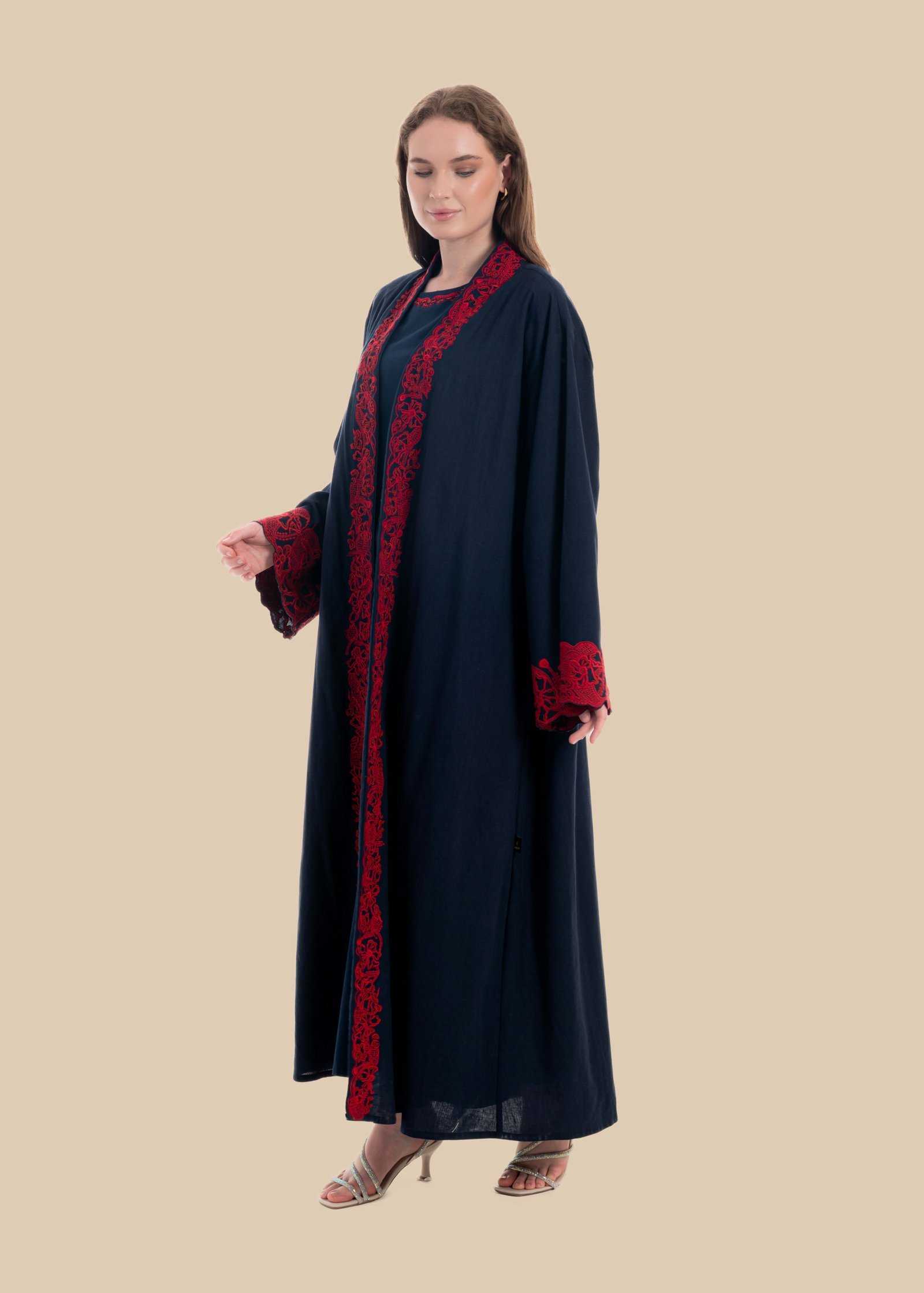 Softly striking, the Warda Abaya is crafted from high-quality linen blend fabric and paired with a flowing inner dress. Finished with intricate red embroidered ends and stitched with special care, it’s a perfect bloom for day parties and special occasions.