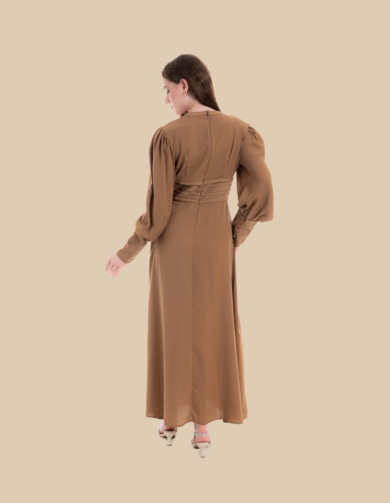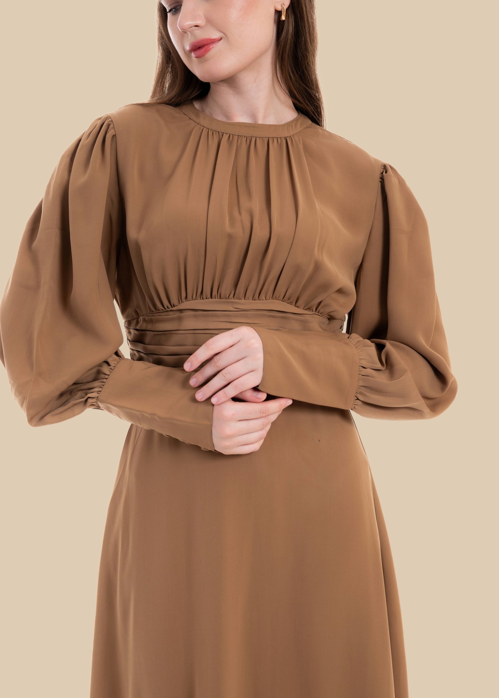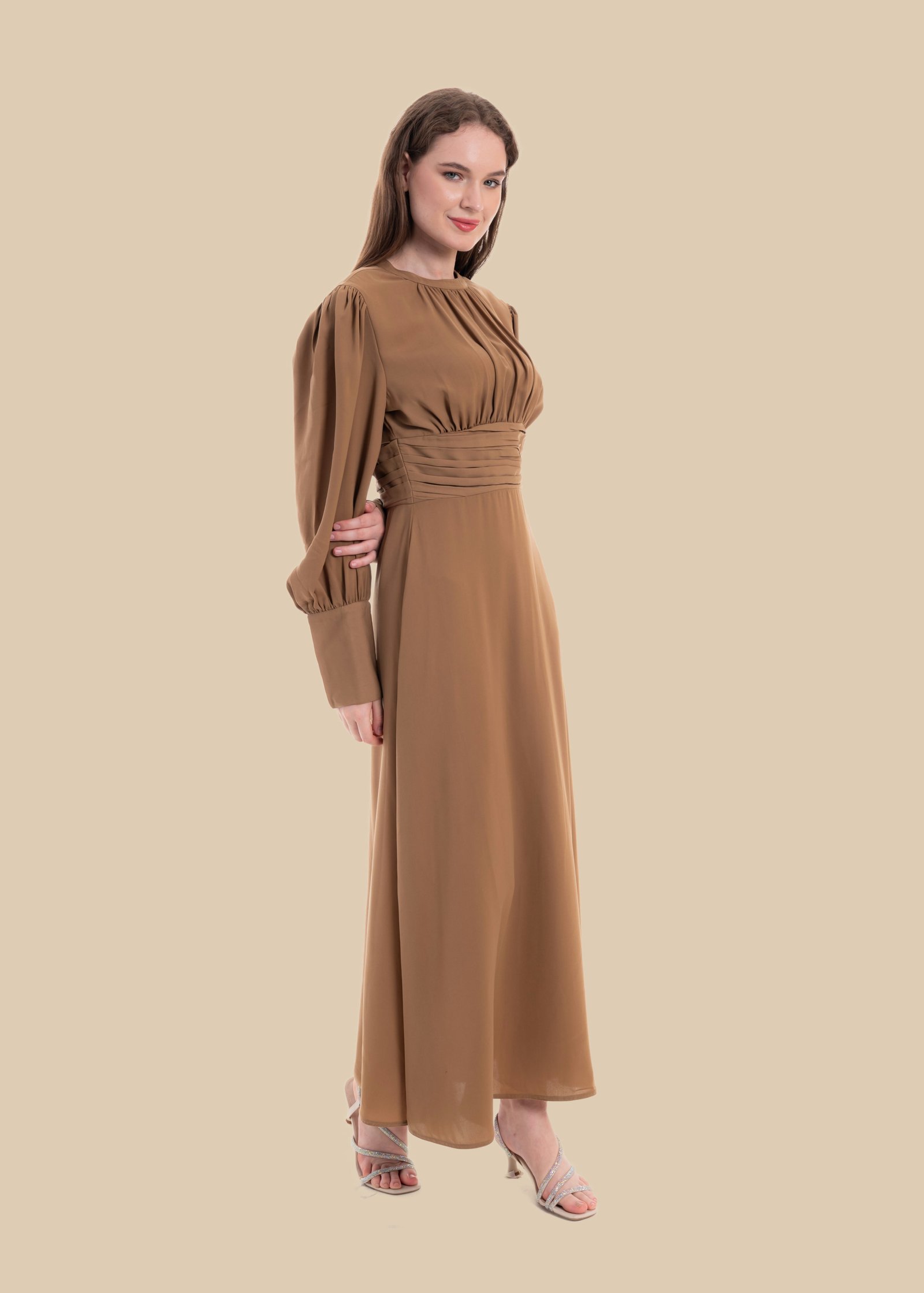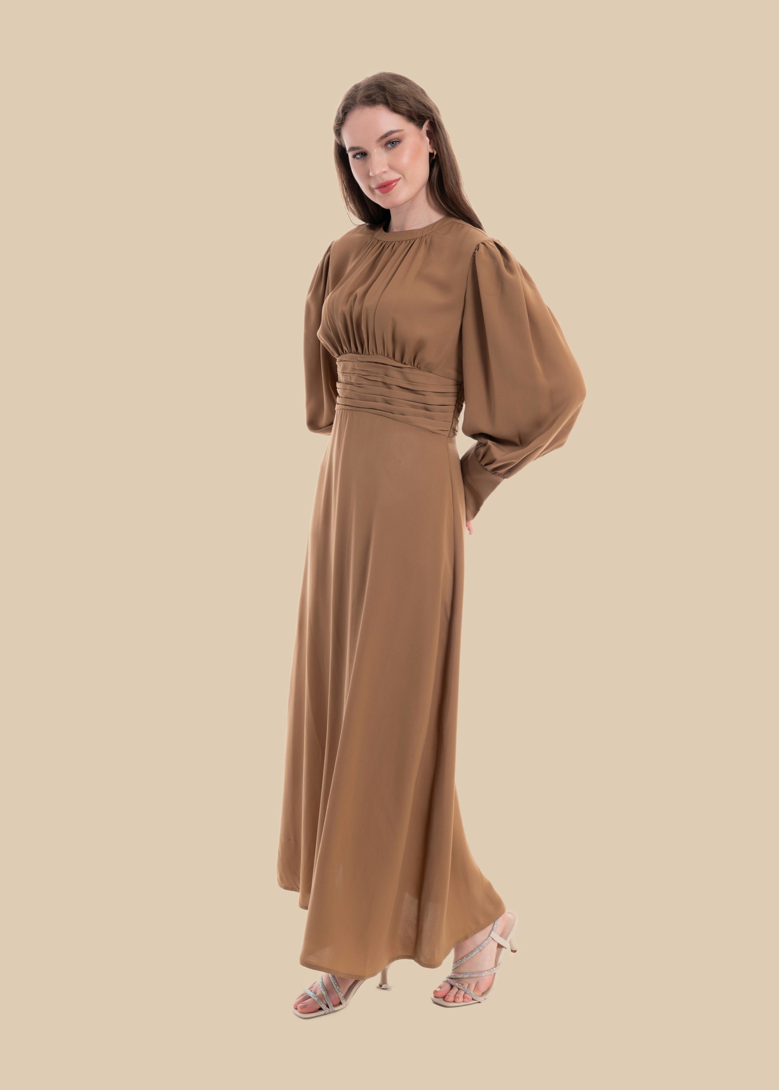 Made from soft Indian Nida fabric, the Zareen Dress features a gathered waist, a refined high neckline, and long sleeves finished with elegant cuffs. A timeless silhouette with graceful structure.