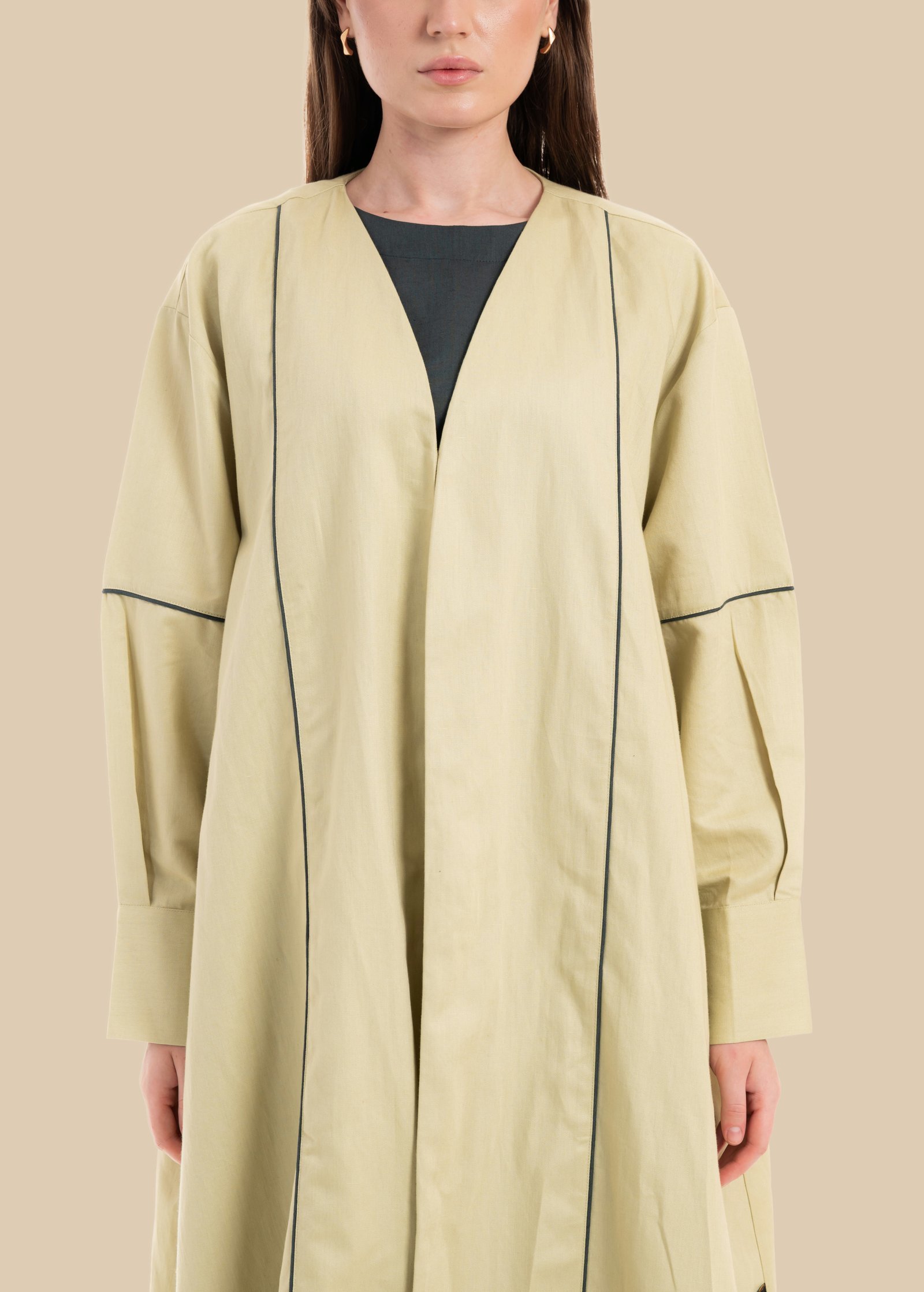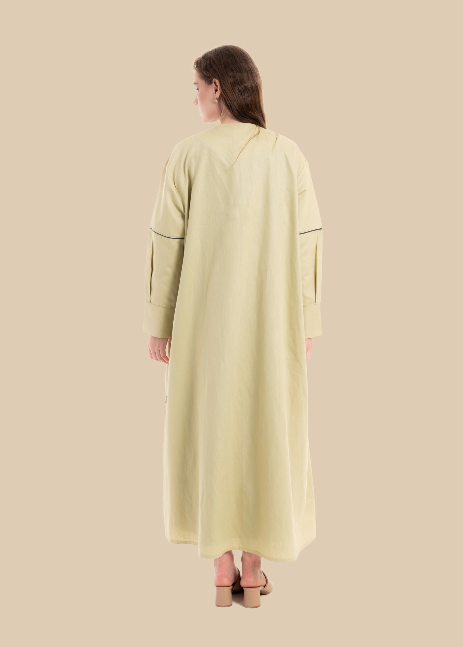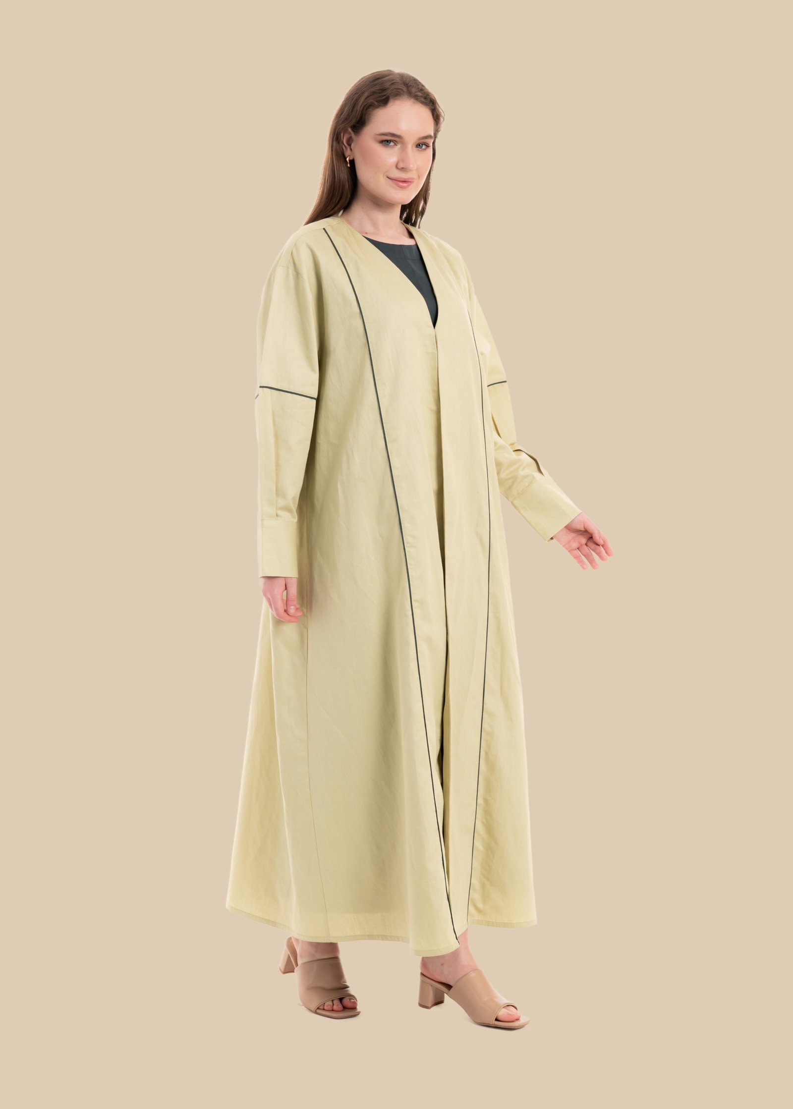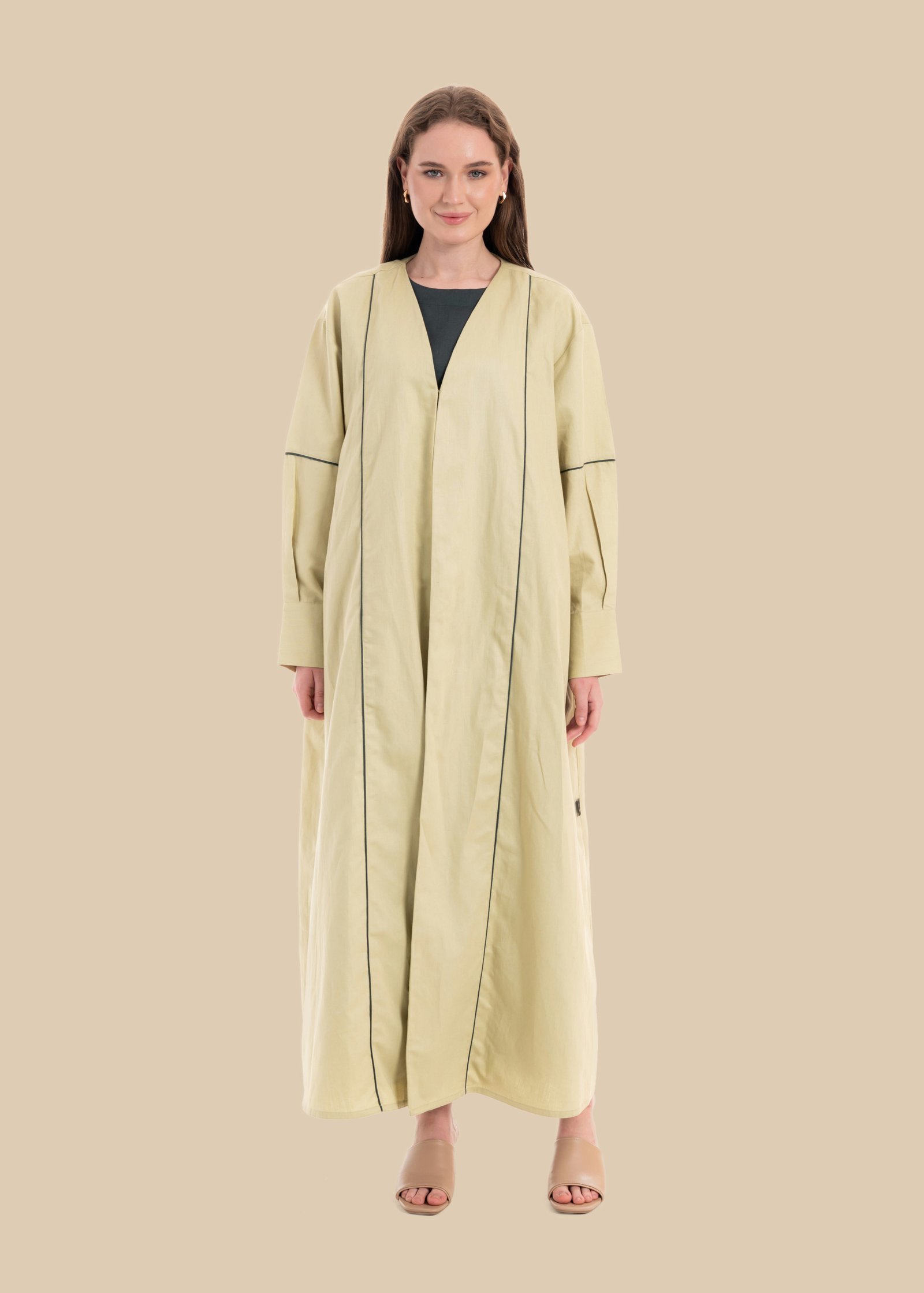 Breezy and elegant, the Zeenah Abaya is crafted from high-quality linen blend fabric, paired with a flowing inner dress. Designed in an open shrug style with contrast piping and meticulous stitching, it moves effortlessly from office hours to evening moments with timeless grace.