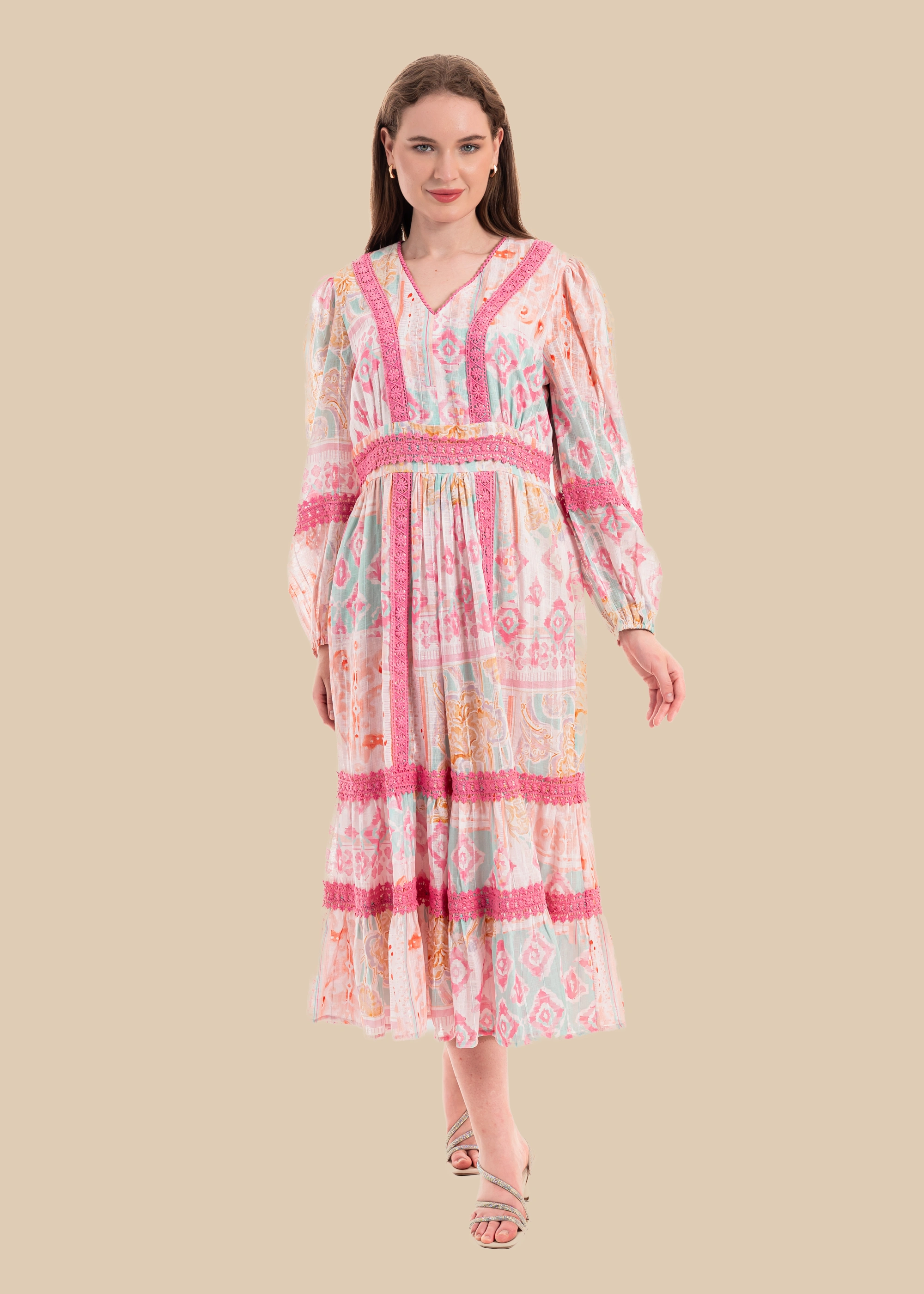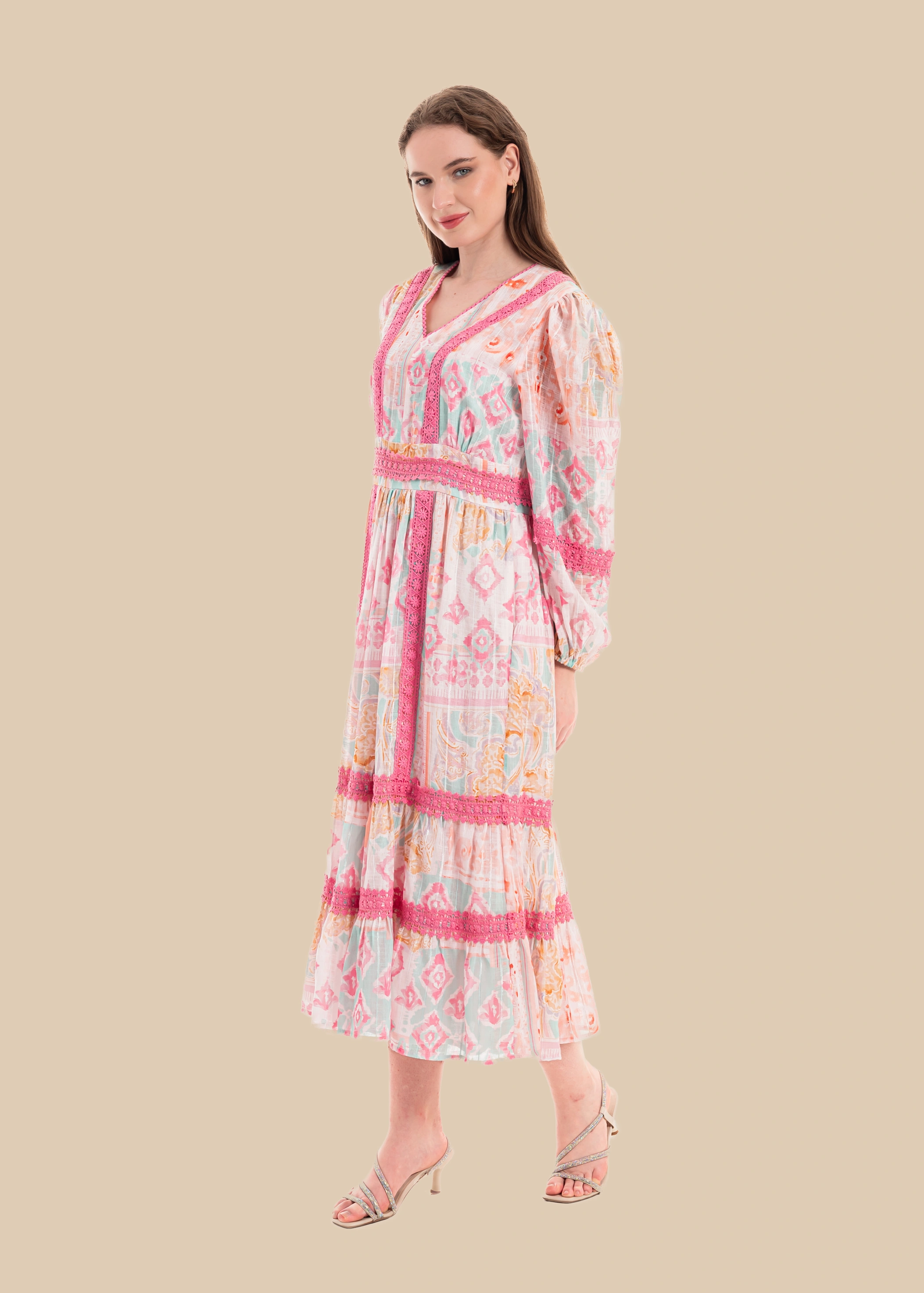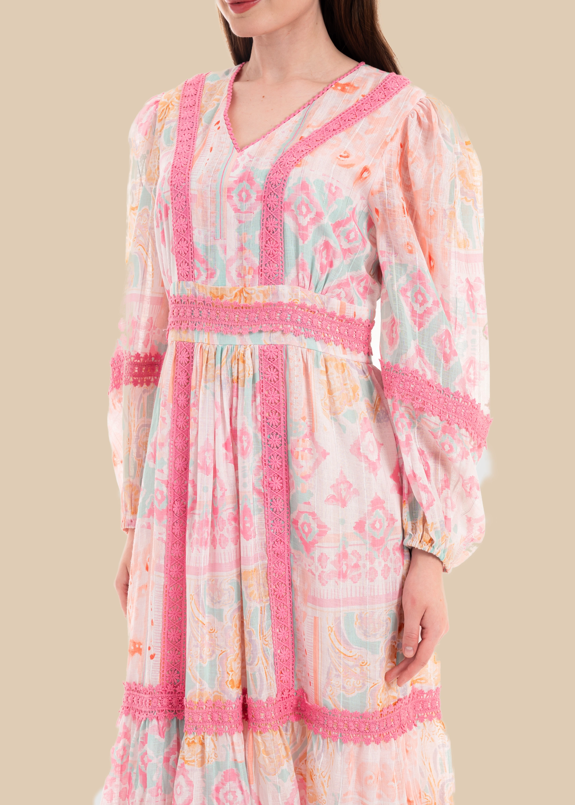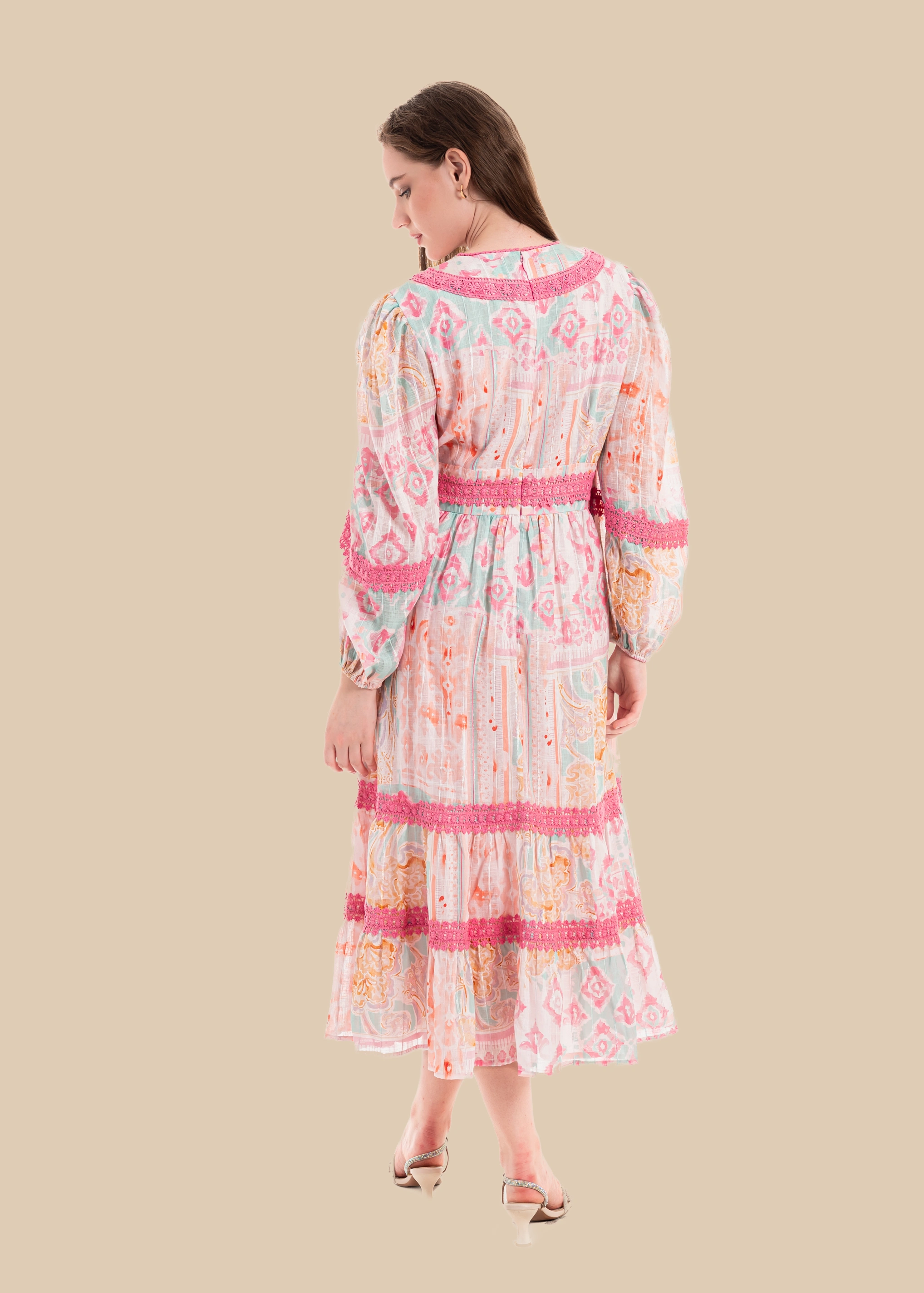 Salsabeel — A Song of Grace Flowing like the whispers of a hidden spring, Salsabeel embodies purity and elegance. Crafted from a soft, breathable poly-linen blend, this long-sleeve modest dress drapes effortlessly, carrying the delicate touch of nature itself. Its spring water color print ripples across the fabric like reflections on a serene river, while intricate lace patches and decorations trace pathways of timeless beauty. Designed with refined elegance and quiet grandeur, Salsabeel is a garment where modesty meets the poetry of nature.