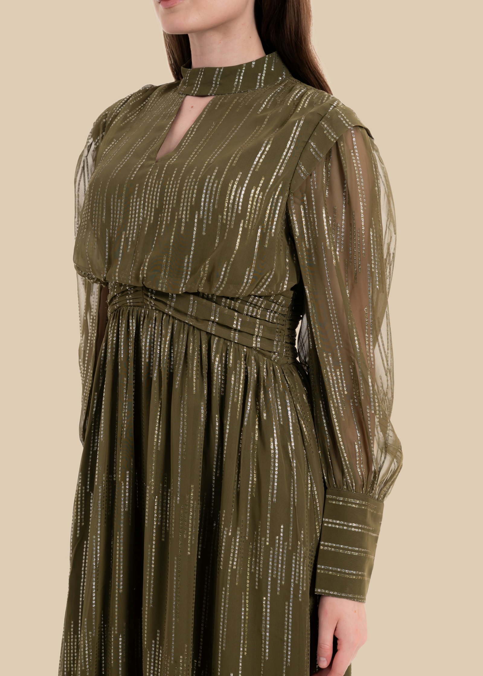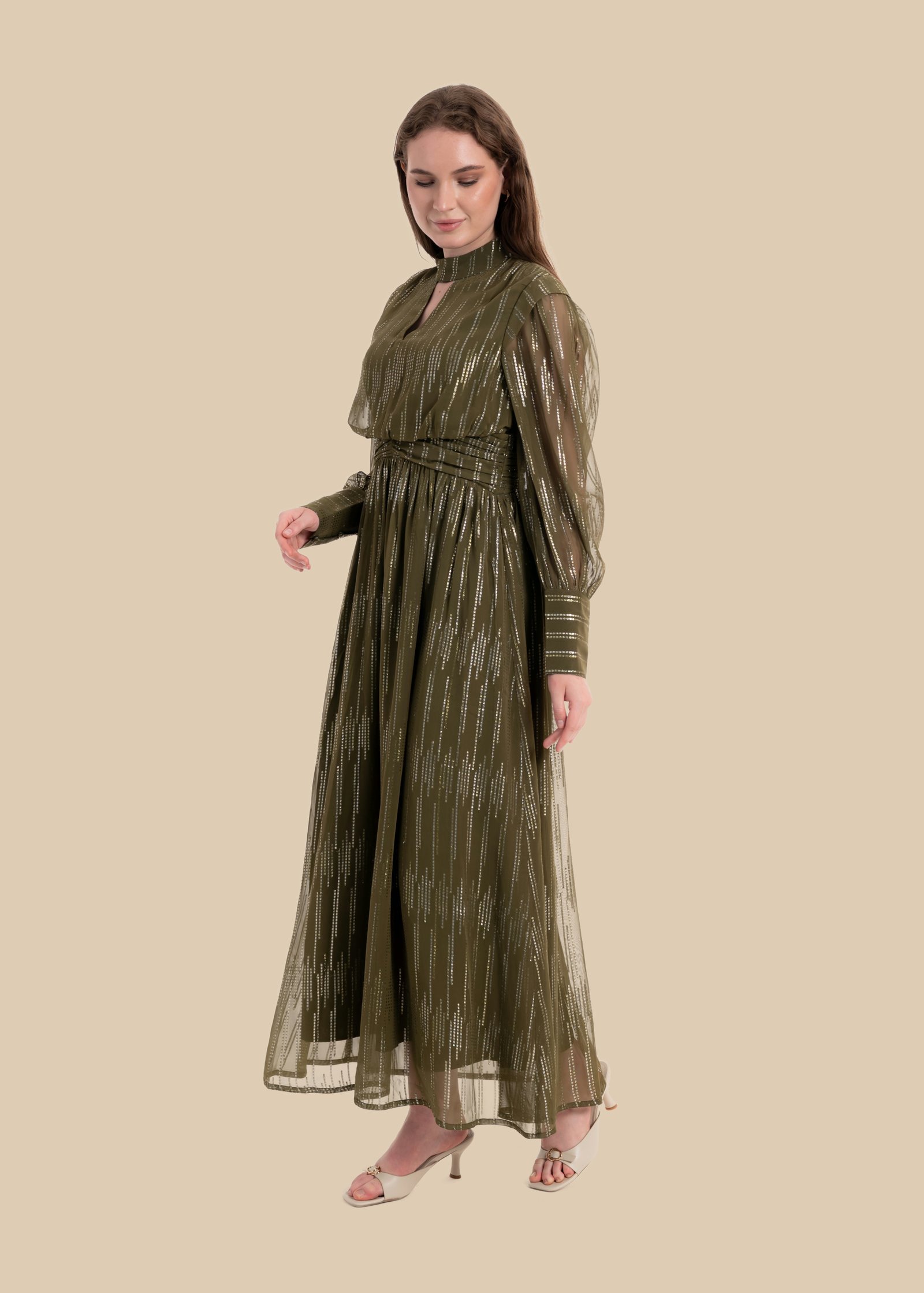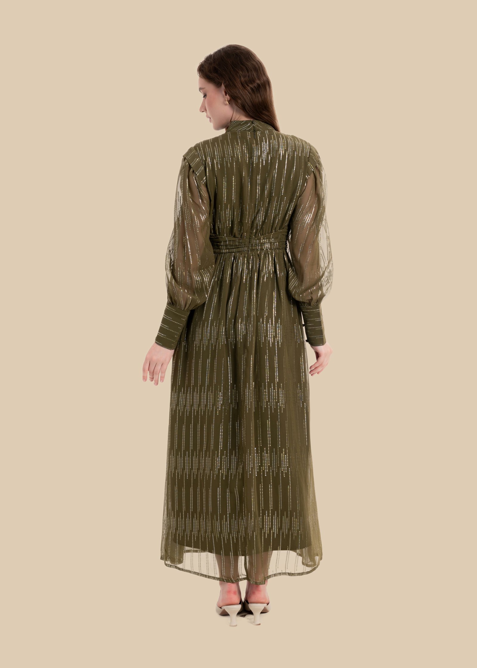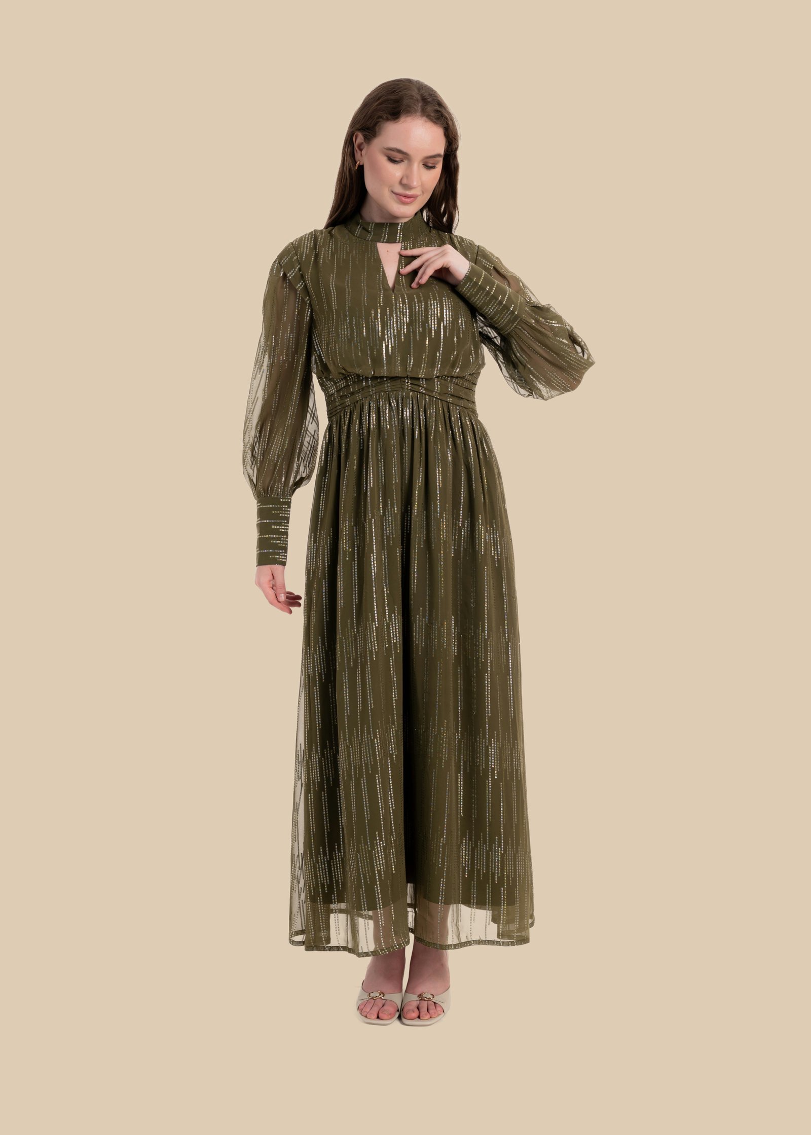 A shimmer of silver threads dances across the Selva Dress, a modest beauty woven for grace. Its fitted waist and high neckline, touched with a delicate keyhole, shape an air of quiet elegance. fitted cuff sleeves, a flowing silhouette, and a side zipper for the perfect fit, Selva moves like a whispered dream — refined, radiant, and free.
