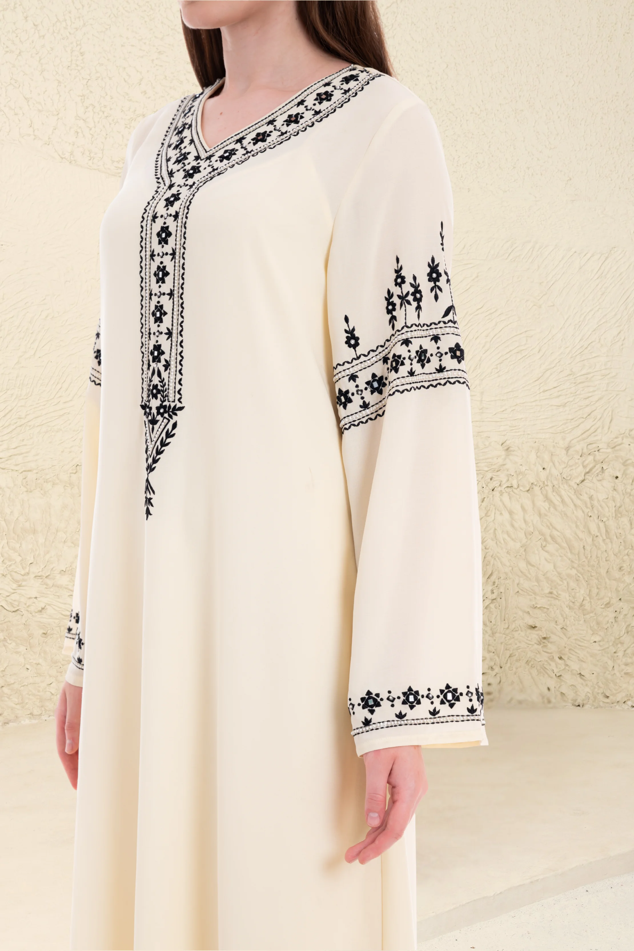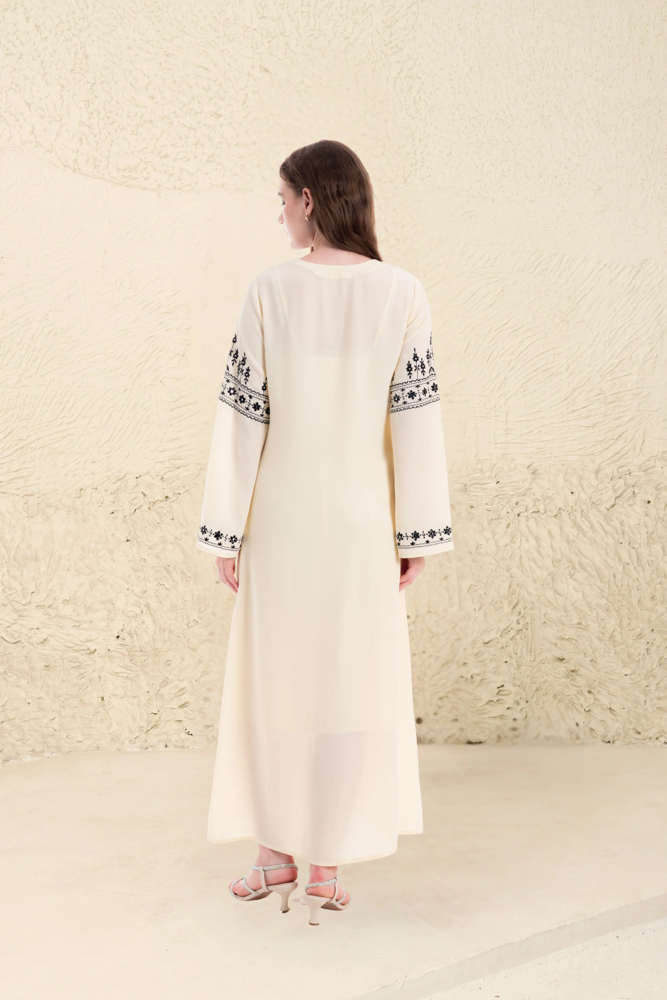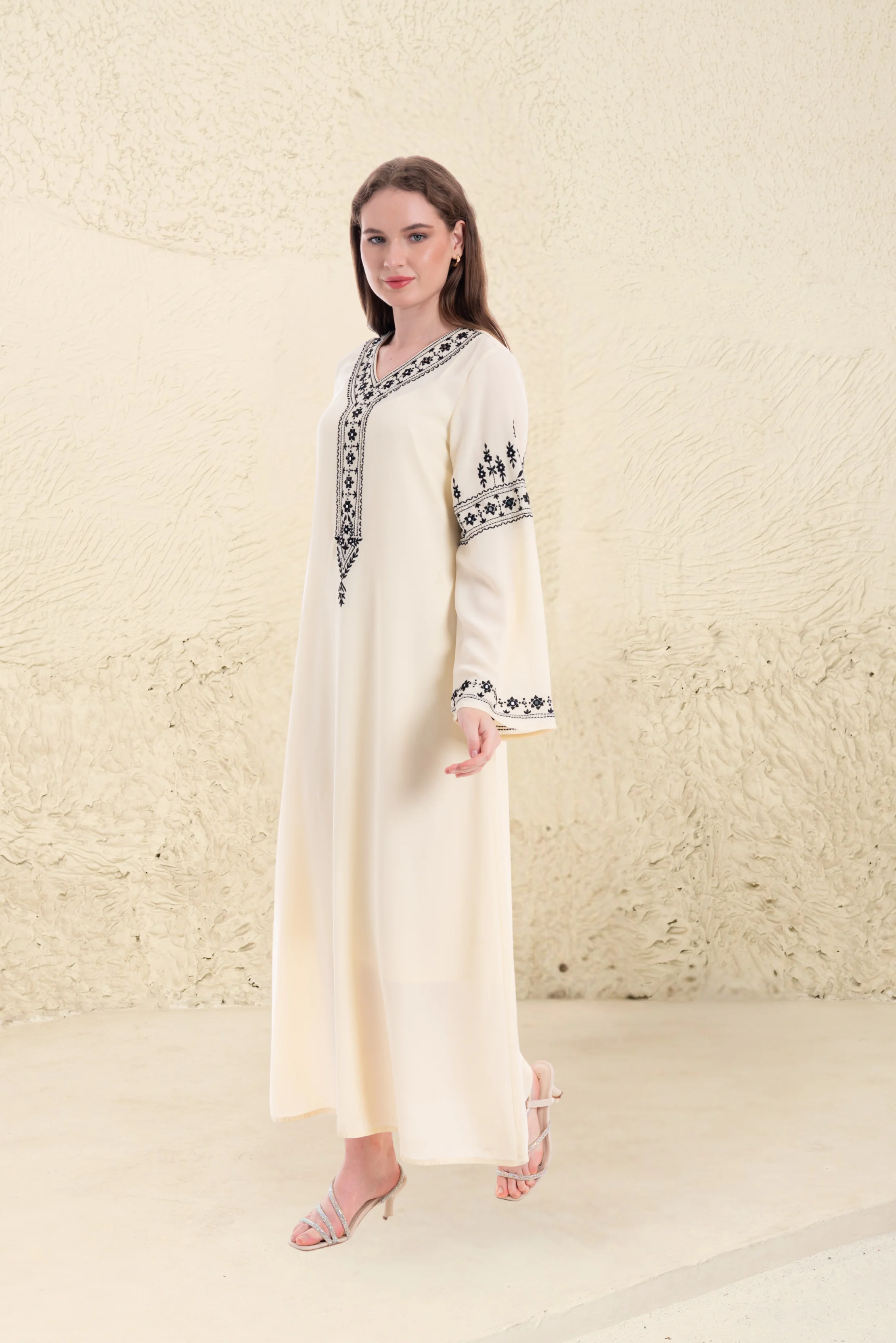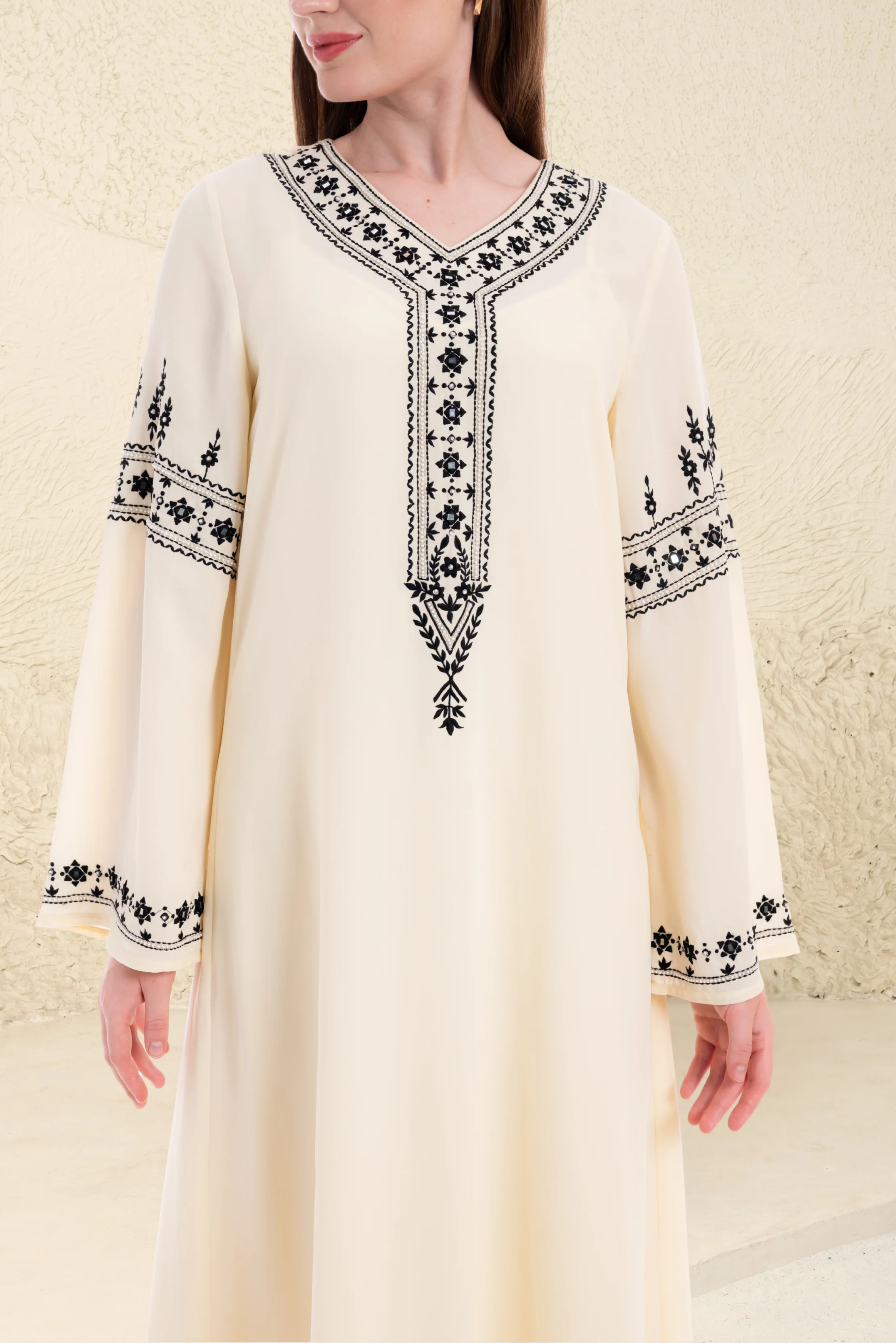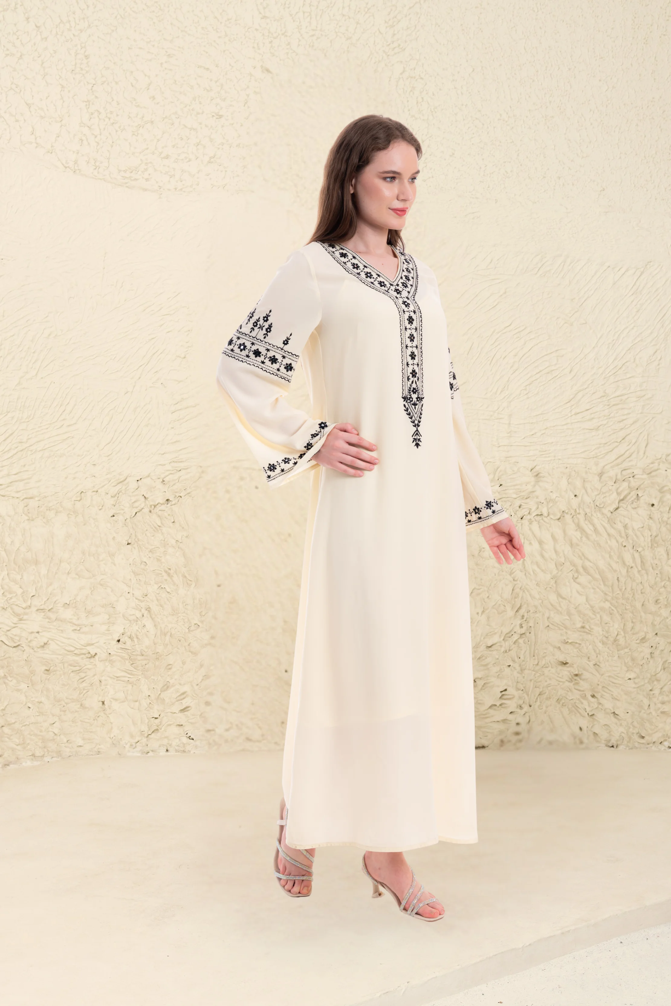Noor Jalabiya Dress Bathed in soft pastel yellow, the Noor Jalabiya dances with light. Black threadwork weaves quiet stories, while mirror accents catch every gleam. Flowy poly fabric, stitched with precision and finished to perfection, Makes it a luminous choice for night outs, paired with Sheilas in harmonizing hues.