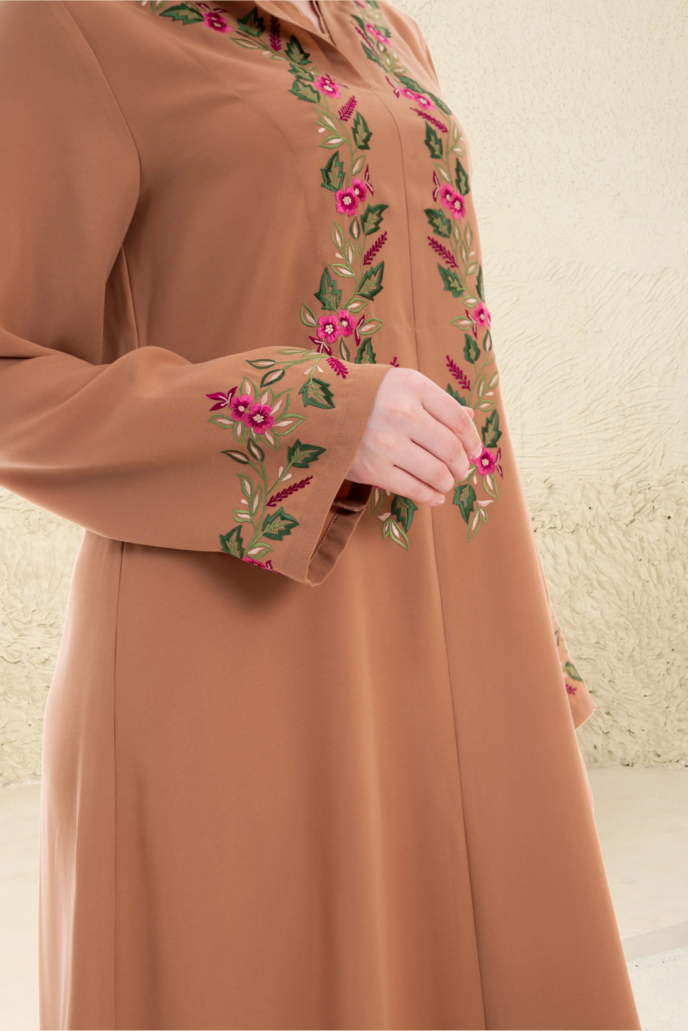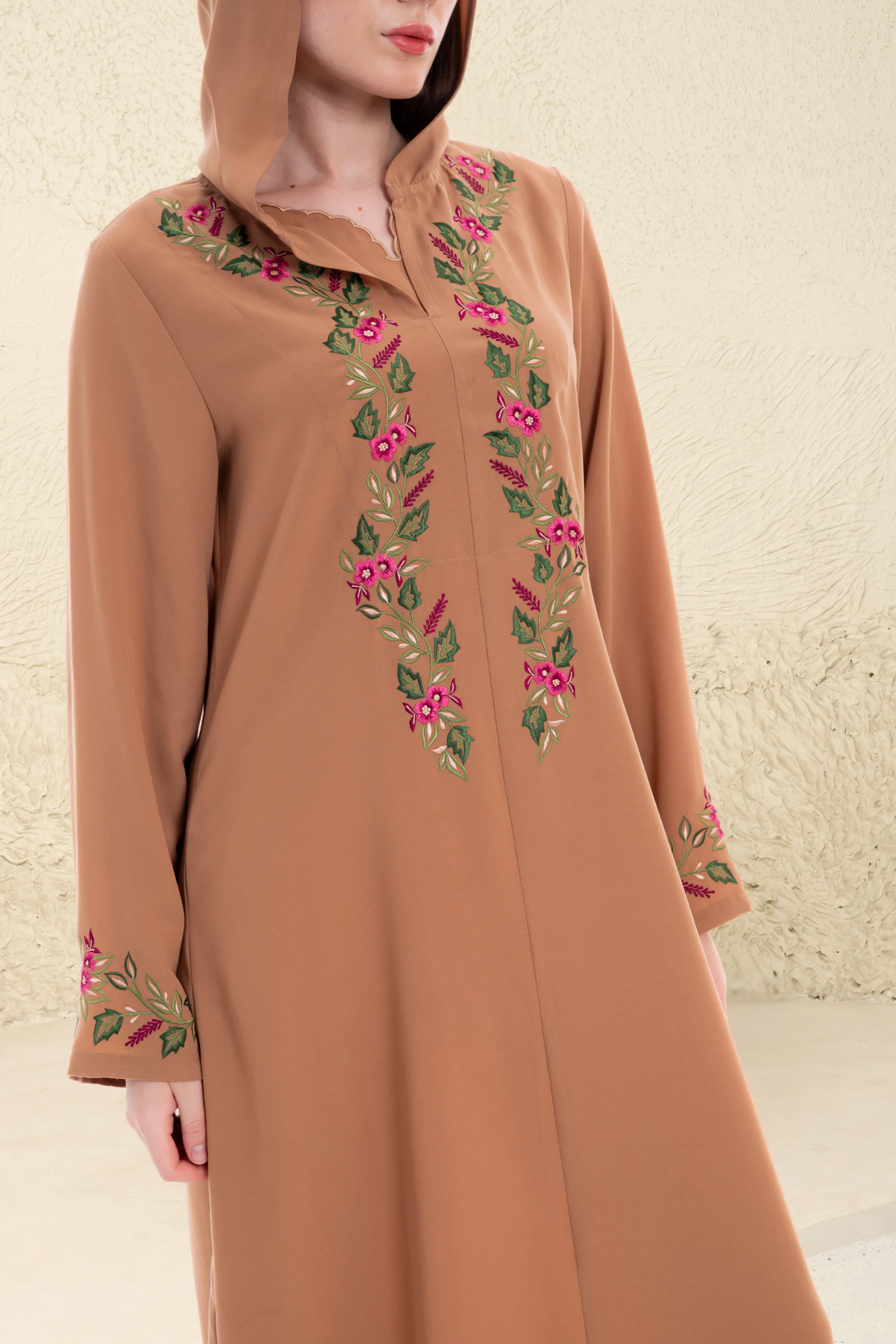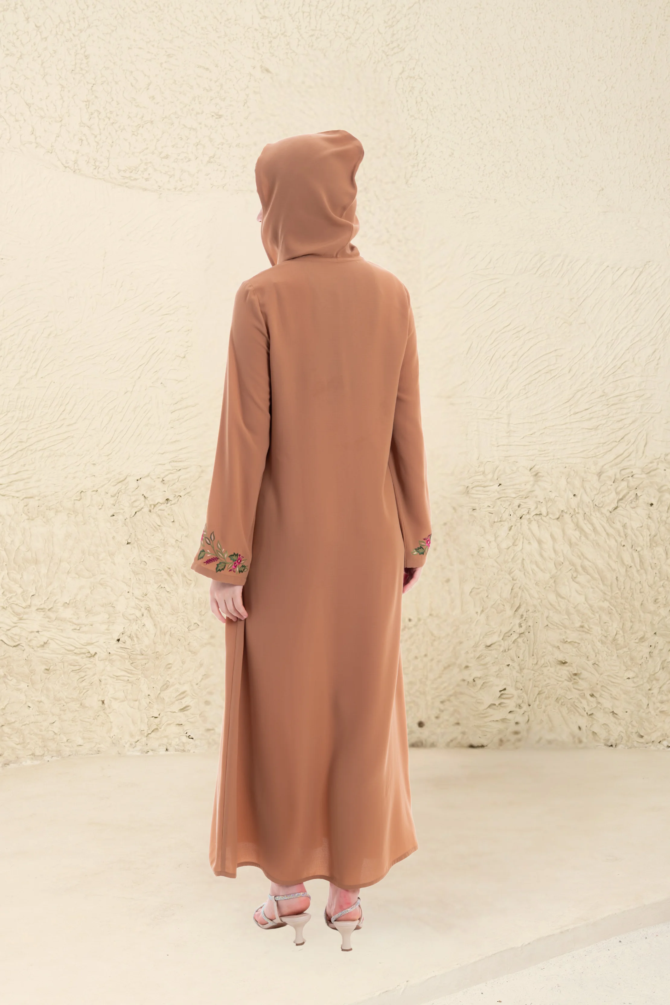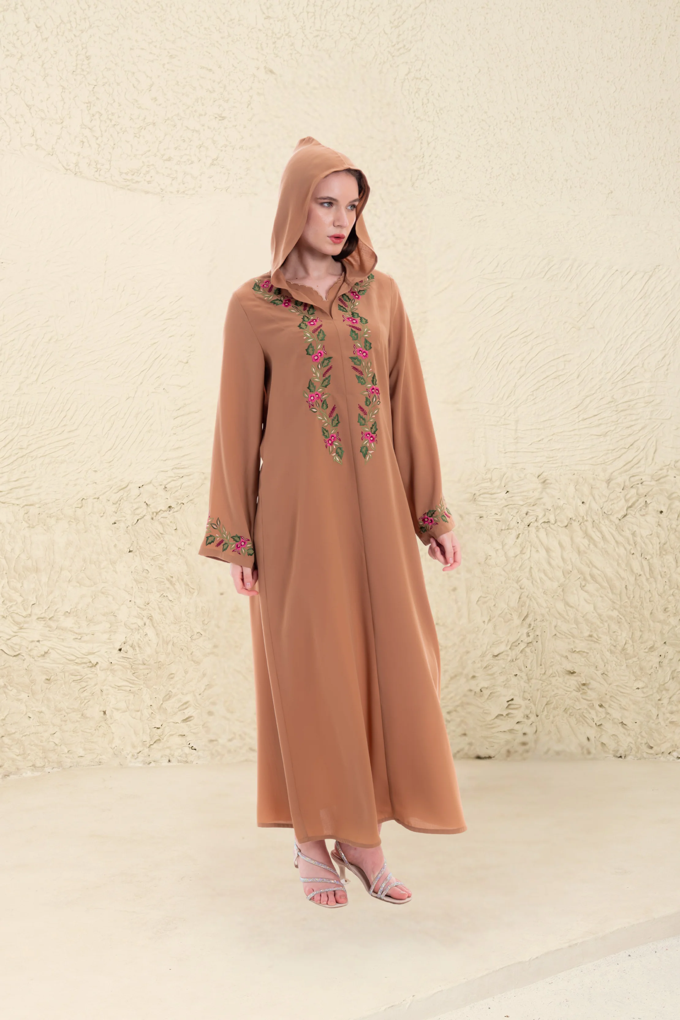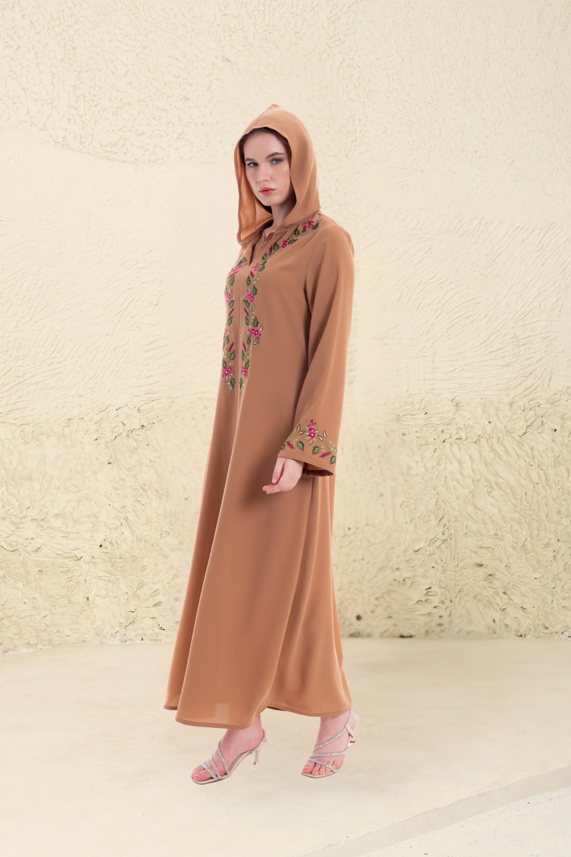 Zayna Jalabiya In the warm glow of antique copper, the  Jalabiya drapes like a whispered promise, woven from luxurious Nida fabric. Delicate vinca blossoms, handpicked and richly embroidered, scatter across its folds, each stitch a note of timeless beauty. Topped with a graceful hood, Zayna blends the soul of Arabic tradition with the spirit of modern elegance — a modest masterpiece where fashion and poetry move as one.