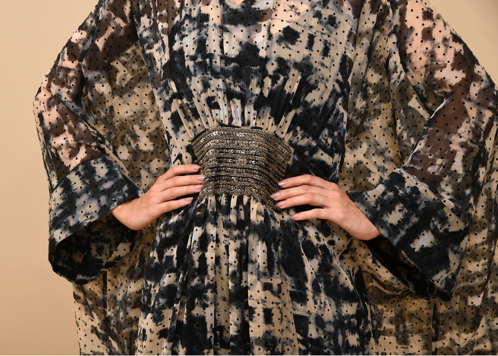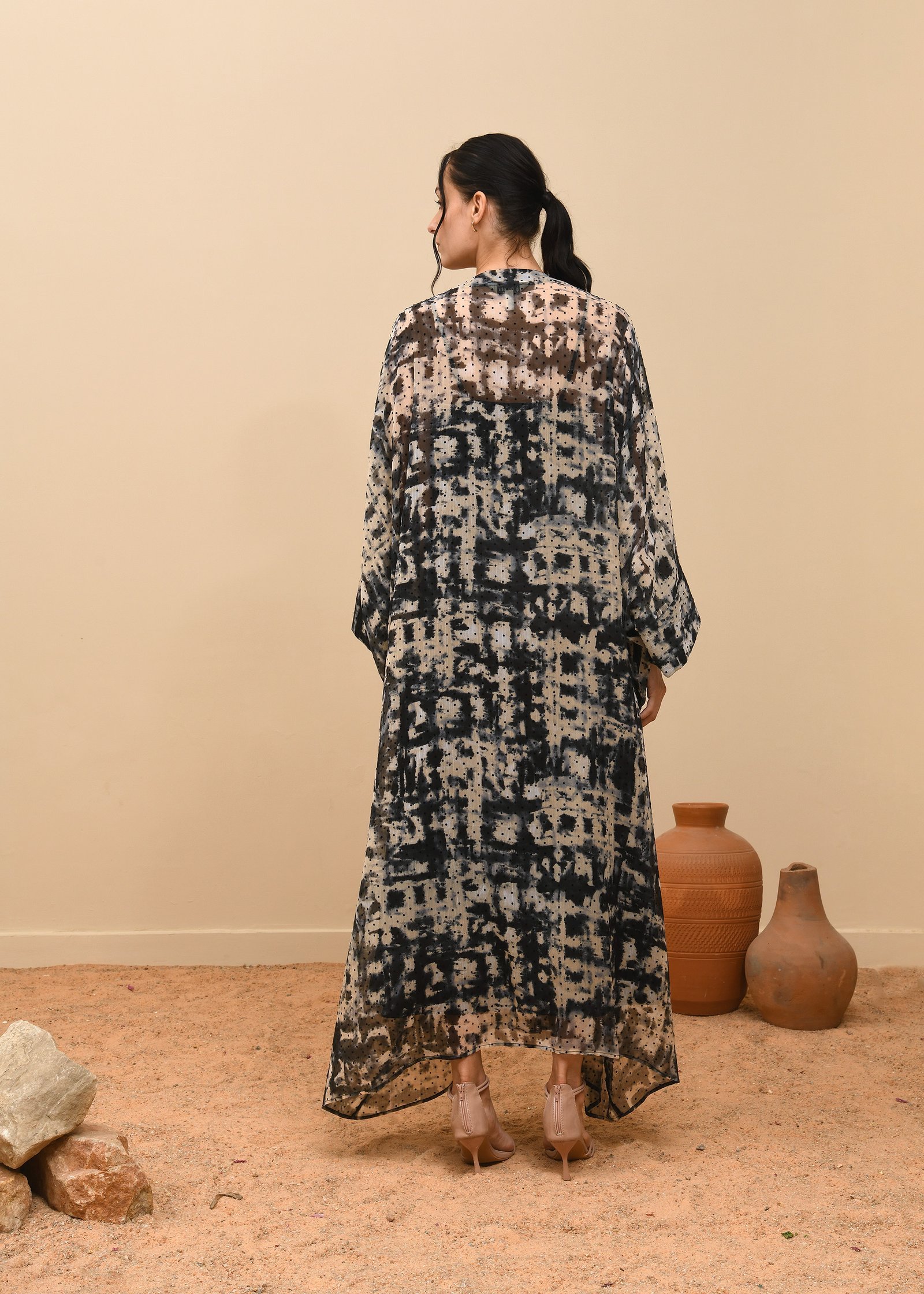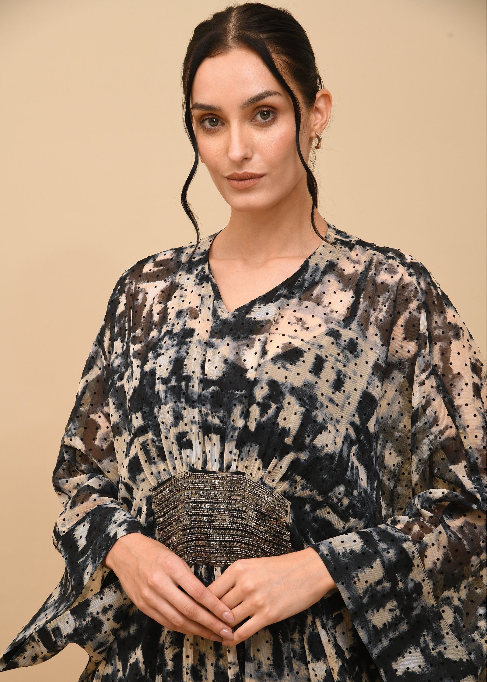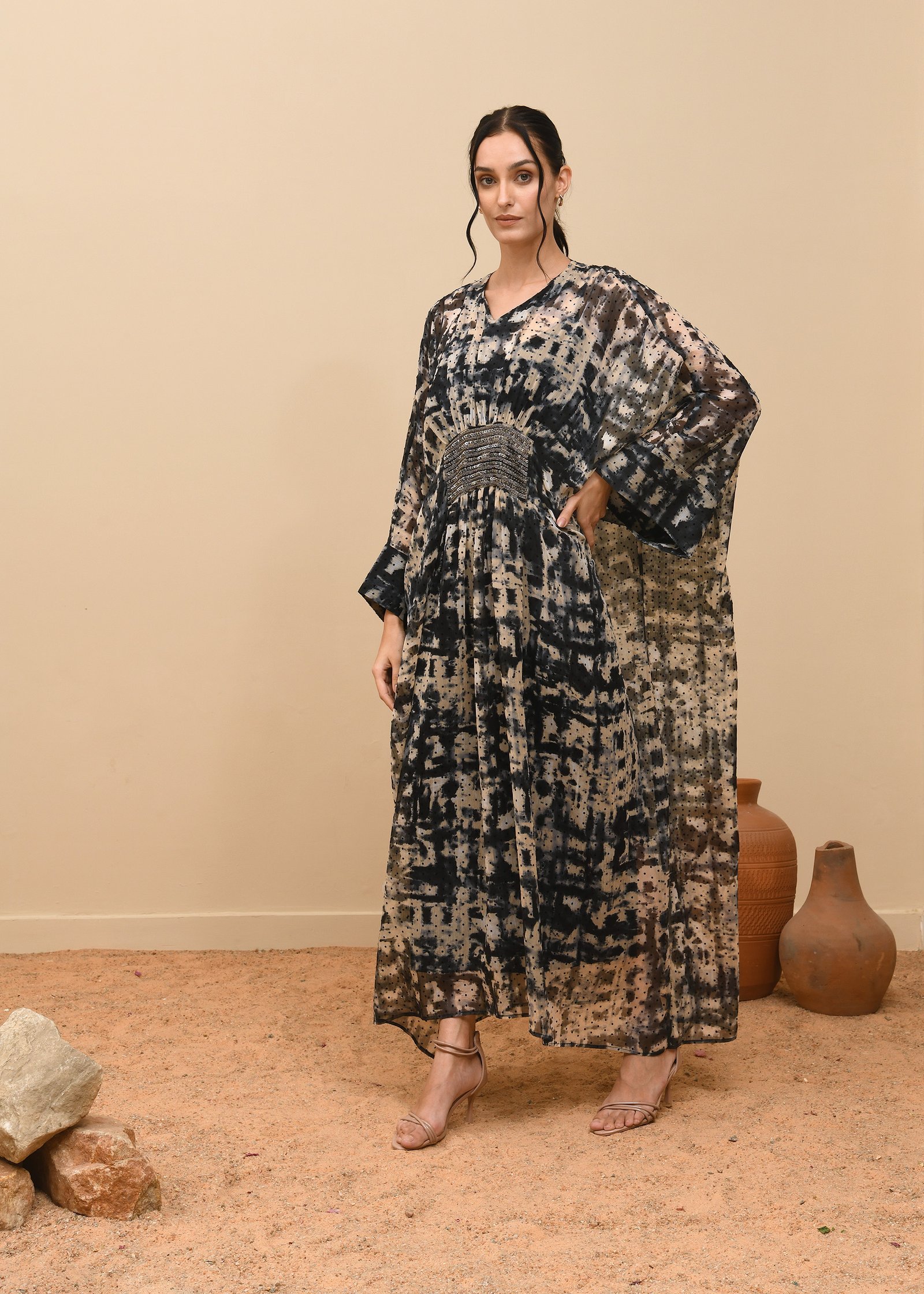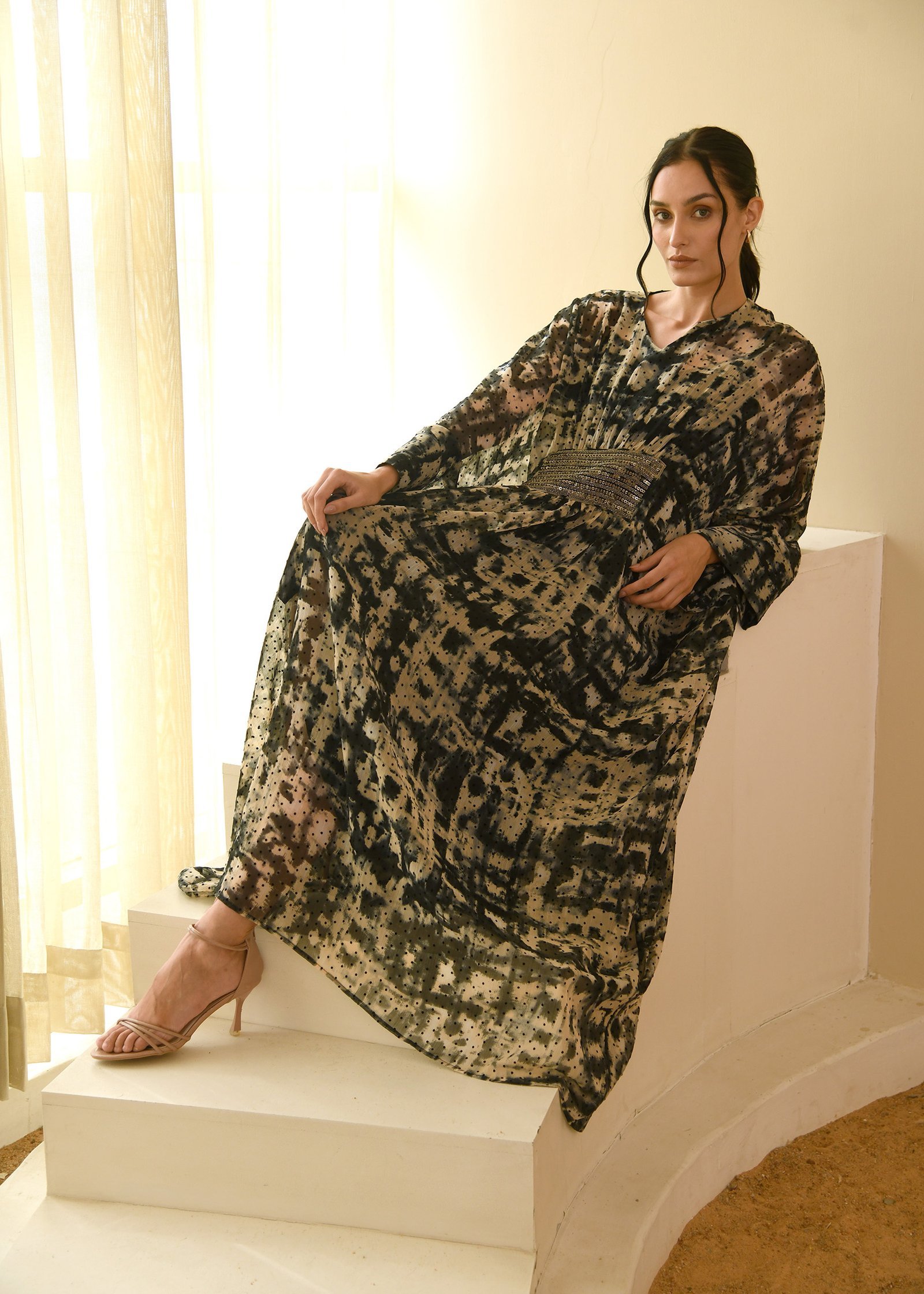 Noctume Kaftan Elegance meets mystery in the Nocturne Kaftan, featuring a rich black and brown burnout print that evokes depth and drama. This flowy silhouette is adorned with intricate, shiny handwork embroidery that adds a touch of opulence and artisanal charm. Perfect for evening soirées or festive gatherings, the kaftan blends comfort with elevated style, making it a standout piece in any wardrob